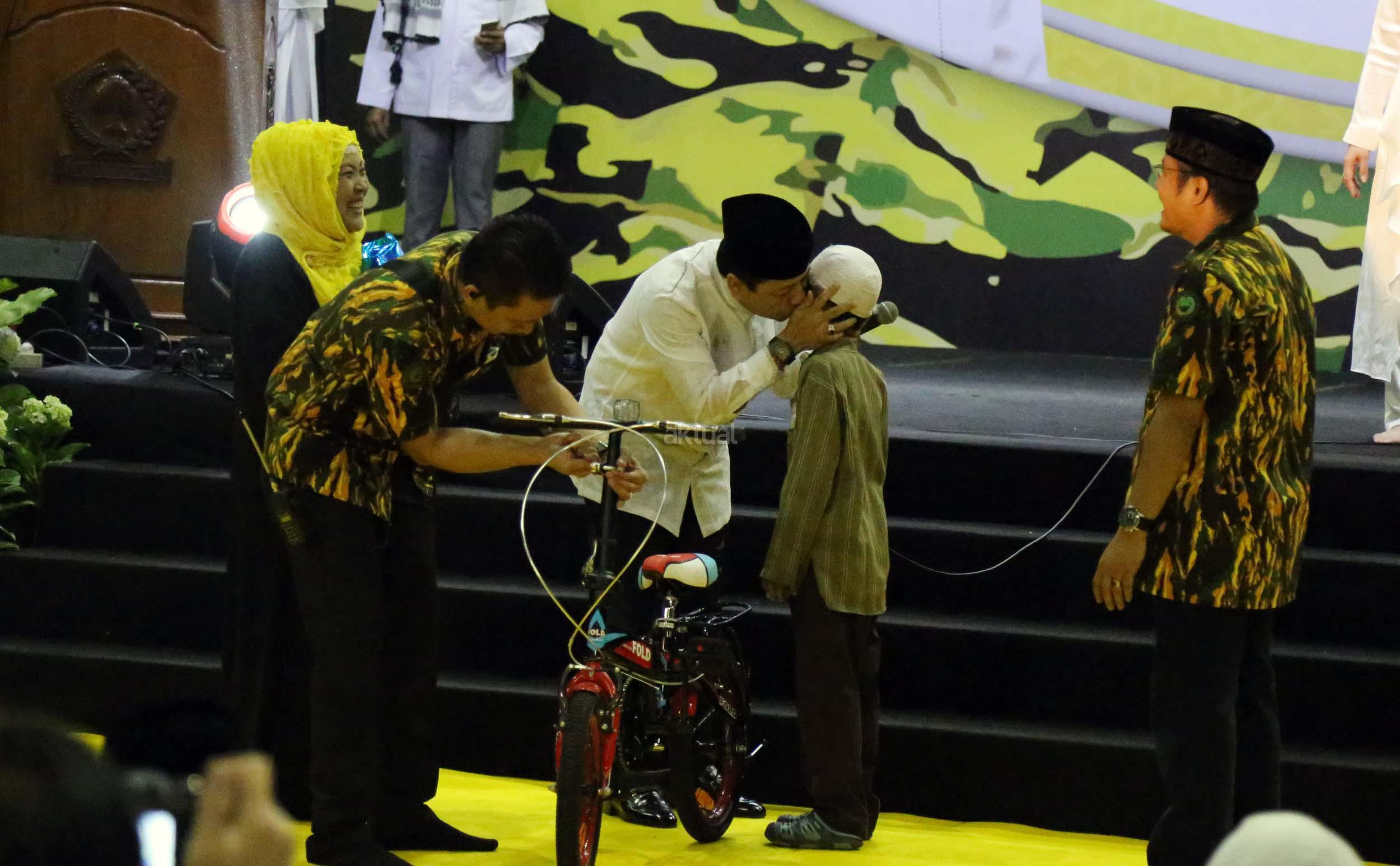 Ketua Umum Partai Golkar Setyanovanto memberikan hadiah sepeda kepada dua orang anak yatim dalam acara buka bersama Angkatan Muda Partai Golkar (AMPG) di Istora Senayan, Jakarta, Sabtu (18/6/2016). Acara buka bersama Angkatan Muda Partai Golkar yang dihadiri 26000 anak Yatim Piatu dan kamum Dhuafa.
