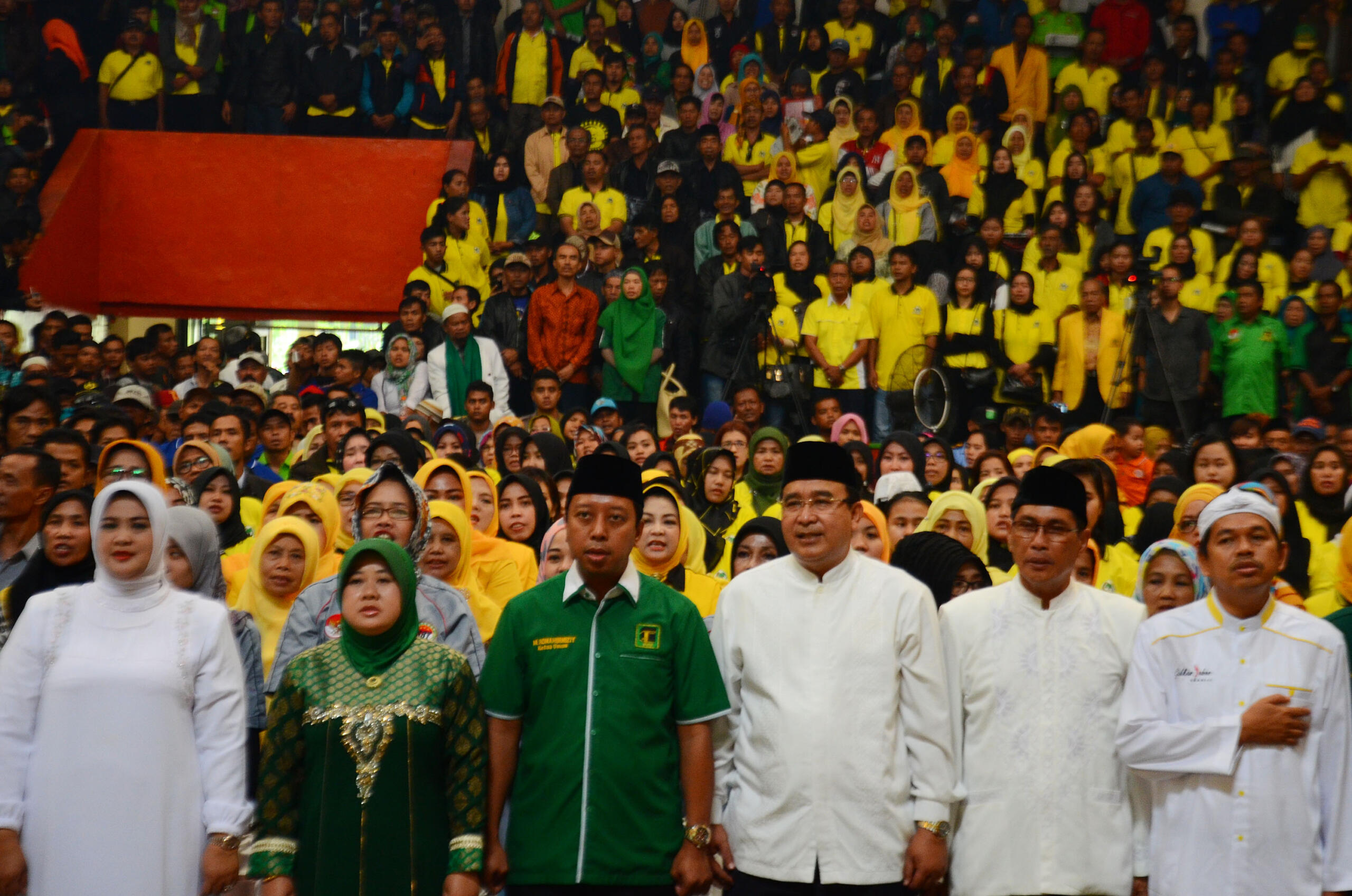 Ketua Umum PPP Romahurmuziy (ketiga kiri), Bakal Calon Walikota Tasikmalaya Budi Budiman (ketiga kanan) berserta wakilnya Muhamad Yusuf (kedua kanan) dan Ketua DPD Partai Golkar Jawa Barat Dedi Mulyadi (kanan) menghadiri acara deklarasi pasangan Calon Pilkada 2017 di Gelanggang Olahraga Sukapura, Dadaha, Kota Tasikmalaya, Jawa Barat, Sabtu (13/8). PPP dan Partai Golkar mengusung pasangan Budi Budiman dan Muhamad Yusuf di Pilkada seretak 2017, dimana Budi merupakan Wali Kota Tasikmalaya saat ini, sedangkan Yusuf adalah mantan birokrat di Pemkab Tasikmalaya. ANTARA FOTO/Adeng Bustomi/aww/16.