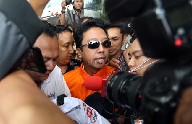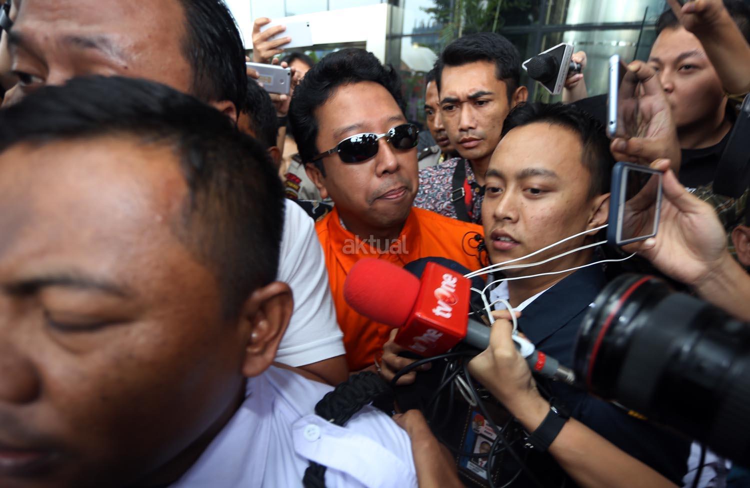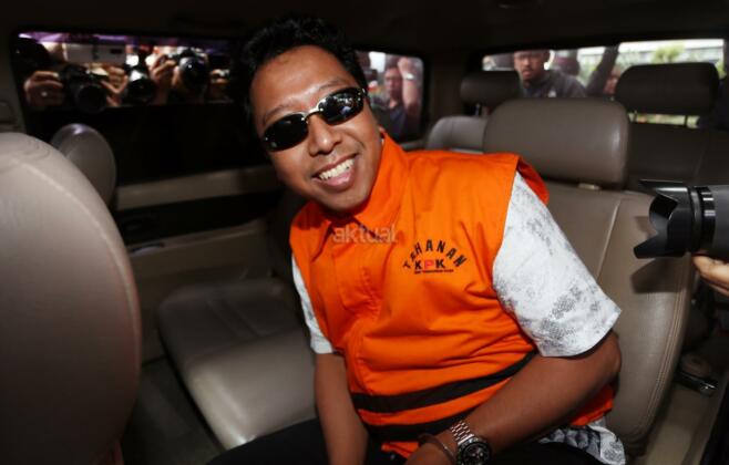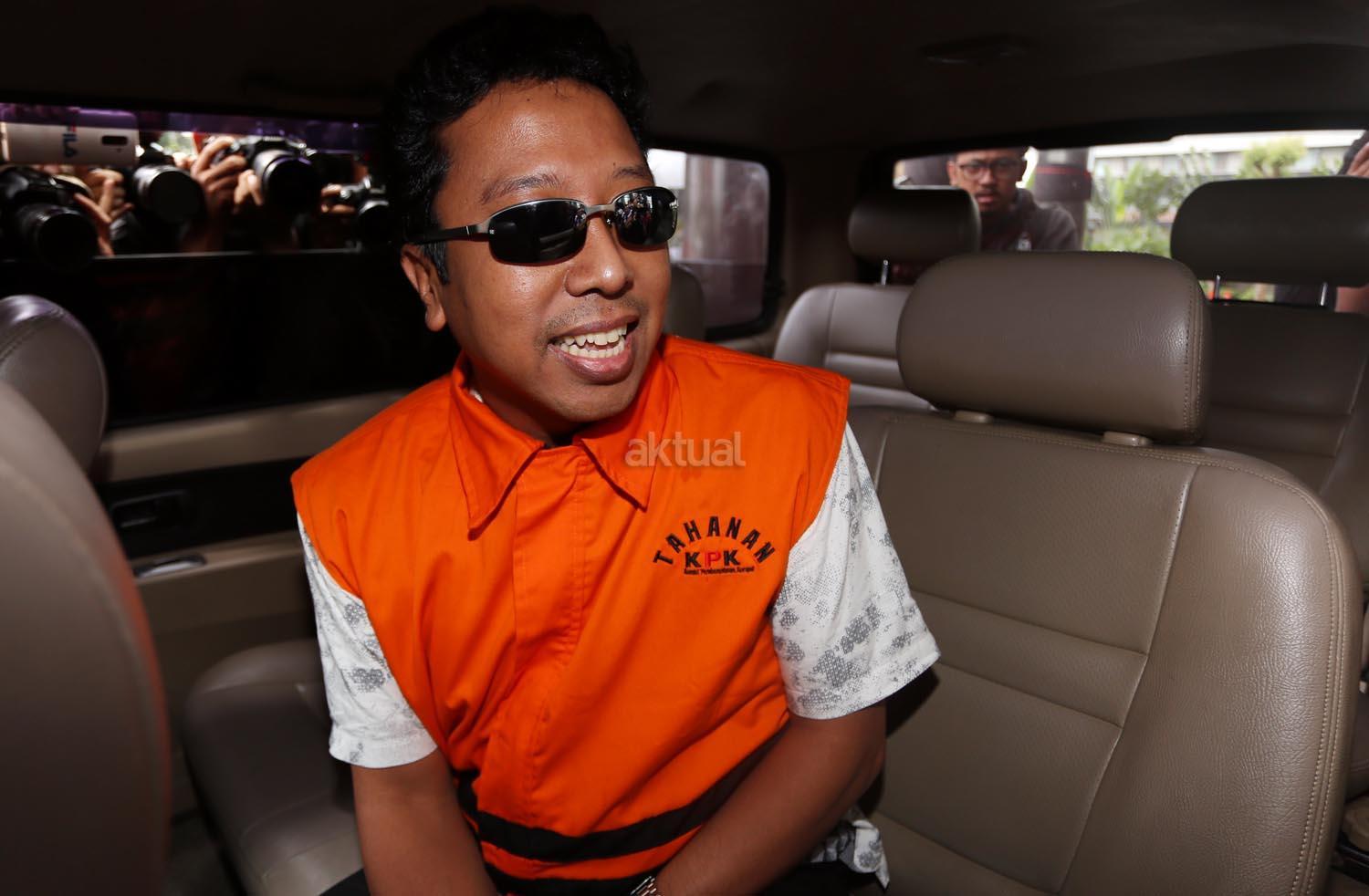 Ketum PPP Romahurmuziy mengenakan rompi tahanan seusai menjalani pemeriksaan di gedung KPK, Jakarta, Sabtu (16/3/2019). Ketum PPP Romahurmuziy bersama Kepala Kantor Kemenag Kabupaten Gresik Muhammad Muafaq Wirahadi dan Kakanwil Kemenang Jawa Timur Haris Hasanuddin ditetapkan sebagai tersangka kasus dugaan suap terkait seleksi pengisian jabatan pimpinan tinggi di Kementerian Agama (Kemenag). AKTUAL/Tino Oktaviano