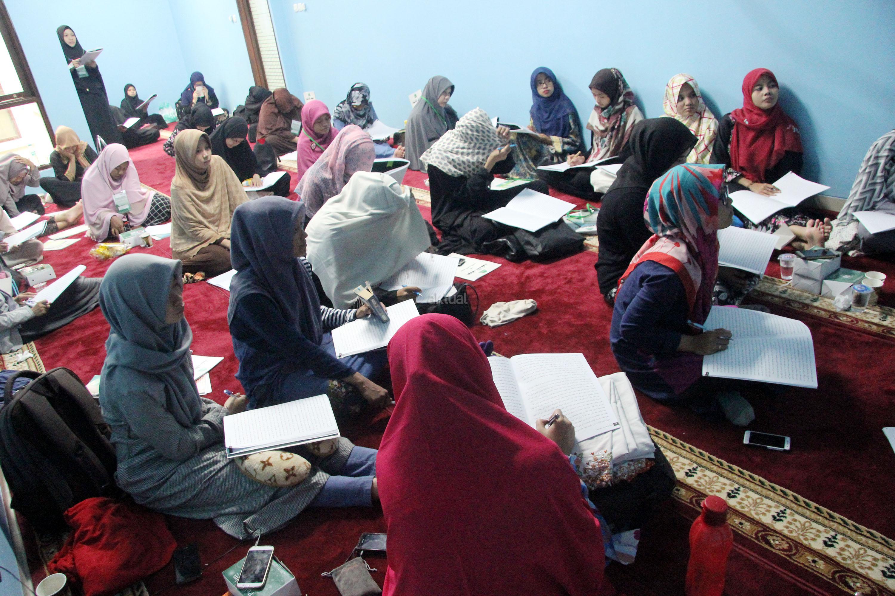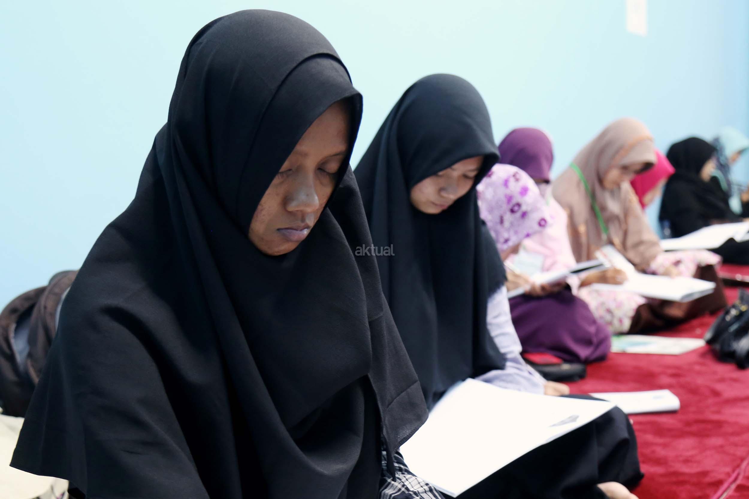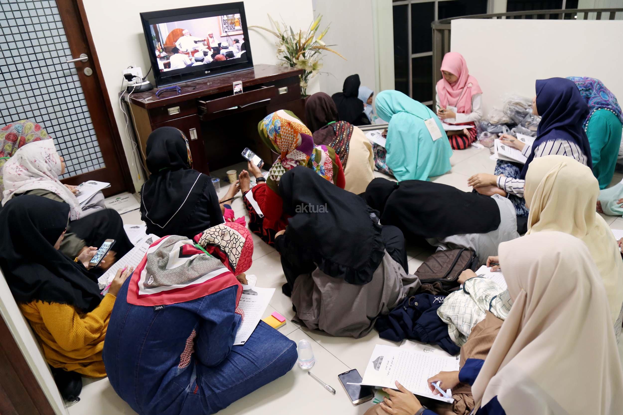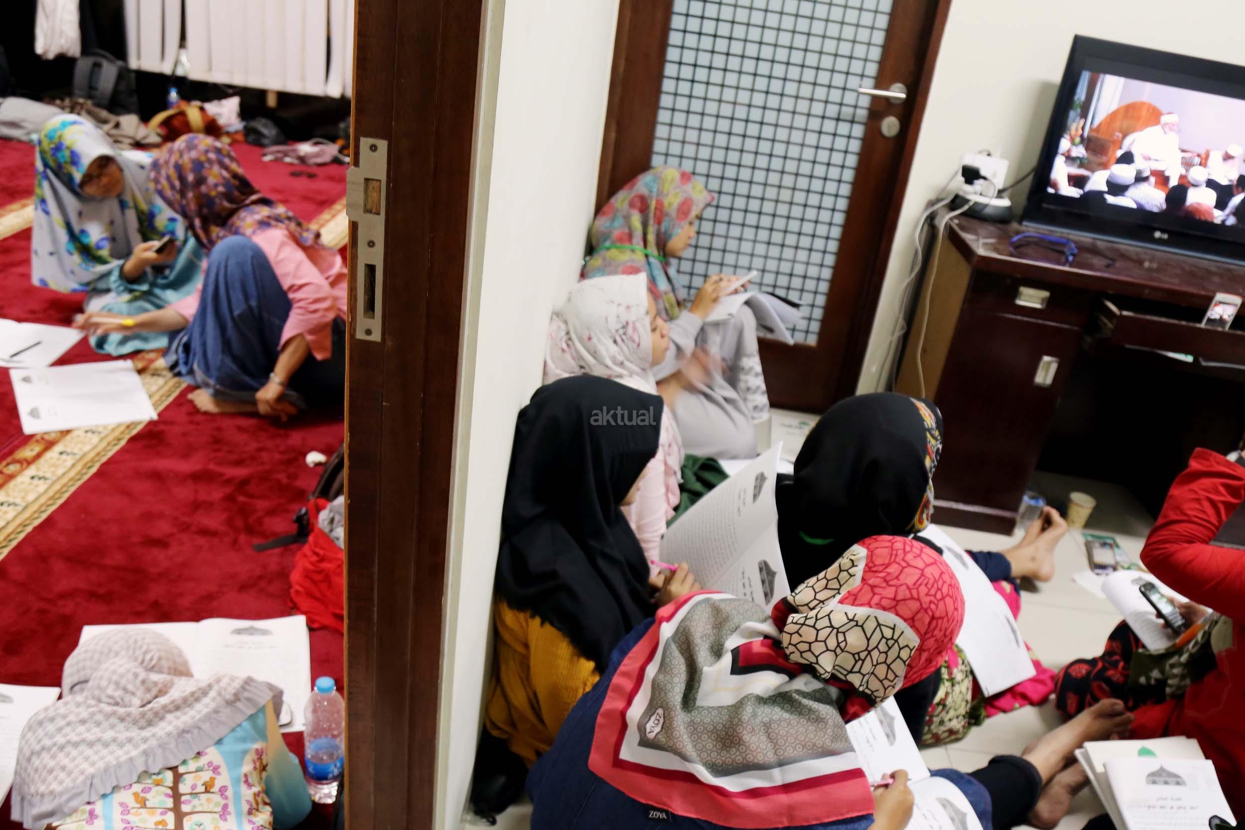 Peserta akhwat mengikuti Talaqi Kitab It’haf bersama Maulana Syekh Yusri Rusydi dalam menyambut Maulid Akbar Baginda Nabi Muhammad SAW di Majelis Zawiyah Arraudah, Tebet, Jakarta Selatan, Sabtu (28/1/2017). Didalam pembacaan kitab amin al-I'lam bi anna attasawwuf min syariat al-islam Syekh Yusri menjelaskan ihwal sufi atau orang yang mendalami tasawwuf. AKTUAL/Nailin
