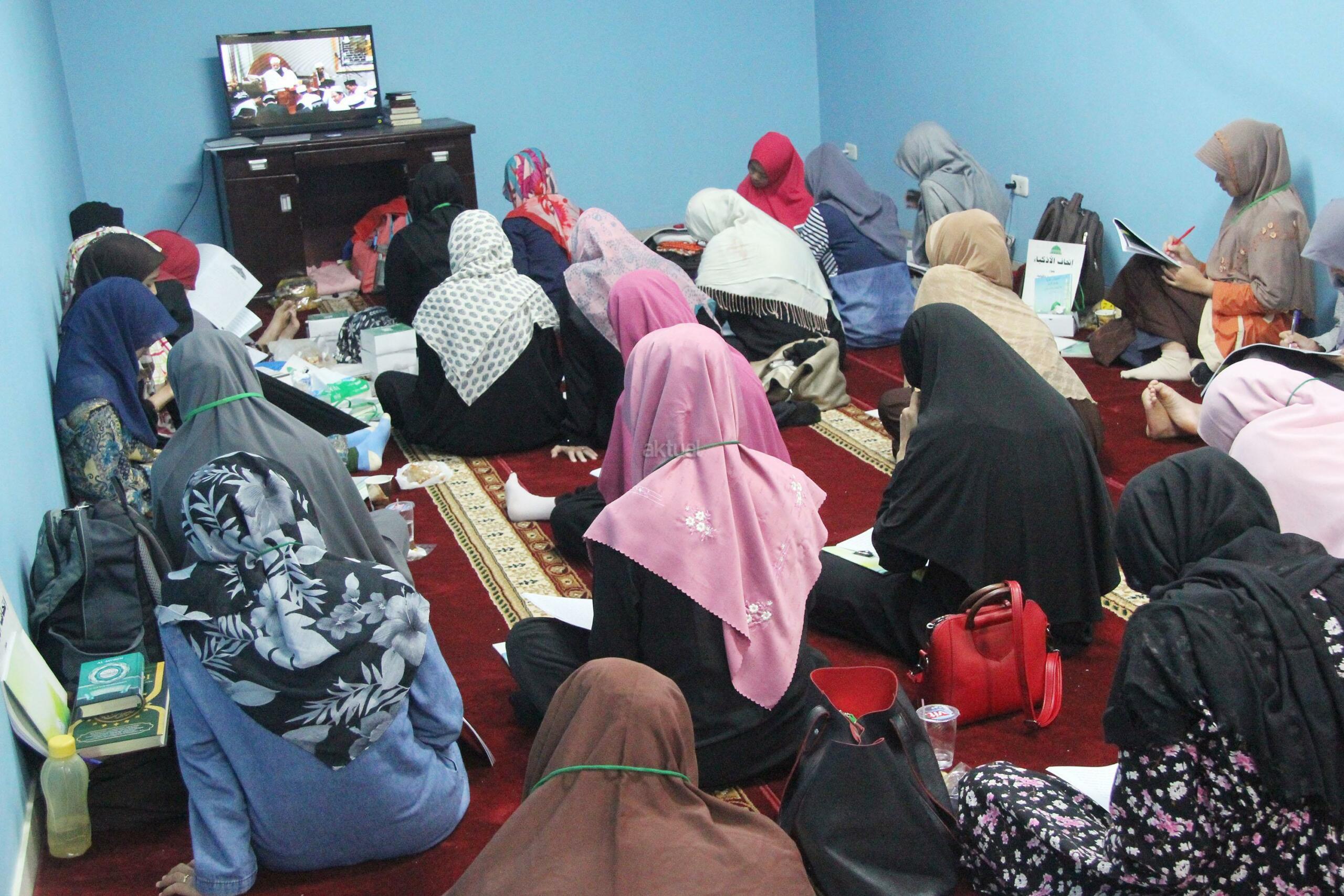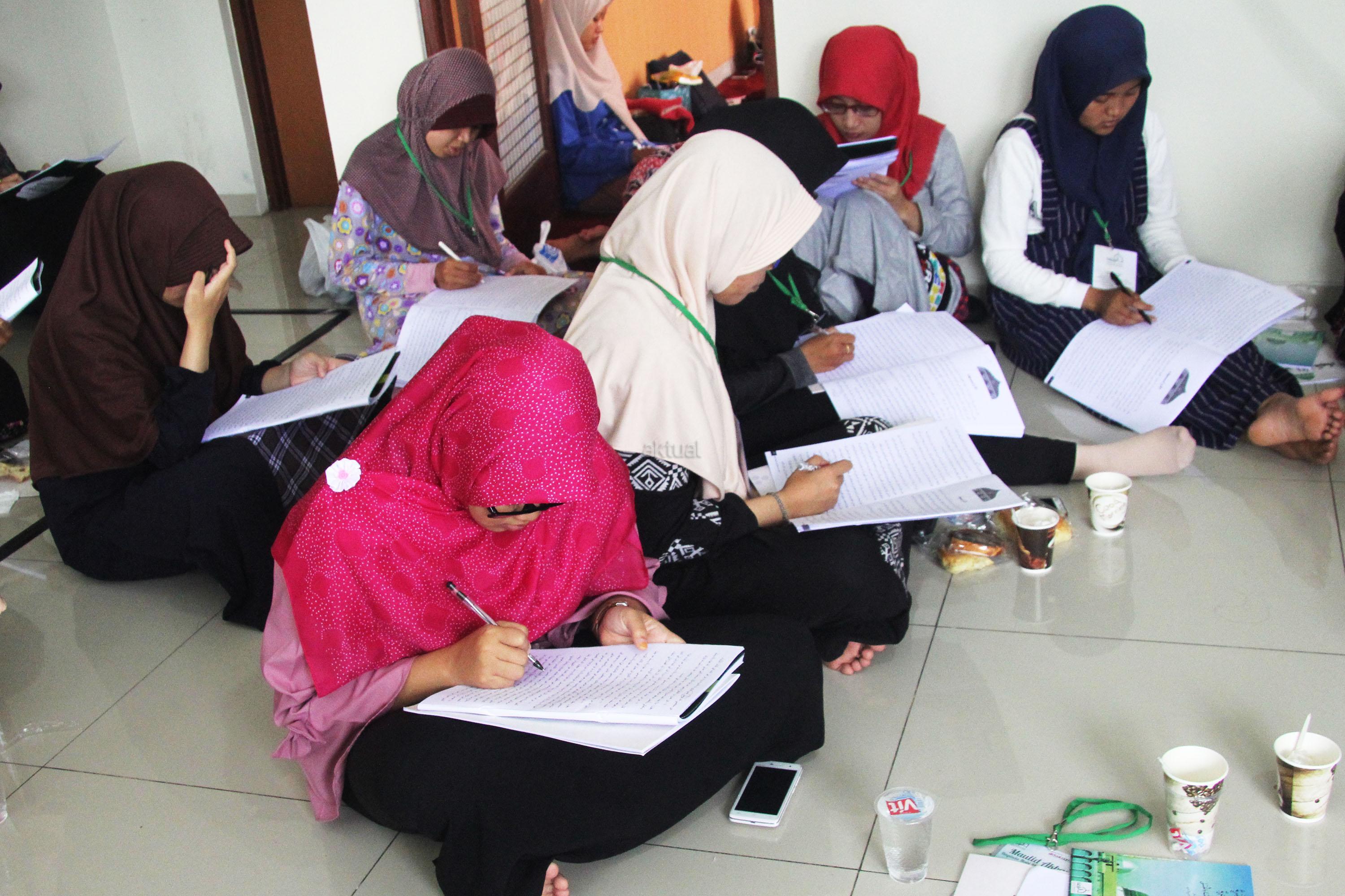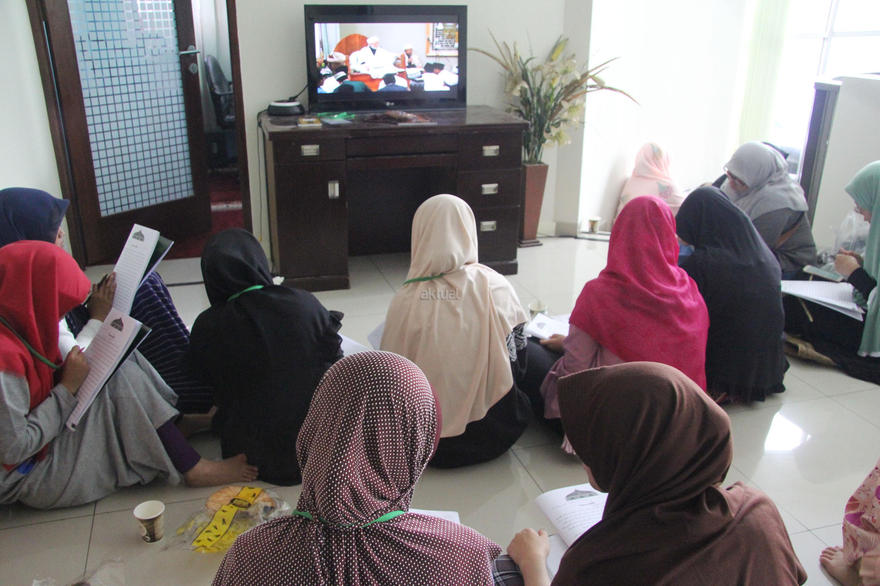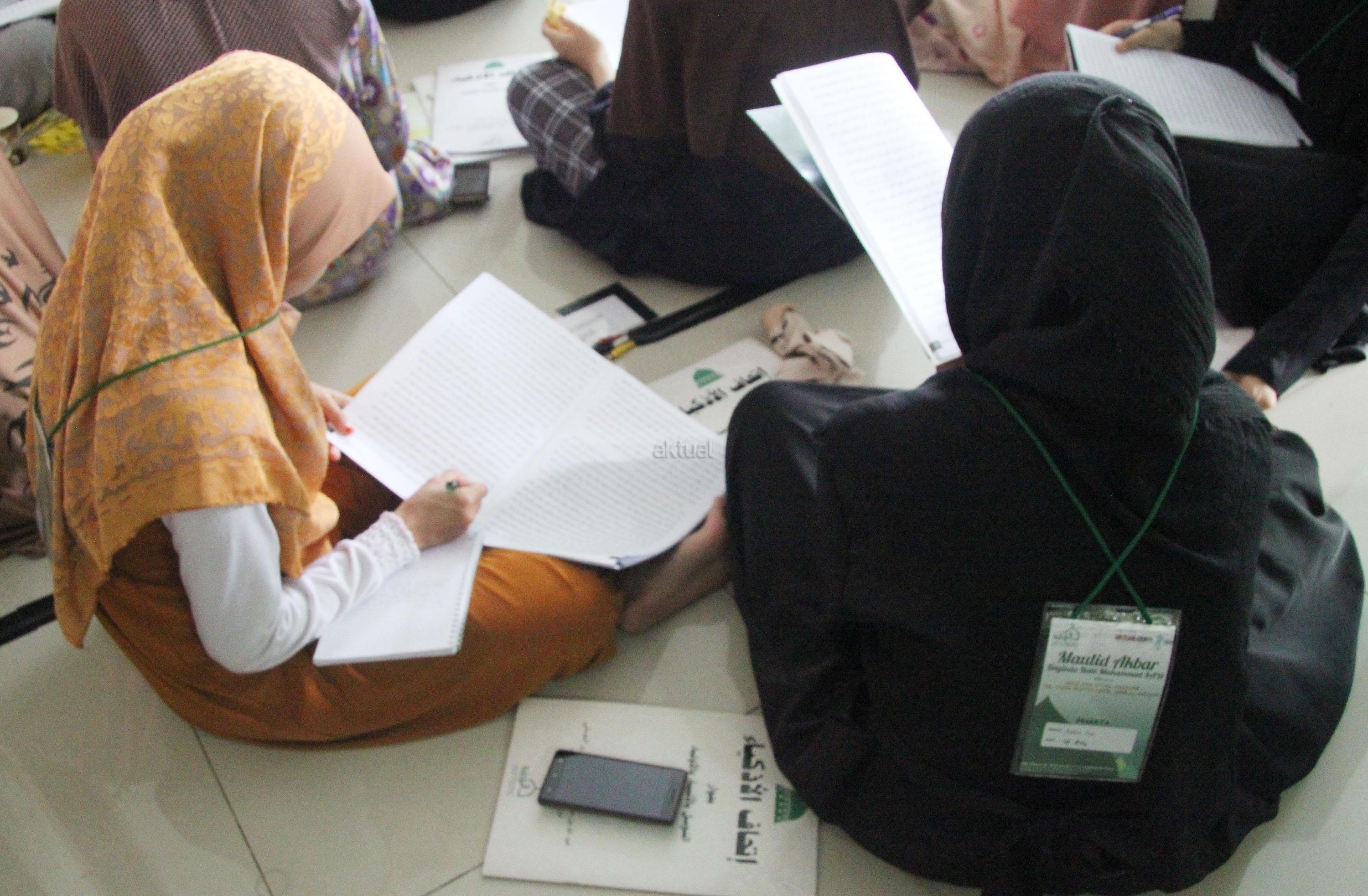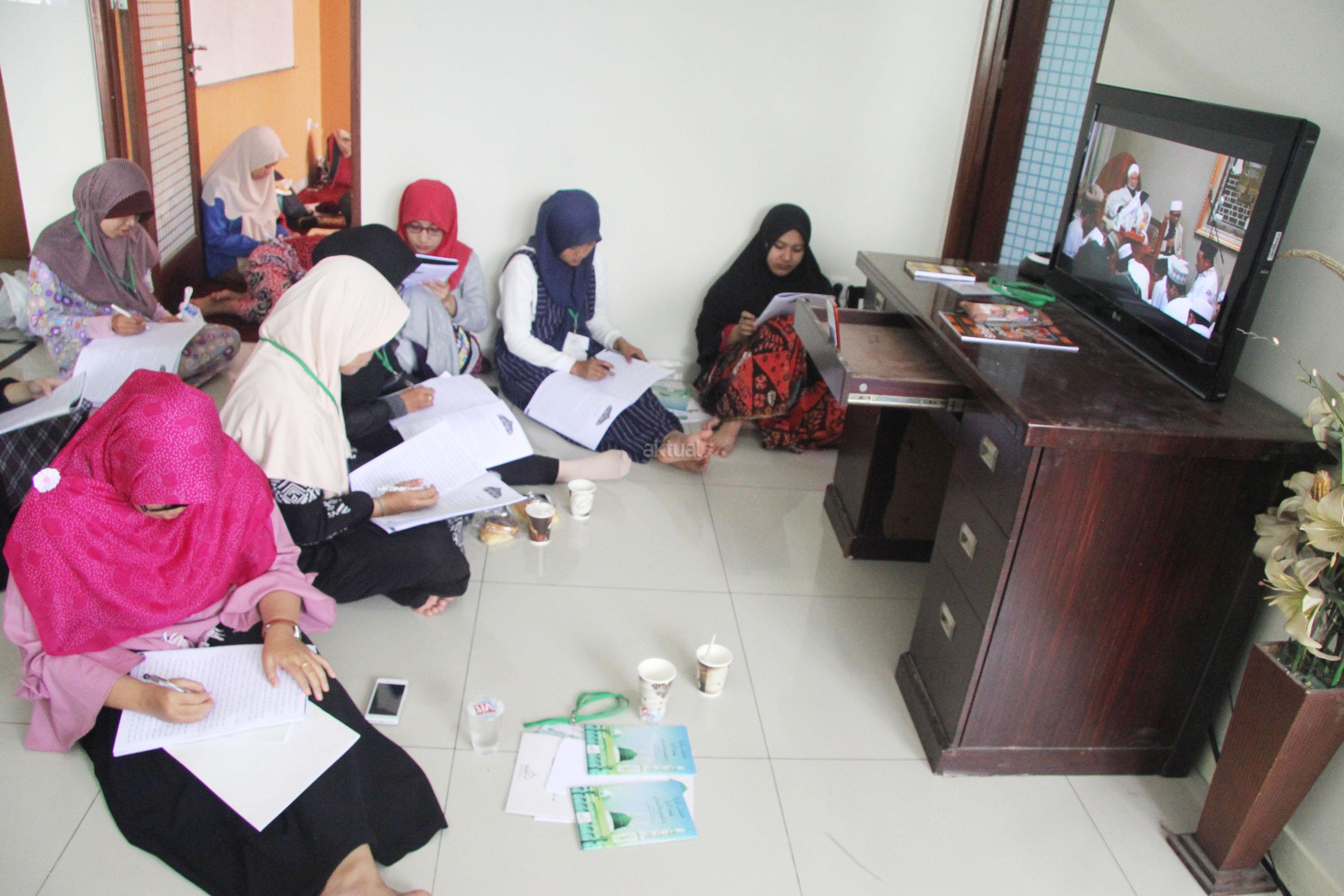 Peserta akhwat mengikuti Talaqi Kitab It’haf bersama Maulana Syekh Yusri Rusydi dalam menyambut Maulid Akbar Baginda Nabi Muhammad SAW di Majelis Zawiyah Arraudah, Tebet, Jakarta Selatan, Sabtu (28/1/2017). Didalam pembacaan kitab amin al-I’lam bi anna attasawwuf min syariat al-islam Syekh Yusri menjelaskan ihwal sufi atau orang yang mendalami tasawwuf. AKTUAL/Nailin