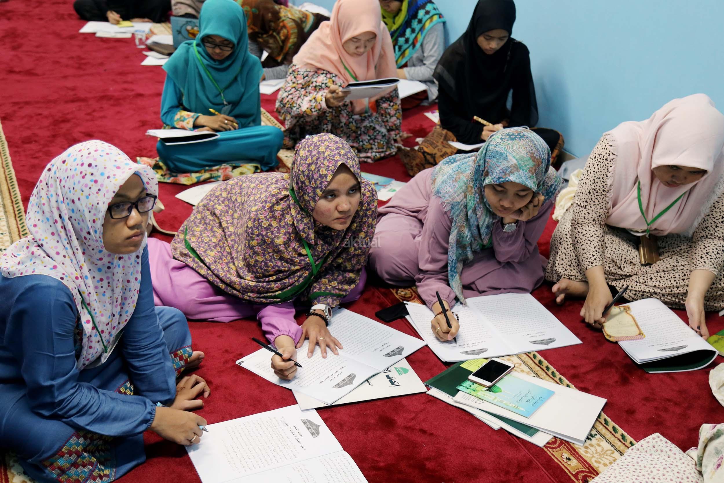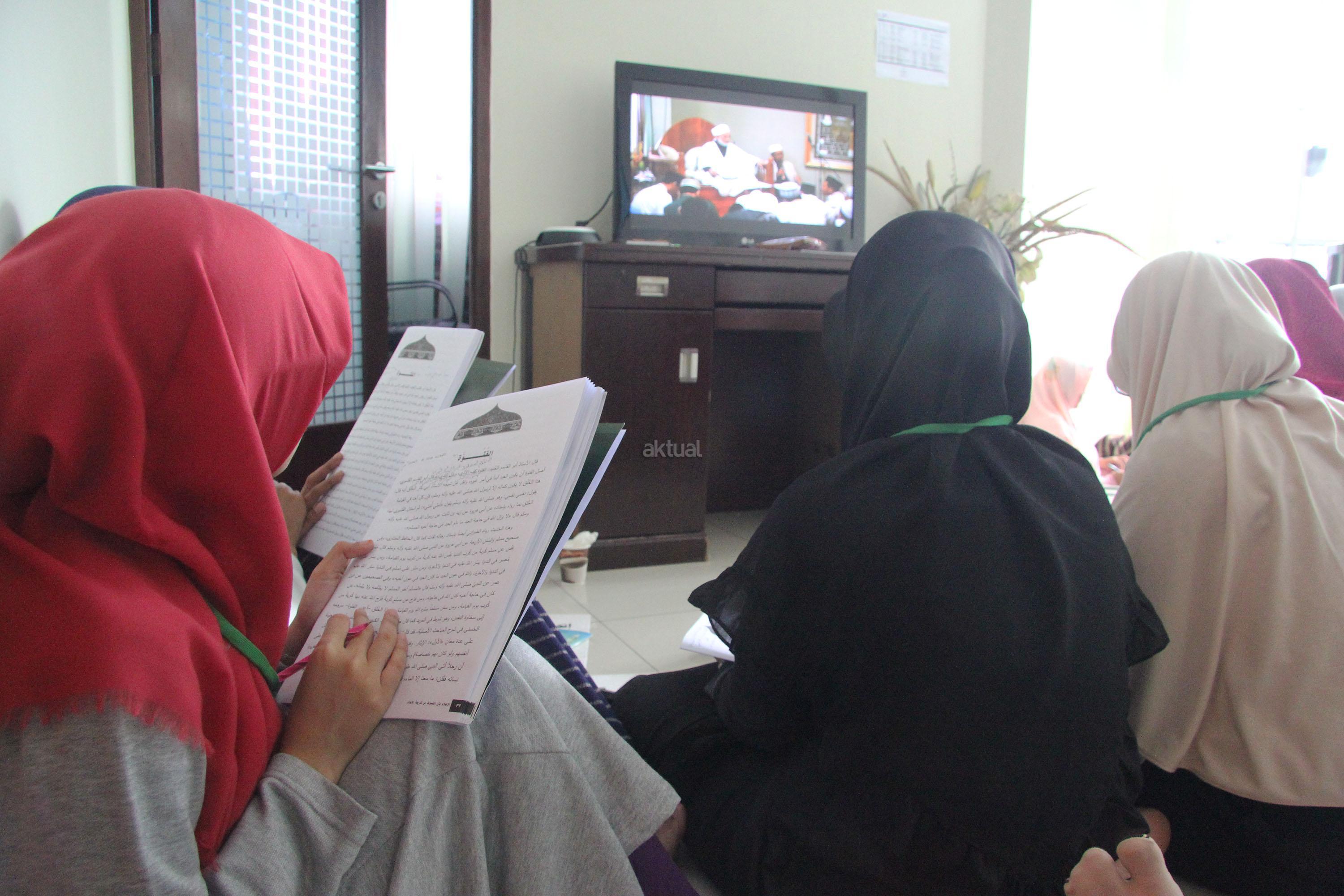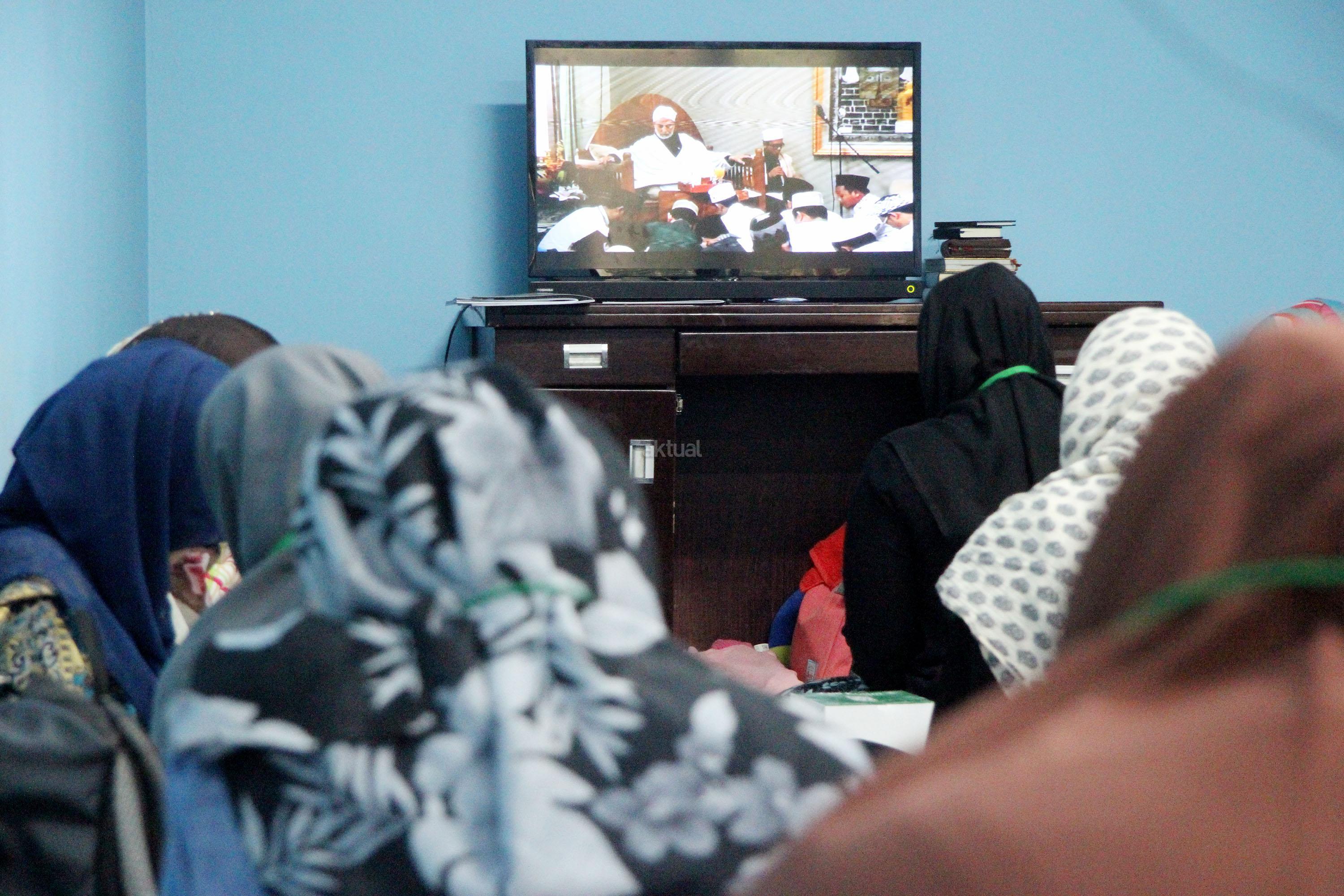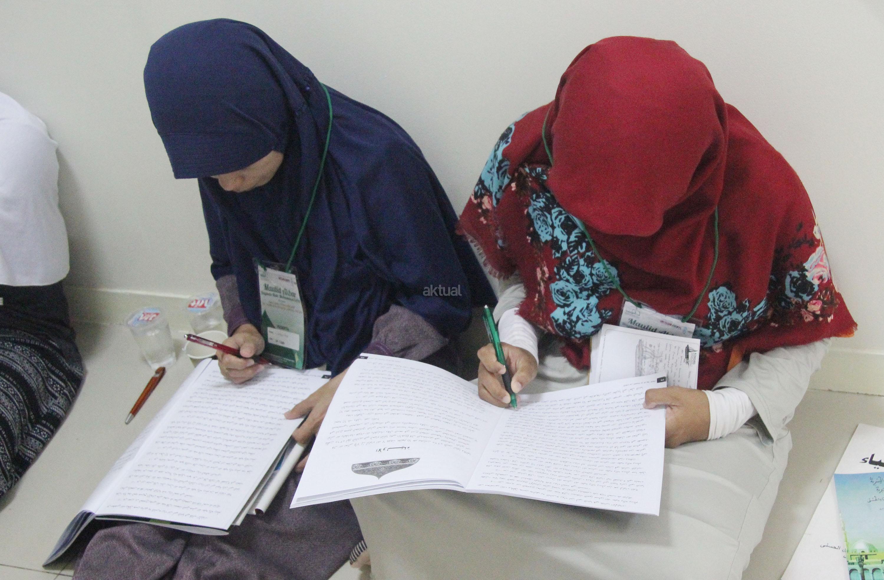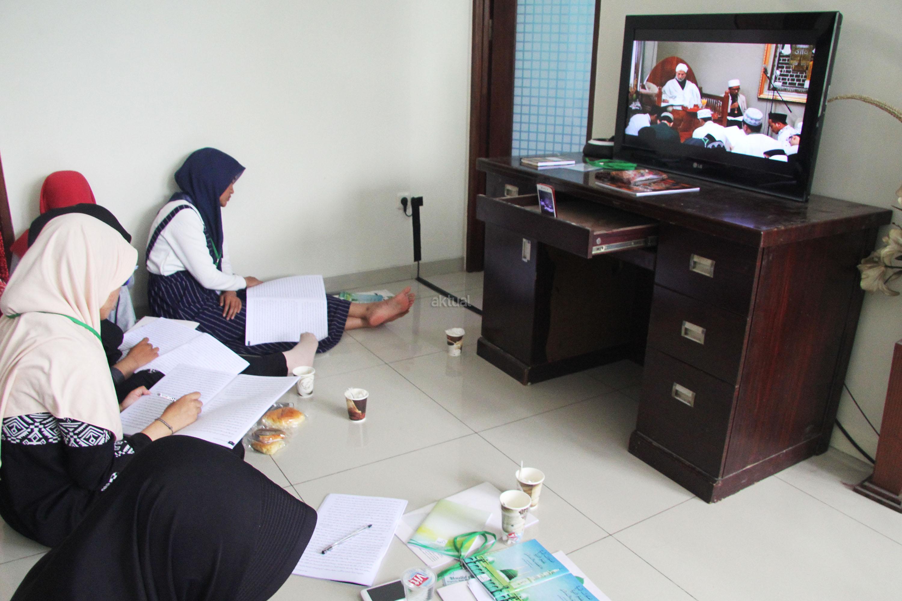 Peserta akhwat mengikuti Talaqi Kitab It’haf bersama Maulana Syekh Yusri Rusydi dalam menyambut Maulid Akbar Baginda Nabi Muhammad SAW di Majelis Zawiyah Arraudah, Tebet, Jakarta Selatan, Sabtu (28/1/2017). Didalam pembacaan kitab amin al-I’lam bi anna attasawwuf min syariat al-islam Syekh Yusri menjelaskan ihwal sufi atau orang yang mendalami tasawwuf. AKTUAL/Nailin