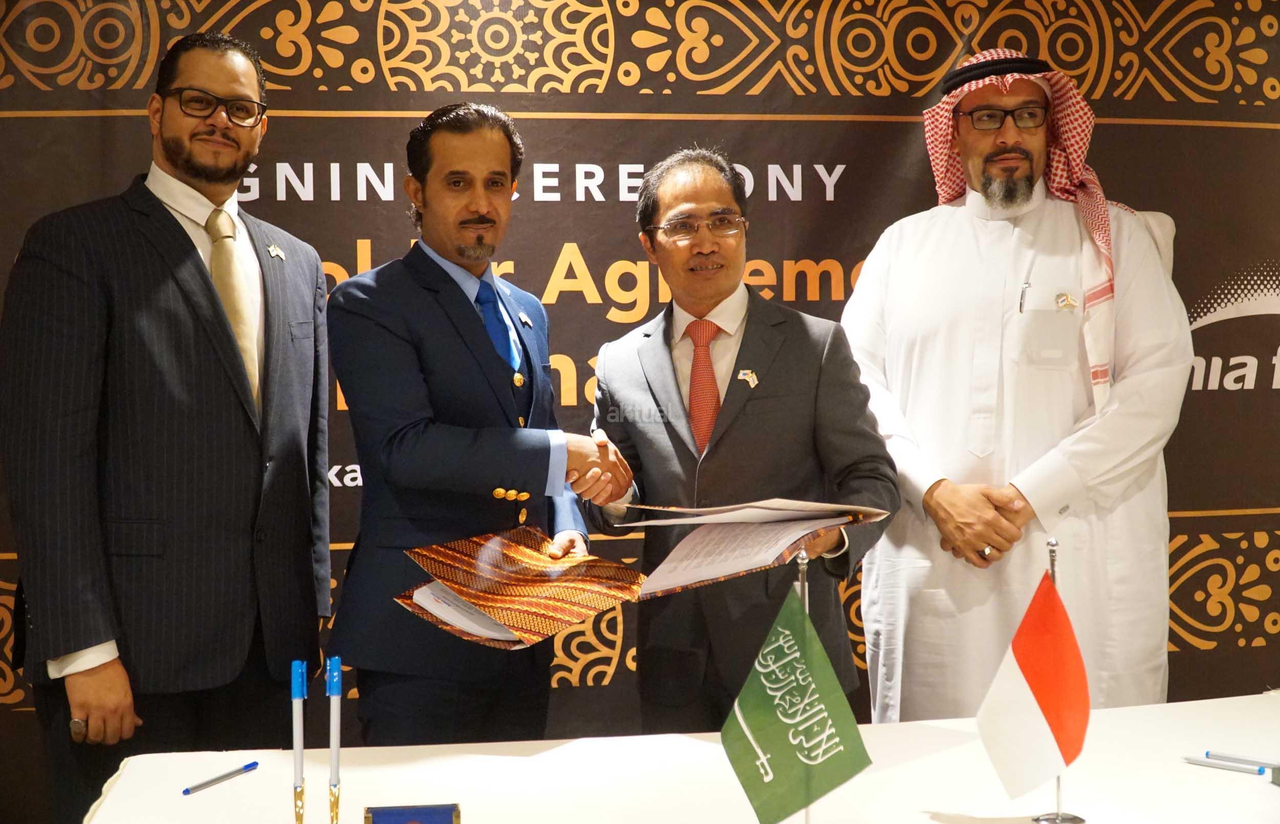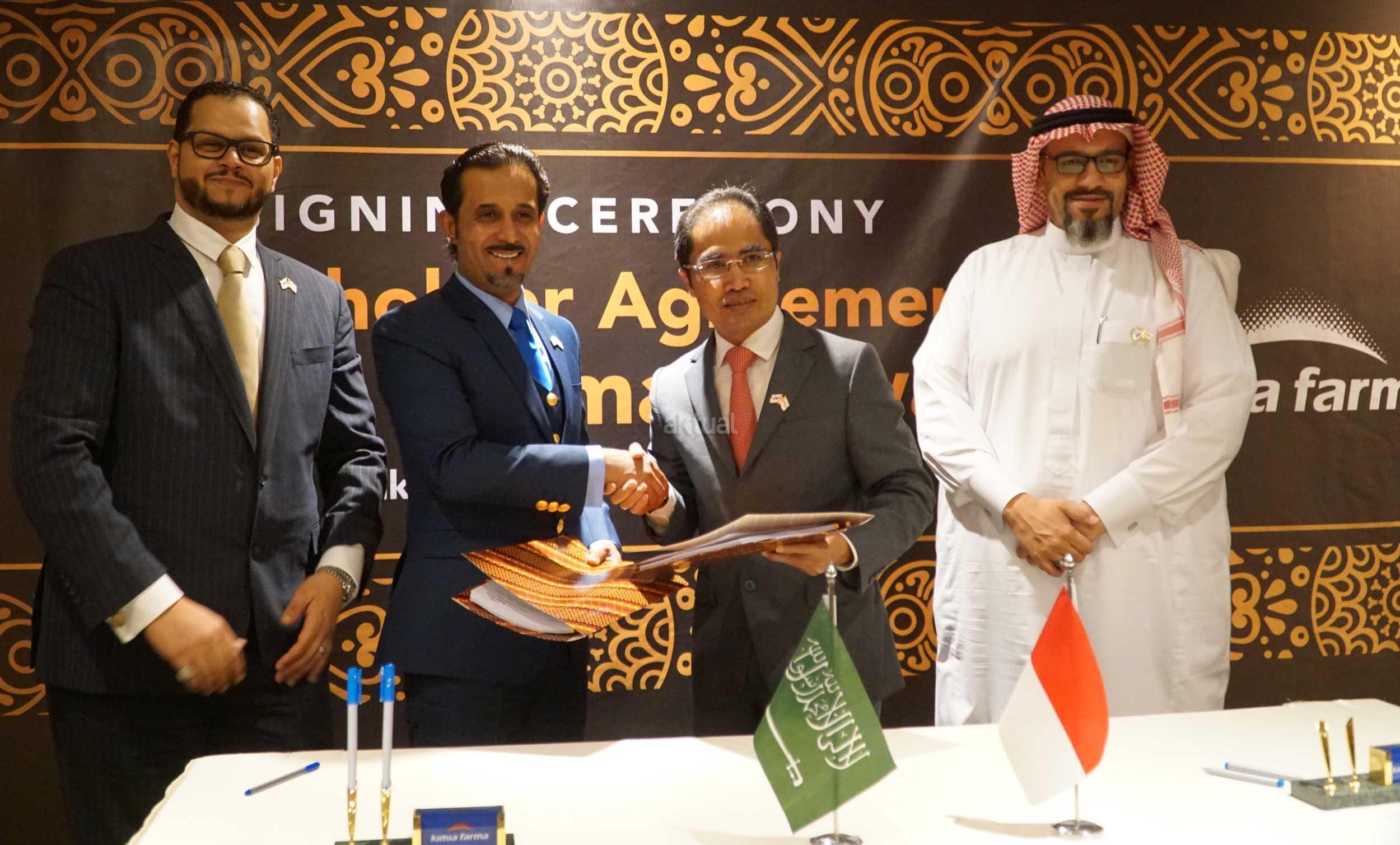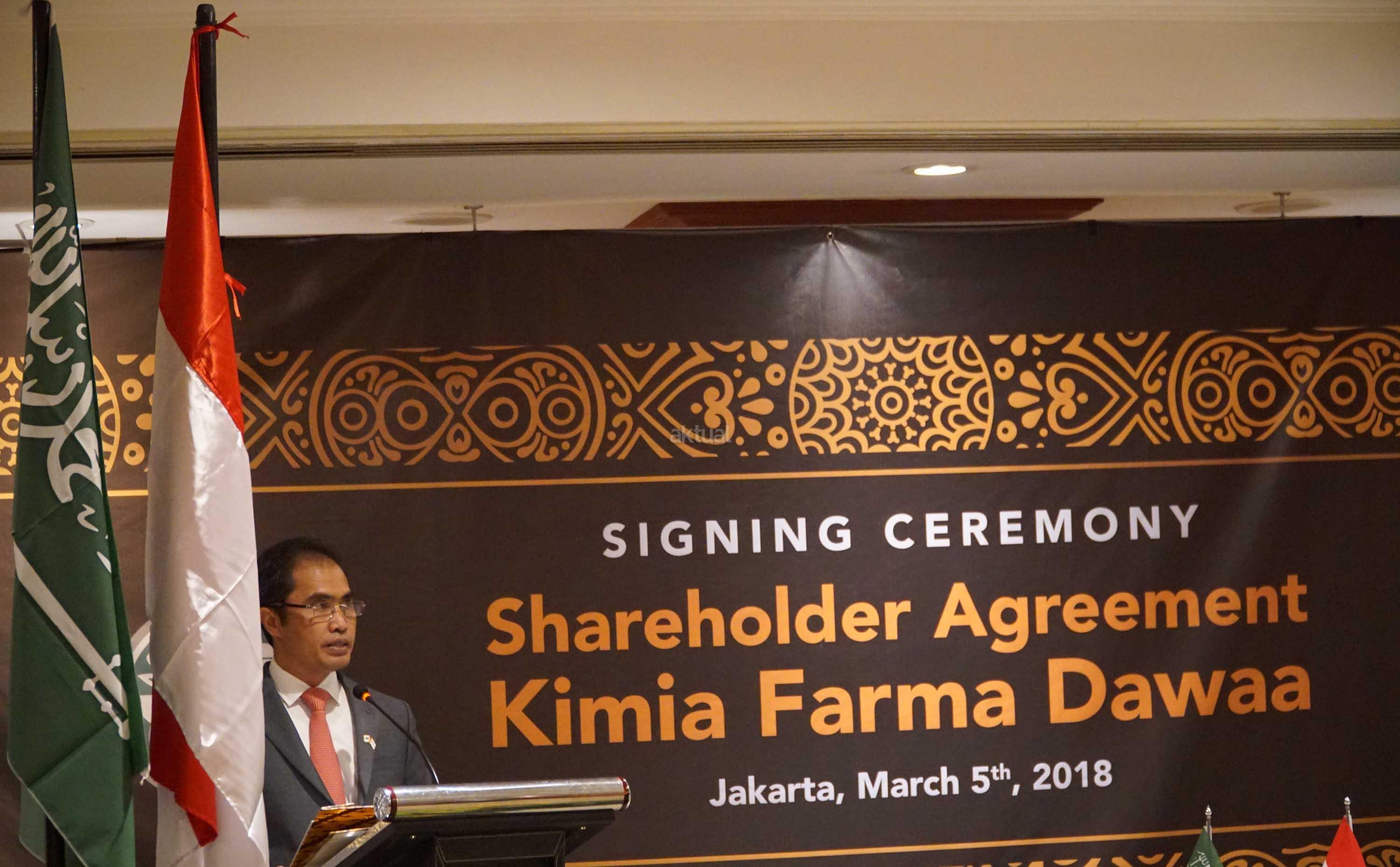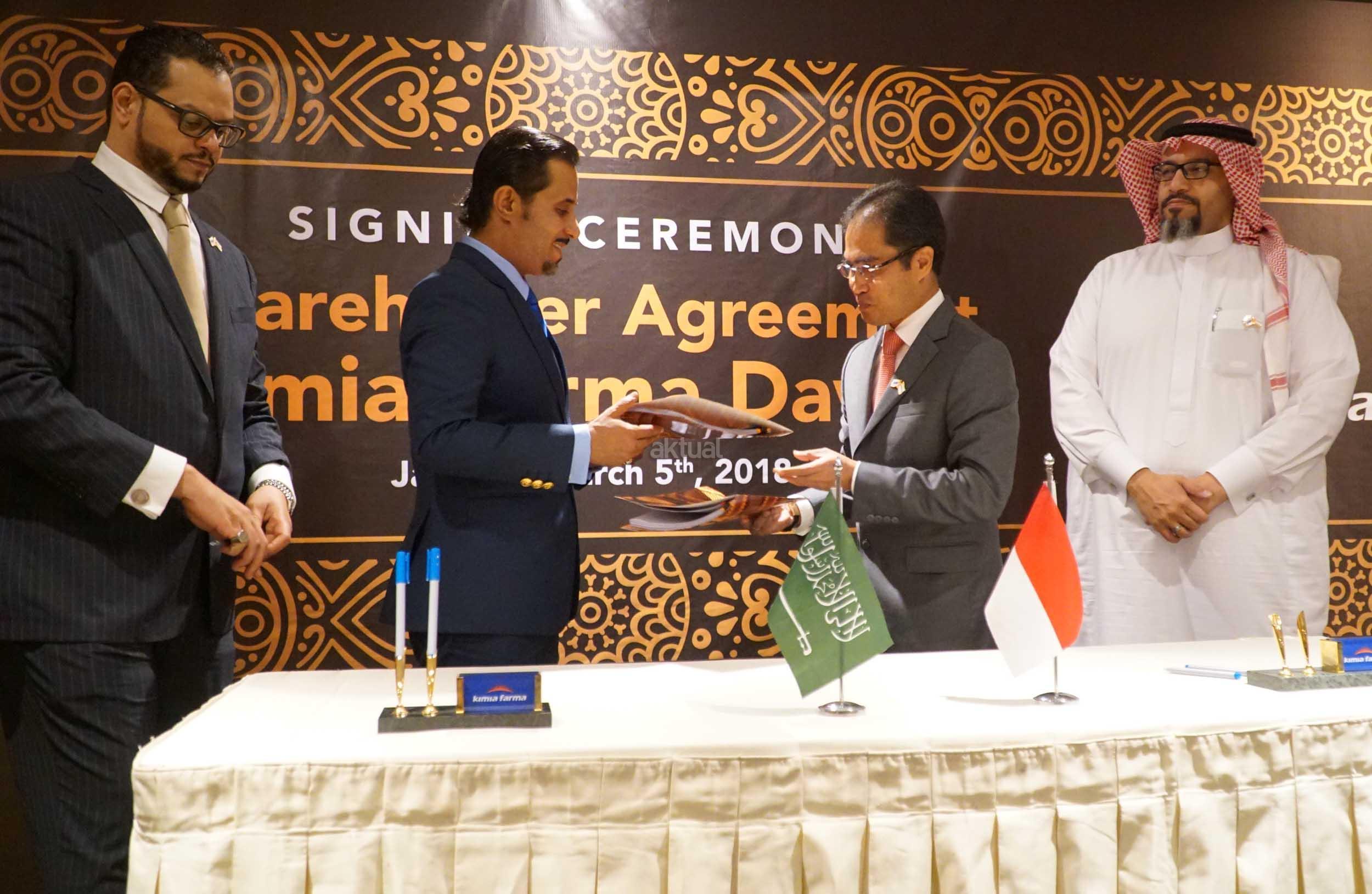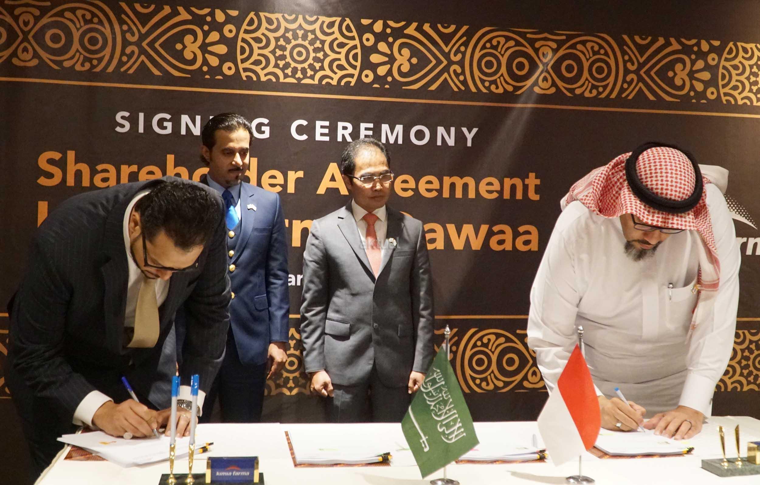 Direktur Utama Kimia Farma Honesti Basyir (kedua kanan) bersama Chief Executive Officer Marei Bin Mahfouz (MBM) Mahfoudz Bin Marei Bin Mahfouz (kedua kiri) menyaksikan penandatangan kerjasama Shareholder Agreement yang oleh Investor Lutfi Abdul Fattah Al Ghifari (kiri) dan Hasan Abdullah Jabarti di Jakarta, Senin (5/3). Kimia Farma mulai merambah industri farmasi di Arab Saudi dengan mengakuisisi saham Dawaa Medical Limited Company (Dawaa), salah satu anak perusahaan MBM Group yang bergerak di bidang kesehatan. AKTUAL/Eko S Hilman