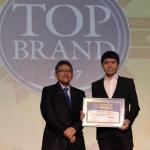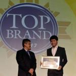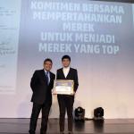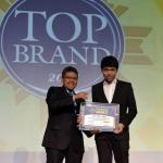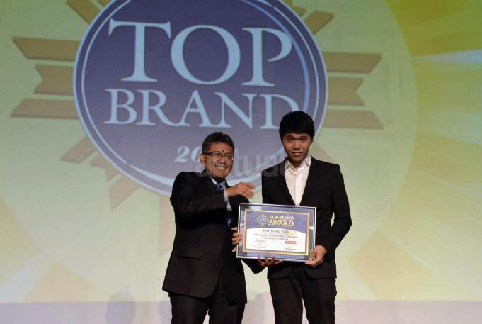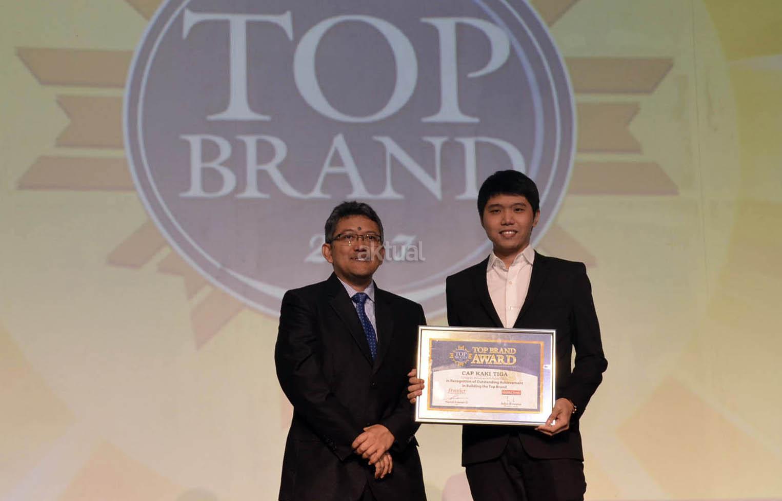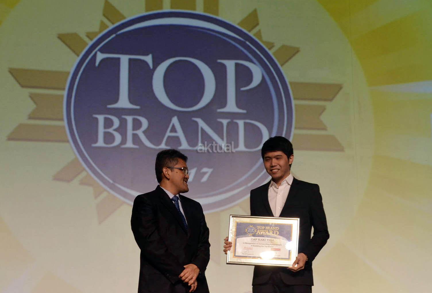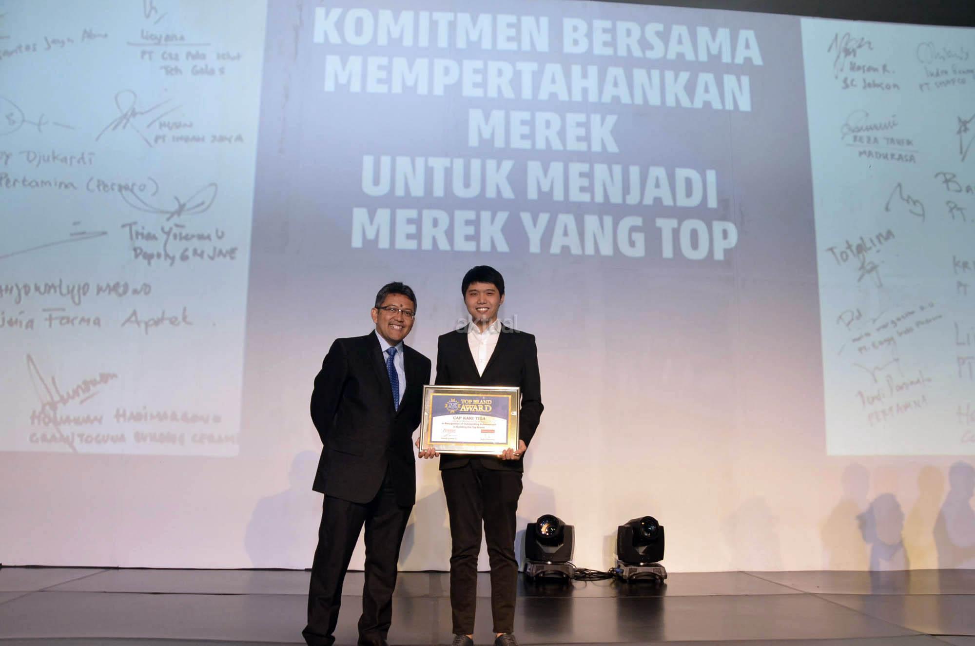 Assisten Brand Manager PT Kino Indonesia Tbk, Joseph Rondonuwu (Kanan) saat menerima penghargaan Top Brand Award 2017 di Hotel Mulia, Senayan, Jakarta, Senin (24/7). Cap Kaki Tiga kembali menerima Top Brand Award dari Managing Director Majalah Marketing Adyo Bawono. Penghargaan ini semakin mengukuhkan eksistensi Cap Kaki Tiga (sebagai ahlinya panas dalam) yang telah dipercaya konsumen selama 80 tahun. AKTUAL/HO