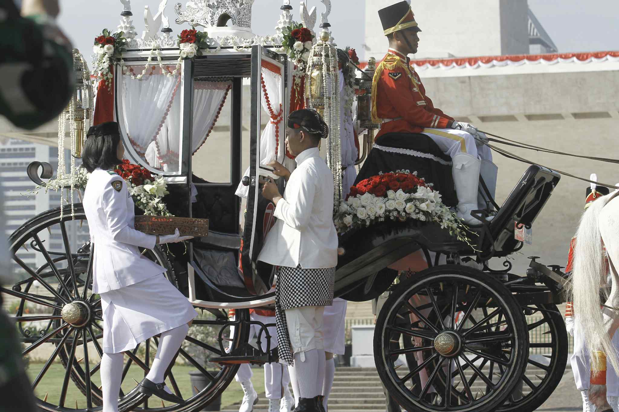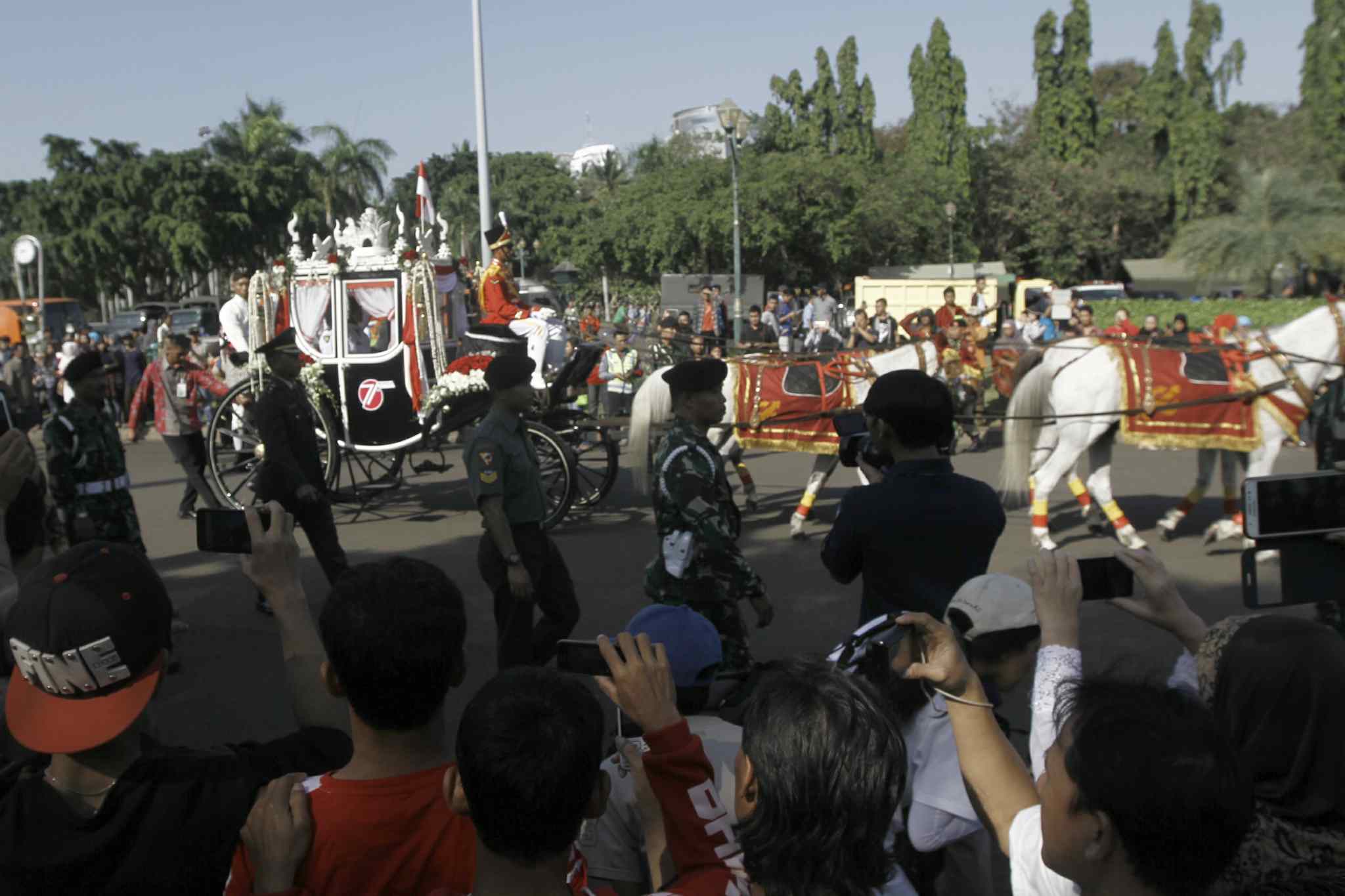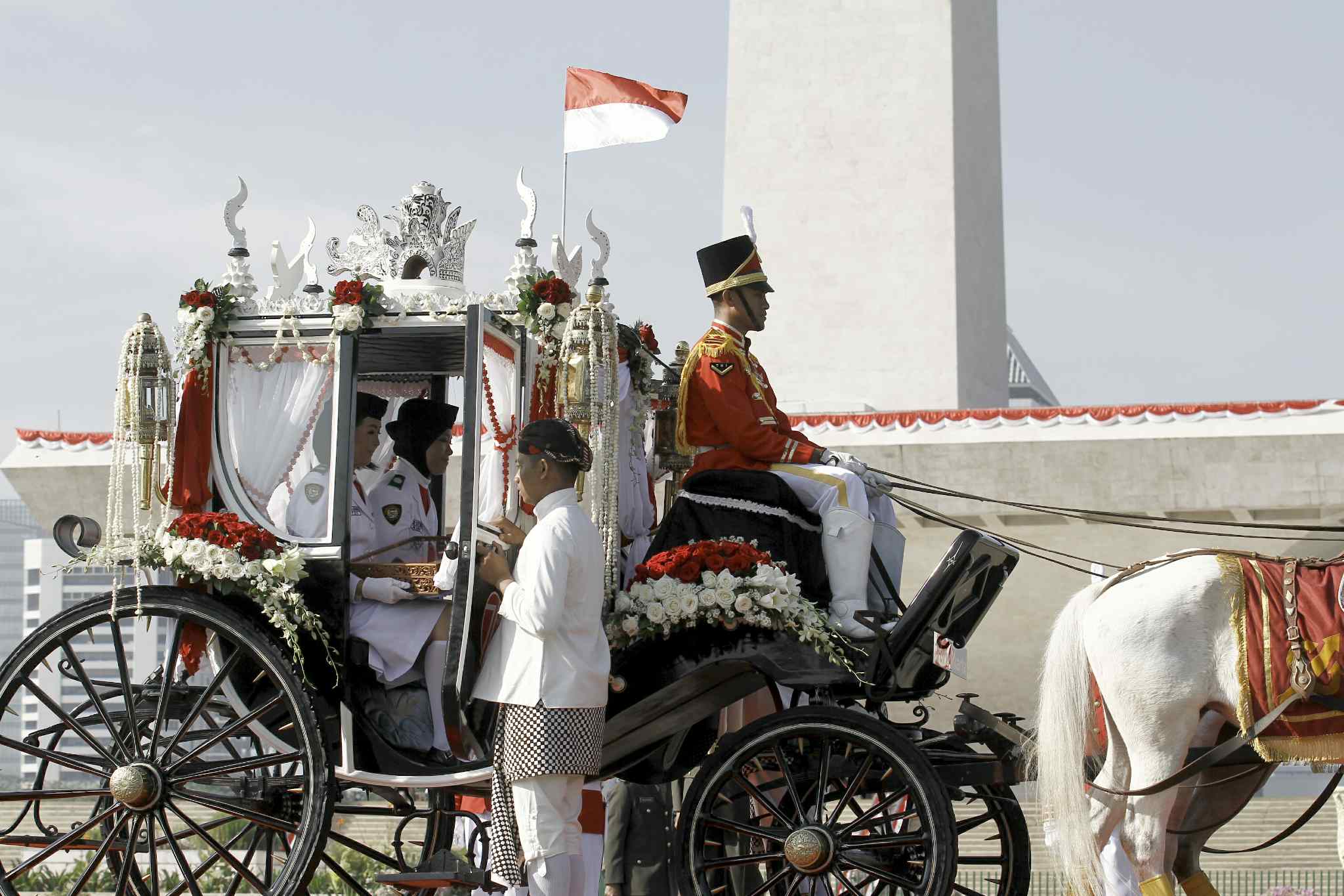 Dua anggota Pasukan Pengibar Bendera Pusaka (Paskibraka) membawa bendera pusaka dan teks Proklamasi Kemerdekaan RI dari Monumen Nasional menuju Istana Merdeka Jakarta menumpang kereta kencana Ki Jaga Karsa menuju Istana Negara, Jakarta, Rabu (17/8). Selain diiringi para penunggang kuda dan pengawal, pemuda berpakaian kemeja dan celana putih dengan aksesoris merah putih, rombongan orang berpakaian adat kerajaan dari seluruh Indonesia juga mengiringi perjalanan kereta kencana tersebut. AKTUAL/TINO OKTAVIANO