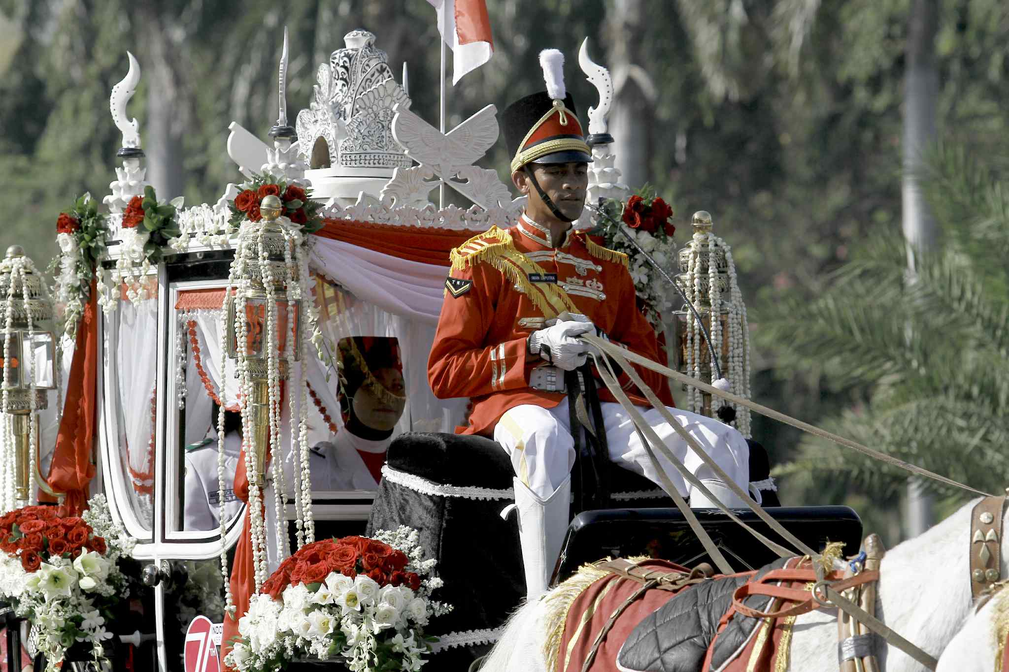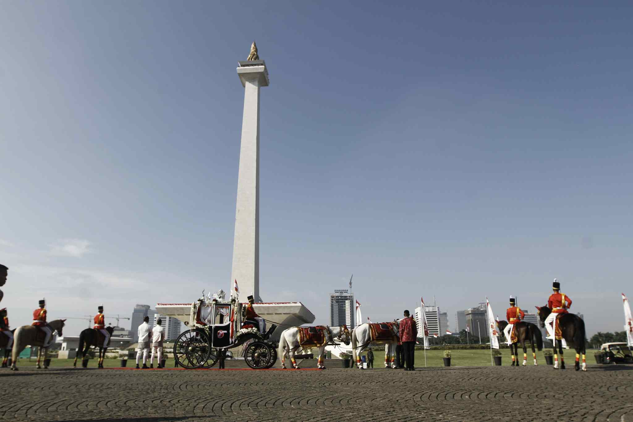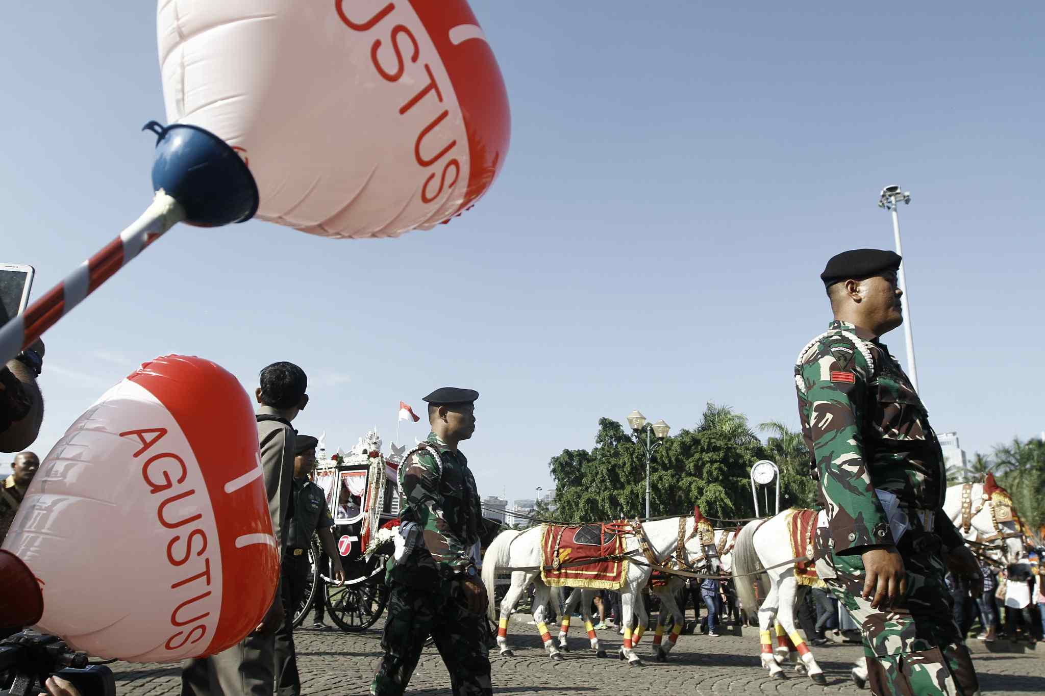 Dua anggota Pasukan Pengibar Bendera Pusaka (Paskibraka) membawa bendera pusaka dan teks Proklamasi Kemerdekaan RI dari Monumen Nasional menuju Istana Merdeka Jakarta menumpang kereta kencana Ki Jaga Karsa menuju Istana Negara, Jakarta, Rabu (17/8). Selain diiringi para penunggang kuda dan pengawal, pemuda berpakaian kemeja dan celana putih dengan aksesoris merah putih, rombongan orang berpakaian adat kerajaan dari seluruh Indonesia juga mengiringi perjalanan kereta kencana tersebut. AKTUAL/TINO OKTAVIANO