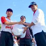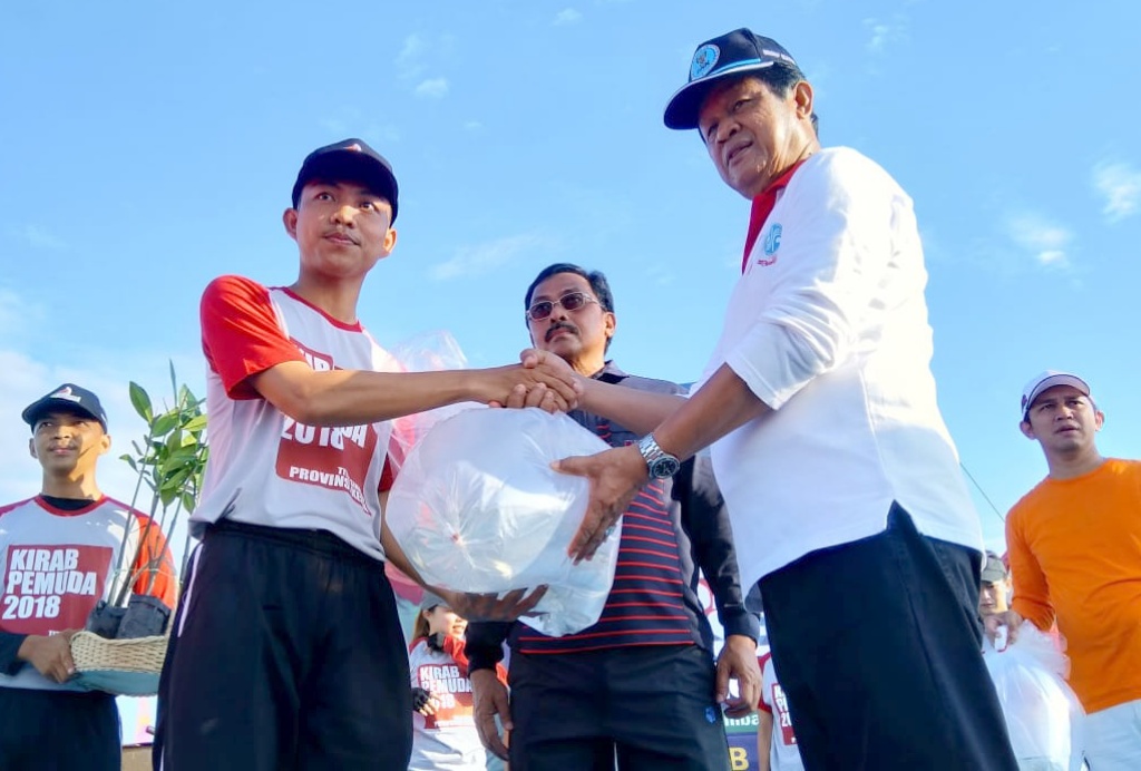 (kiri-kanan) Sekde Kepri Arif Fadhilah, Peserta Kirab dari Sulawesi Tenggara Hendrik, Wagub Kepri Isdianto dan Gubernur Kepri Nurdin Basirun menyerahkan simbolik bibit pohon mangrove kepada peserta kirab pemuda untuk di tanam disekitaran kampung pelangi di pesisir pantai di Kota Tanjung Pinang, Kepulauan Riuan, Jumat (21/9). Kirab Pemuda merupakan salah satu program unggulan Kemenpora di bidang Kepemudaan, untuk mempromosikan kreativitas, memberdayakan potensi pemuda, dan mendorong optimalisasi potensi daerah melalui peran pemuda. AKTUAL/HO