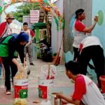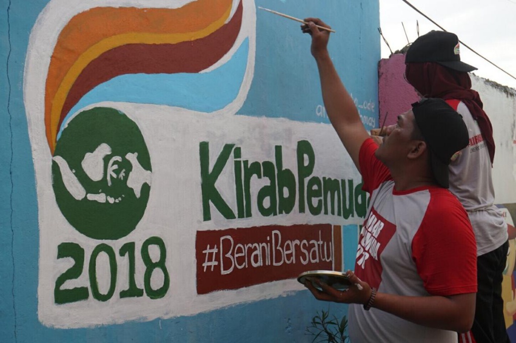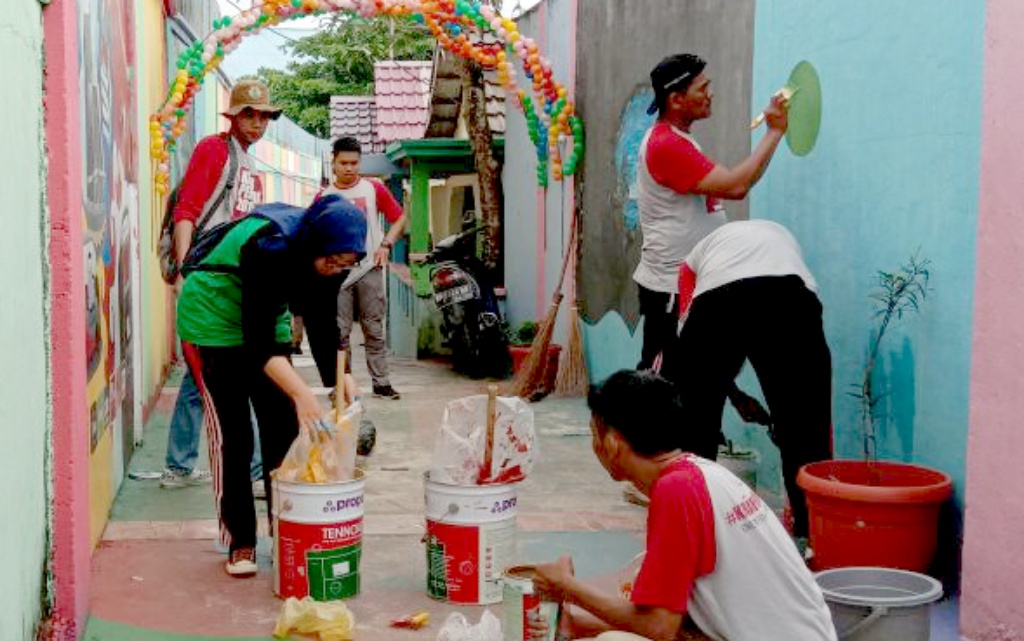 Peserta kirab pemuda melakukan proses pengecatan yang bertempat di kampung pelangi, Kota Tanjung Pinang, Kepulauan Riau, Jumat (21/9). Kirab Pemuda merupakan salah satu program unggulan Kemenpora di bidang Kepemudaan, untuk mempromosikan kreativitas, memberdayakan potensi pemuda, dan mendorong optimalisasi potensi daerah melalui peran pemuda. AKTUAL/HO