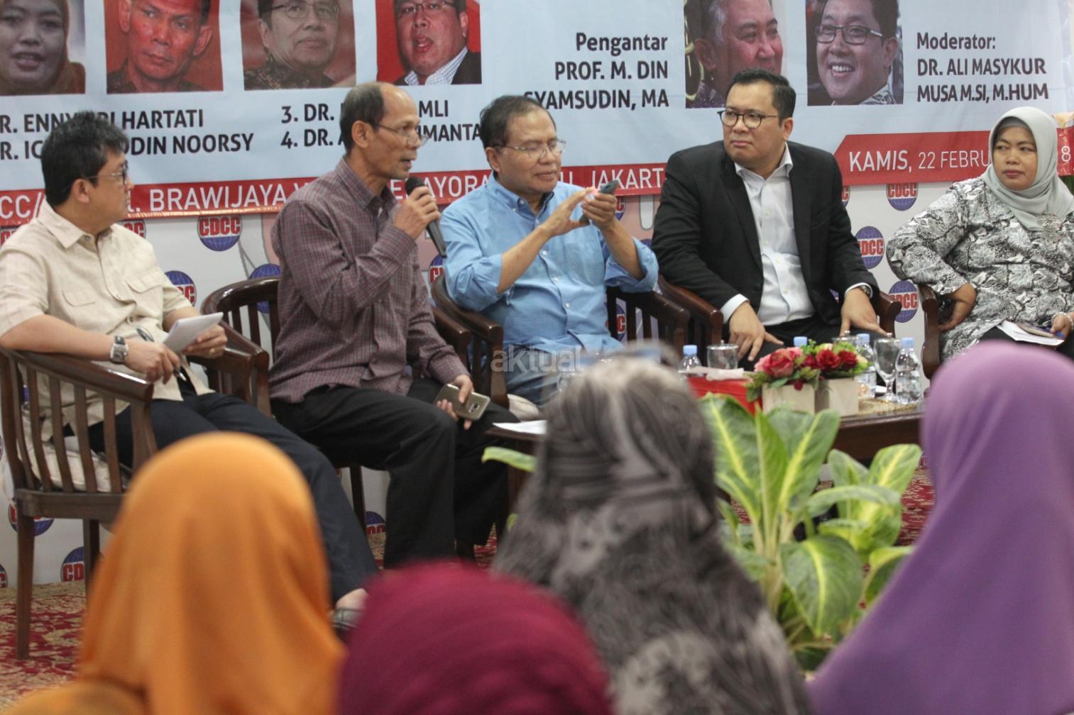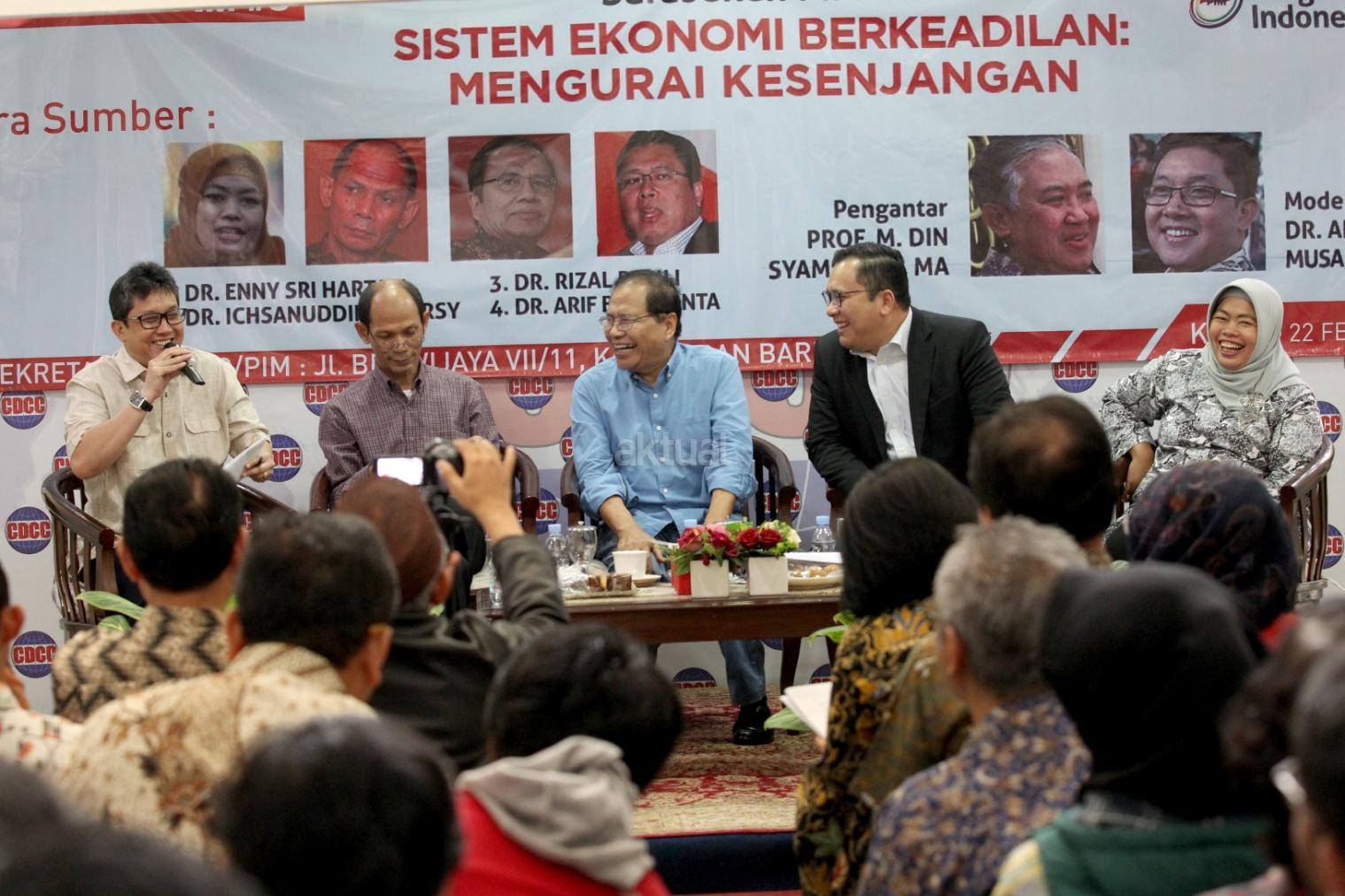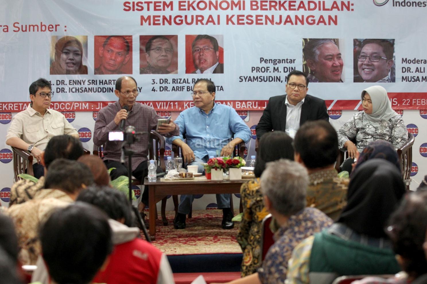Moderator Ali Masykur Musa, Pengamat Politik Ekonomi Ichsanuddin Noorsy, Ekonom Senior dan Politisi Rizal Ramli, Politisi Partai Demokrasi Indonesia Perjuangan Arif Budimanta dan Direktur Institute for Development of Economics and Finance (INDEF) Enny Sri Hartati menjadi pembicara diskusi Sistem Ekonomi Berkeadilan, Mengurangi Kesenjangan di Sekretariat Pergerakan Indonesia Maju, Jakarta, Kamis (22/2/18). Menjamurnya korupsi, kolusi, dan nepotisme (KKN) memperlambat pertumbuhan ekonomi Indonesia. maraknya korupsi di Indonesia membuat Indonesia tertinggal dari negara-negara ASEAN lain, seperti Vietnam dan Malaysia. Hal lain yang turut memperlambat pertumbuhan ekonomi adalah pembangunan di Indonesia yang menurutnya memiliki corak neoliberalisme ala Bank Dunia. AKTUAL/Tino Oktaviano