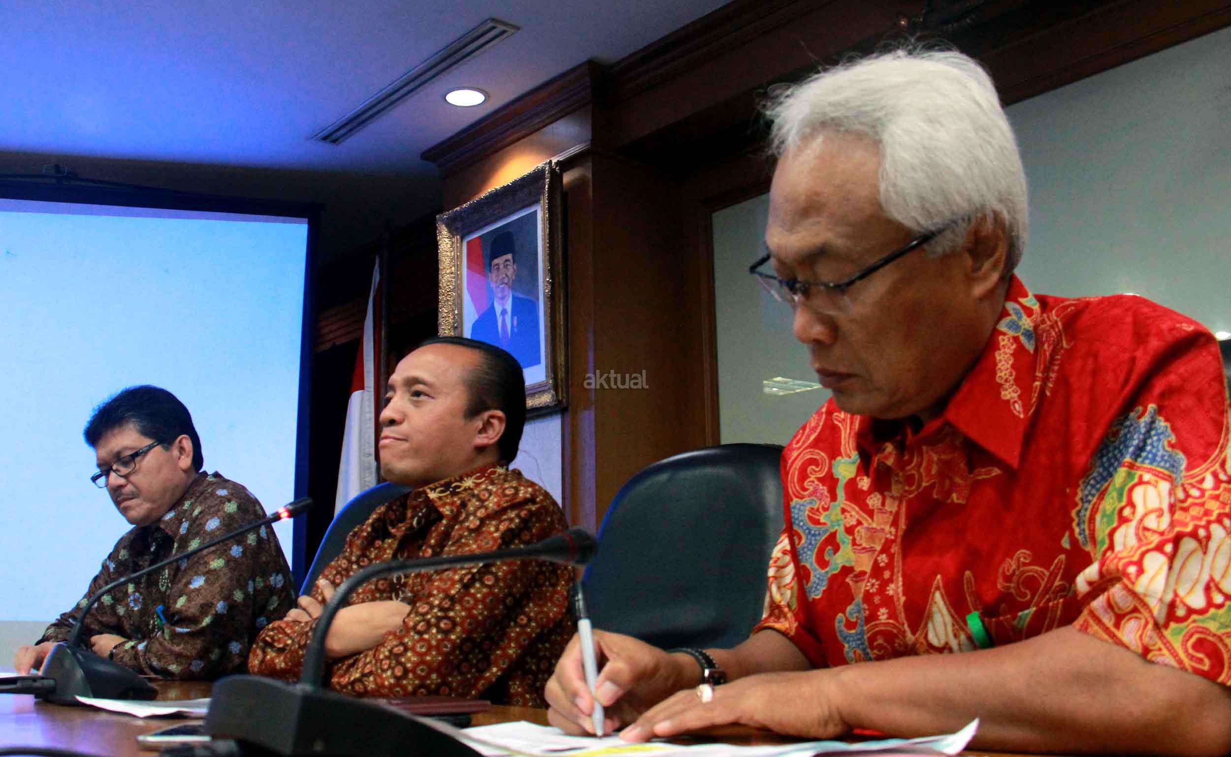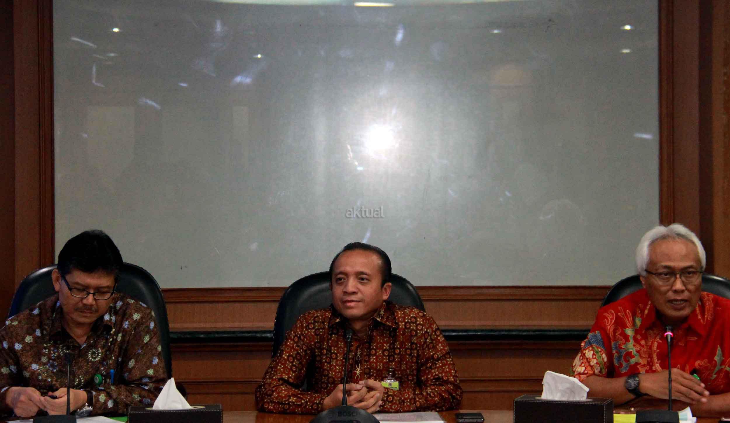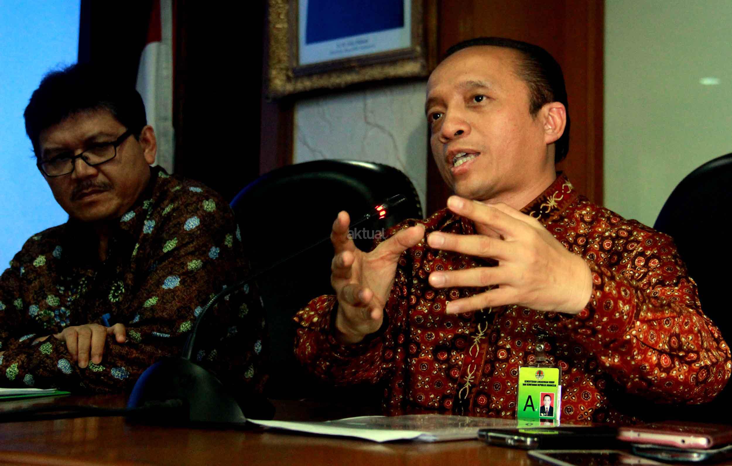 Sekjen Kementrian Kehutanan dan Lingkungan Hidup (KLHK) Bambang Hendroyono (tengah) saat melakukan jumpa persnya di kantor Kementrian KLHK, Jakarta, Selasa (22/9/2015). Dalam jumpa persnya