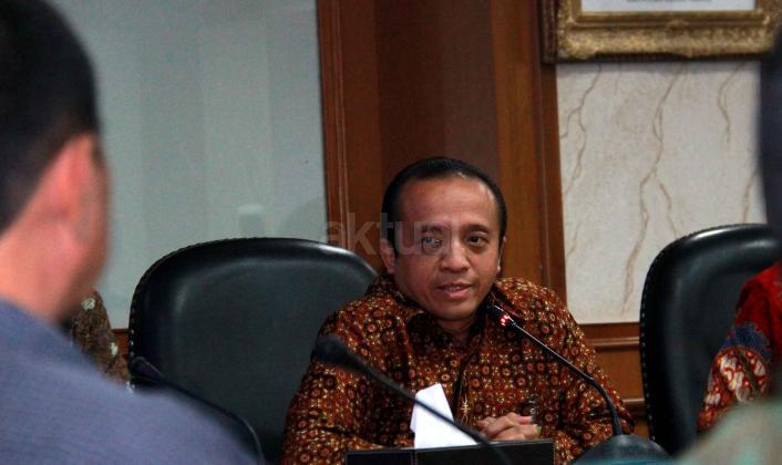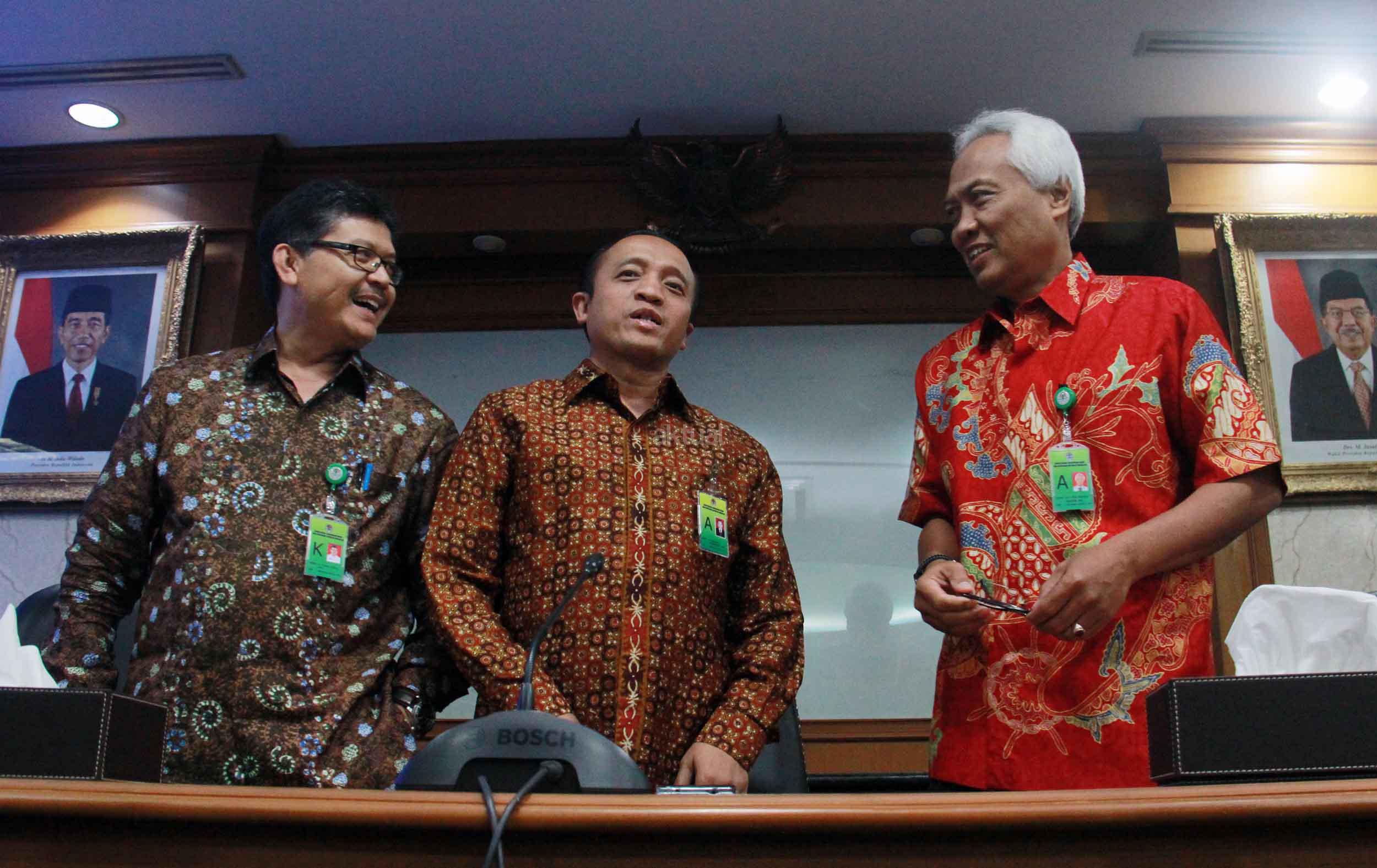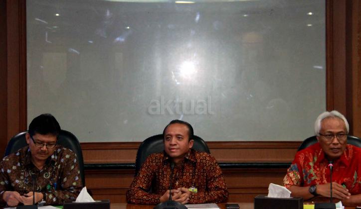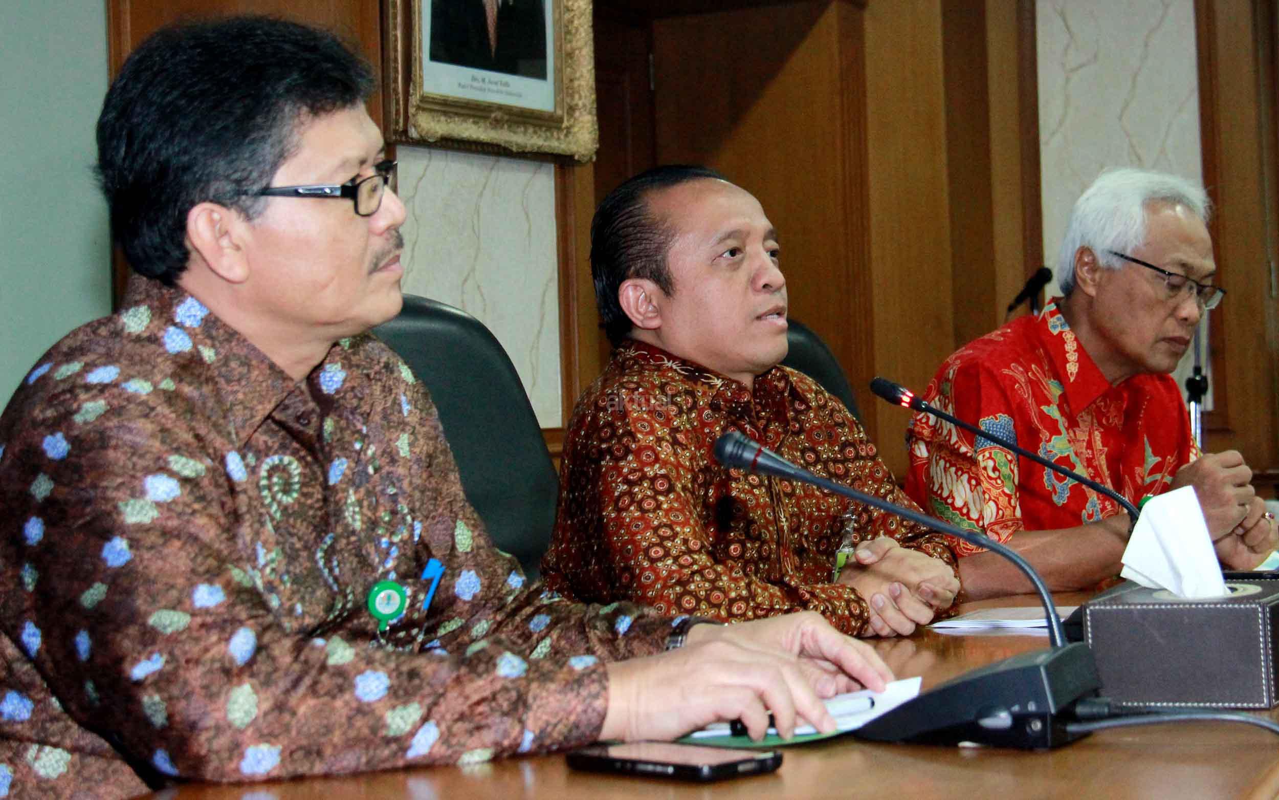 Sekjen Kementrian Kehutanan dan Lingkungan Hidup (KLHK) Bambang Hendroyono (tengah) saat melakukan jumpa persnya di kantor Kementrian KLHK, Jakarta, Selasa (22/9/2015). Dalam jumpa persnya
