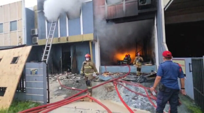 Gudang pestisida milik PT Biotek Saranatama, yang berlokasi di Taman Tekno, Bumi Serpong Damai, Tangerang Selatan, kebakaran, Senin 9 Februari 2025. Cairan pestisida yang teracmpur dengan air pemadam kebakaran mengalir ke sungai menyebabkan tercemarnya Sungai CIsadane sejauh 22,5 kilometer. Wilayah terdampak meliputi Tangerang Selatan, Kota Tangerang, dan Kabupaten Tangerang. Foto; Ist