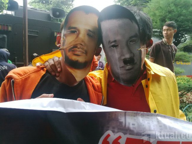 Untuk mendukung aksi tersebut, massa KMP-KIH memakai topeng Abraham Samad berhidung panjang mirip ‘pinokio’ tokoh dalam film kartun dan topeng Samad mirip tokoh dunia Adolf Hitler.