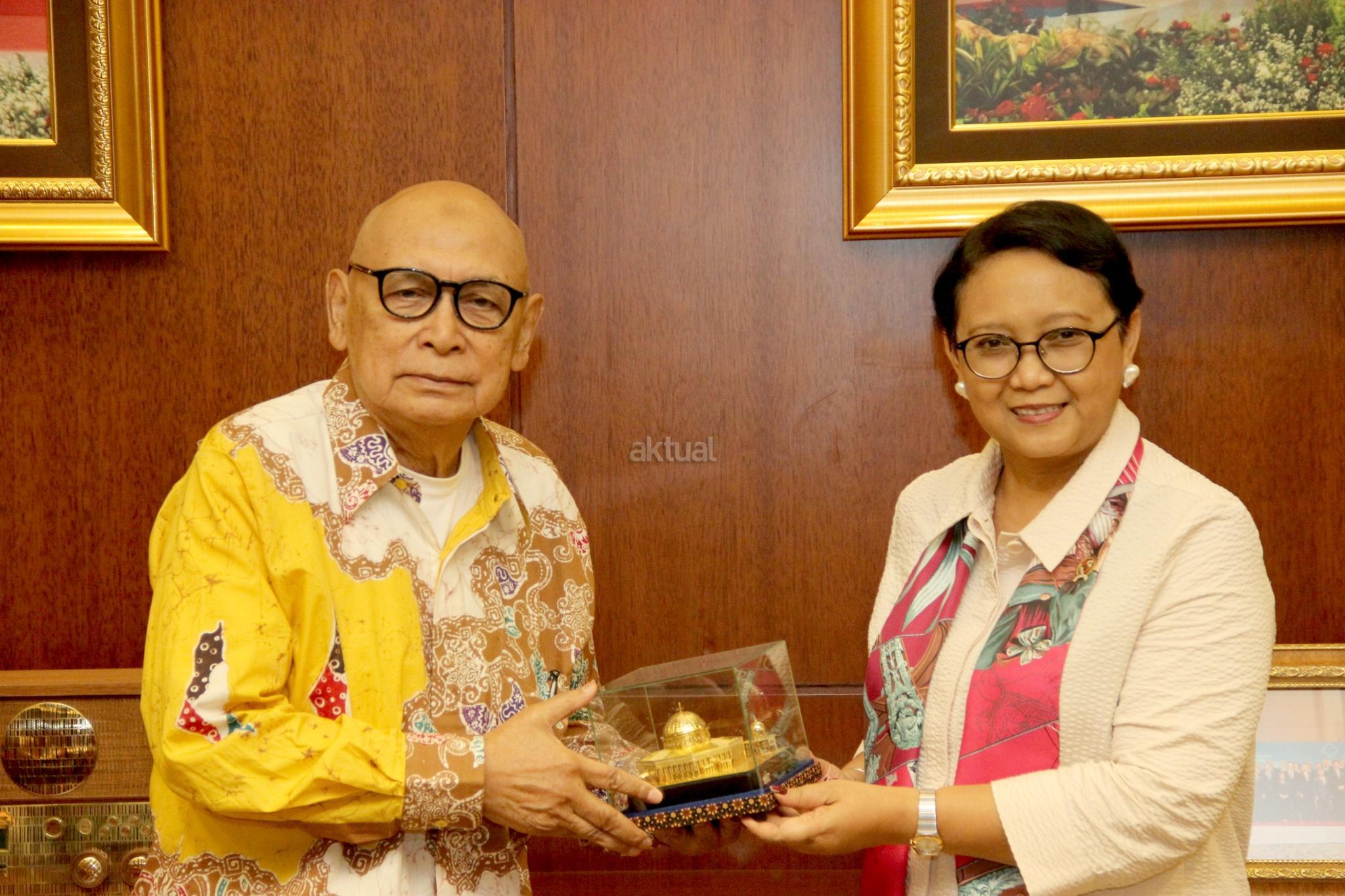 Ketua KNRP Suripto (kiri) menyerahkan miniatur simbol Masjid Al-Aqsha kepada Menlu RI Retno Marsudi (kanan) di akhir kunjungan KNRP, di Kantor Kementerian Luar Negeri RI, di Jalan Pejambon, Gambir, Jakarta Pusat, Selasa (22/8/2017). Kunjungan perdana ini sebagai bentuk dukungan KNRP kepada pemerintah yang serius dalam upaya membantu memberikan solusi kemerdekaan bagi rakyat Palestina dari penjajahan Israel. AKTUAL/HO