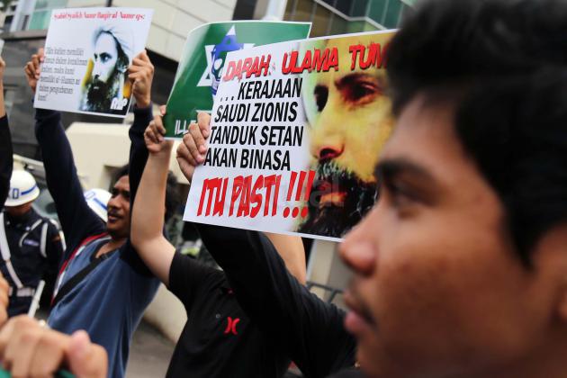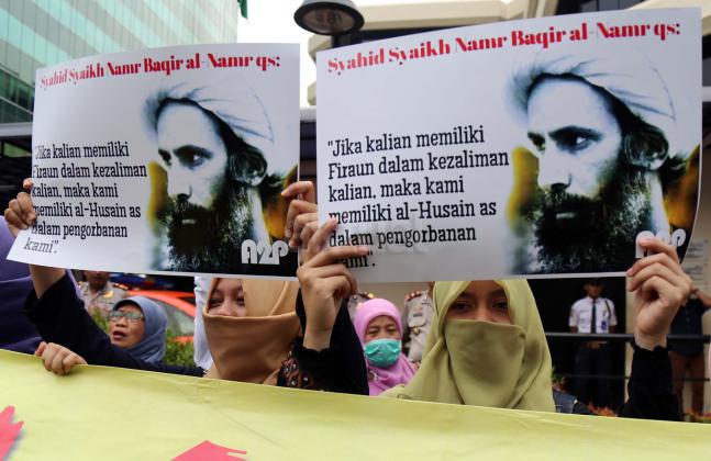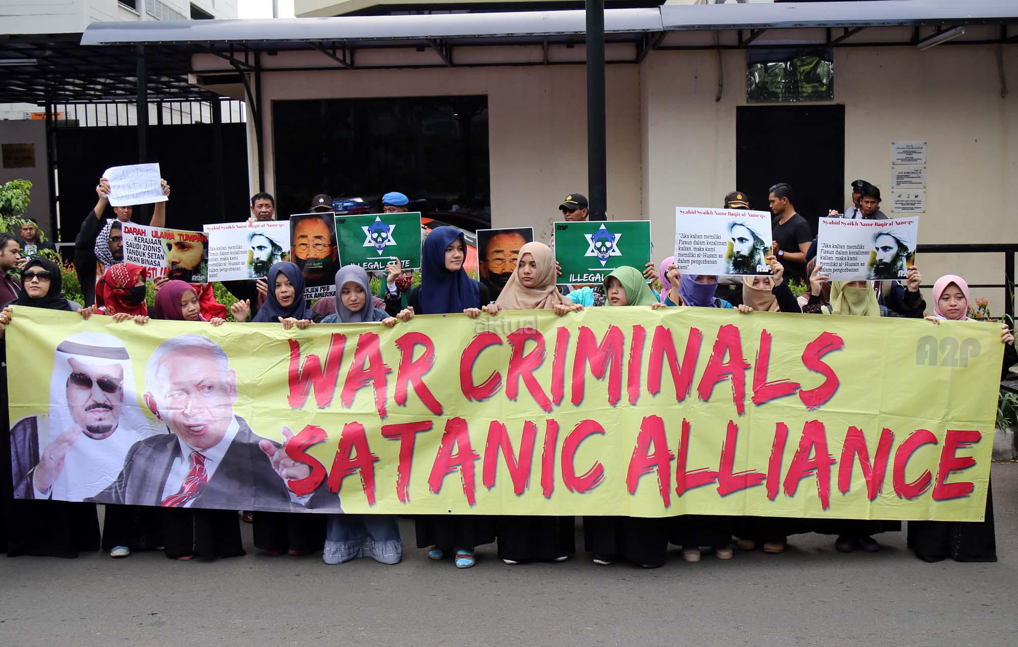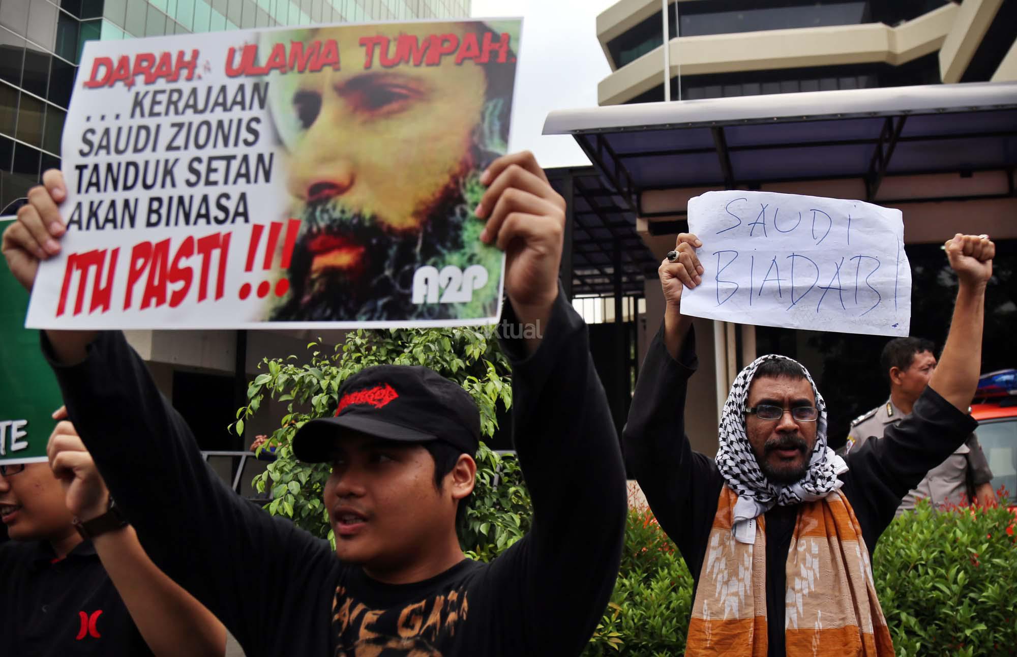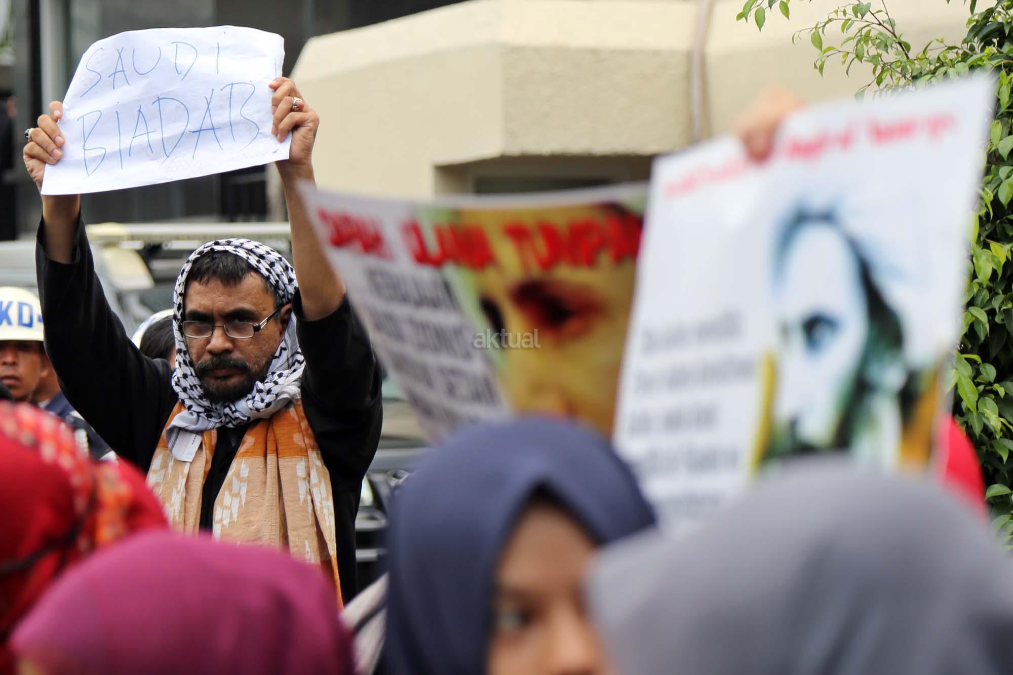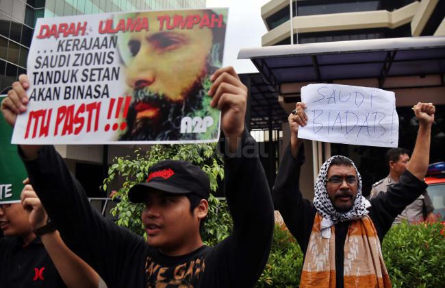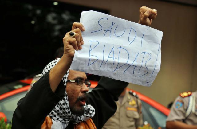 Massa dari Koalisi Anti Perang berunjuk rasa di depan Kedubes Arab Saudi di Jakarta, Senin (4/1). Mereka mengecam keras kerajaan Arab Saudi yang mengeksekusi mati sejumlah tahanan politik, termasuk ulama Syiah Syekh Nimr al-Nimr. AKTUAL/TINO OKTAVIANO