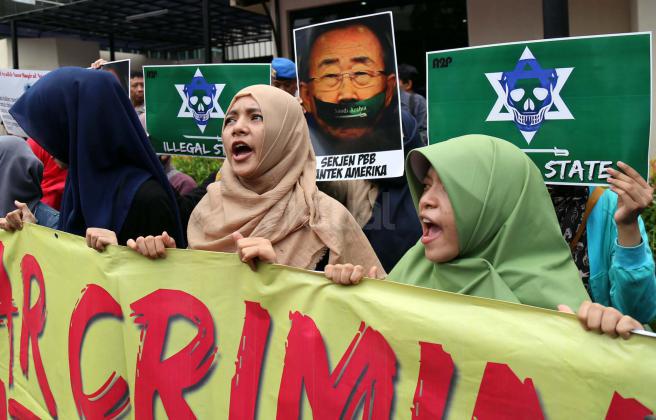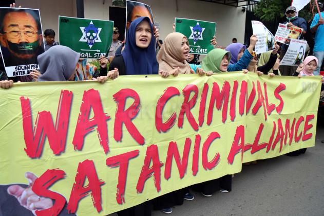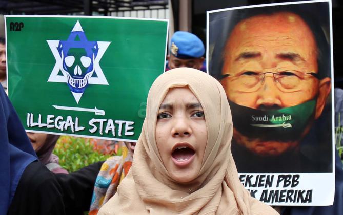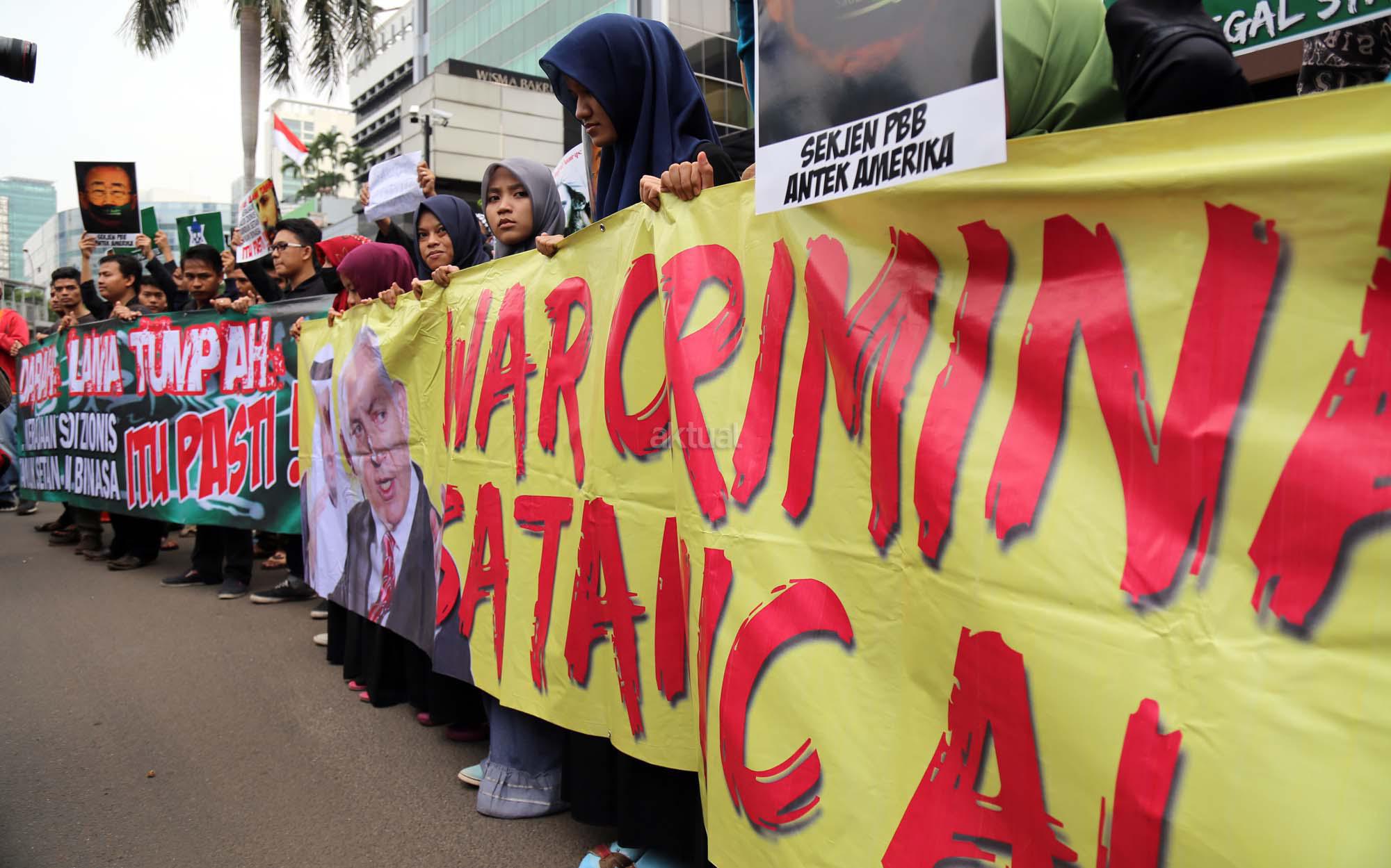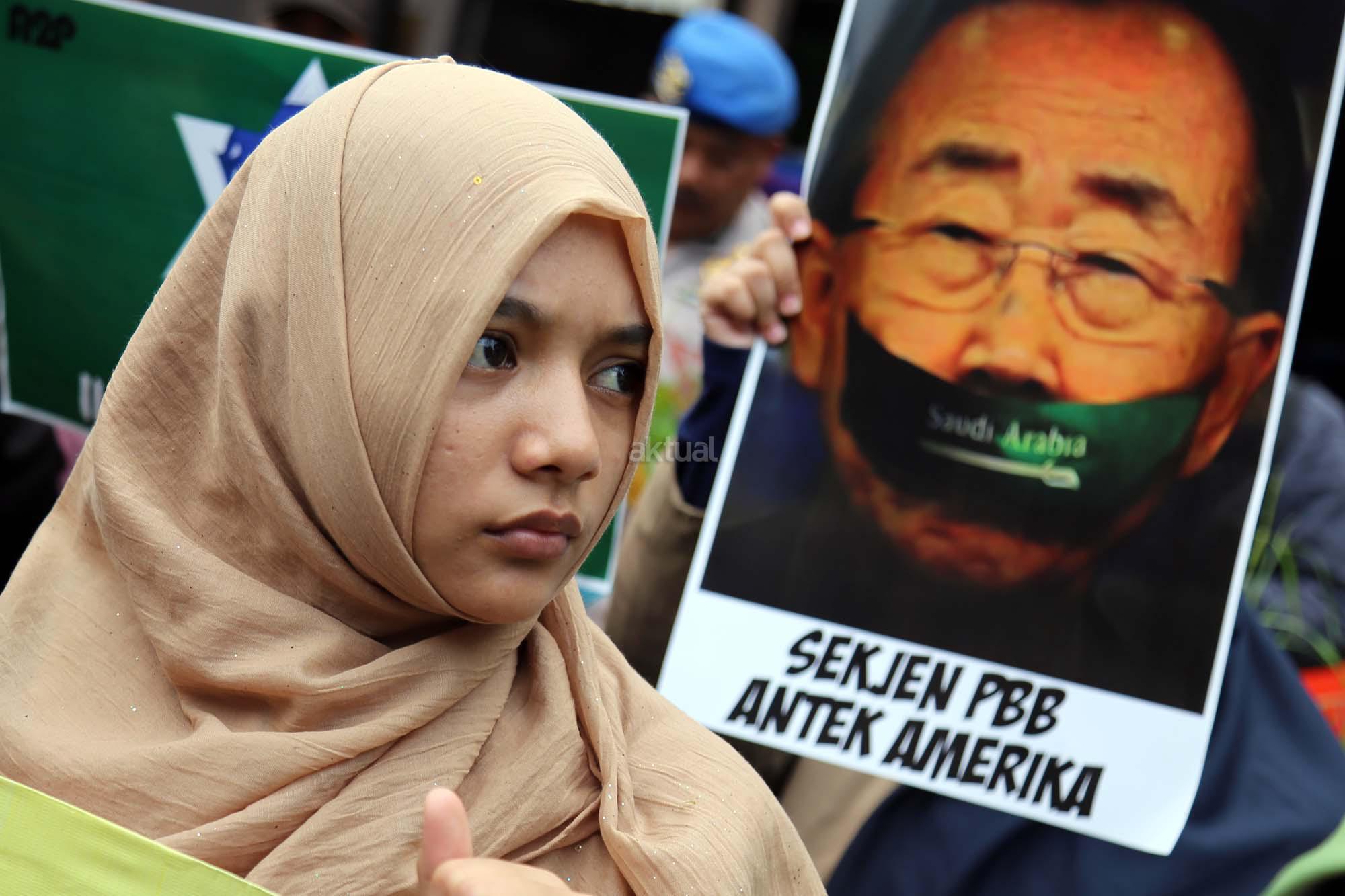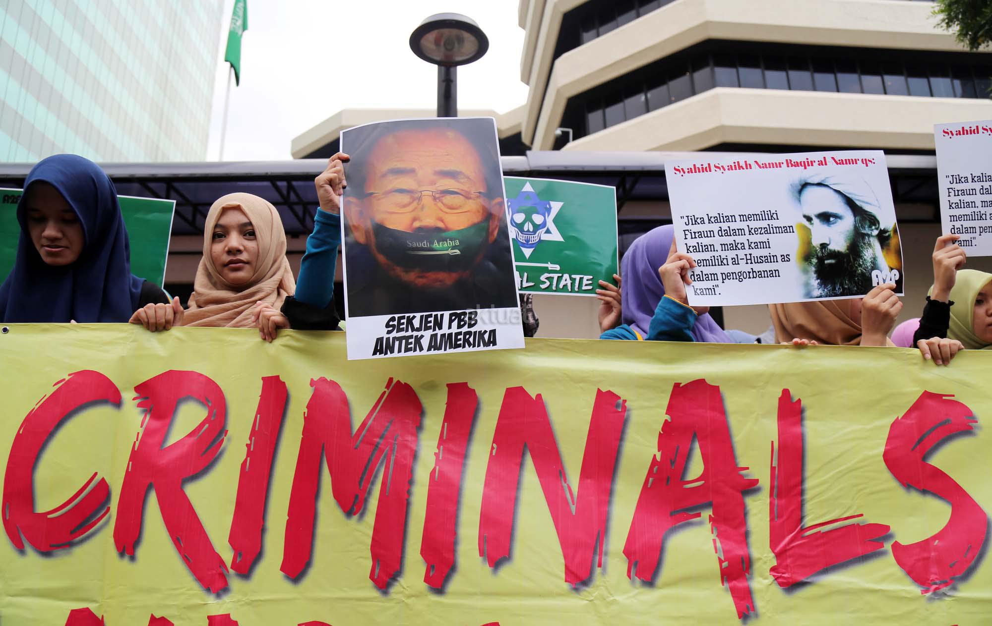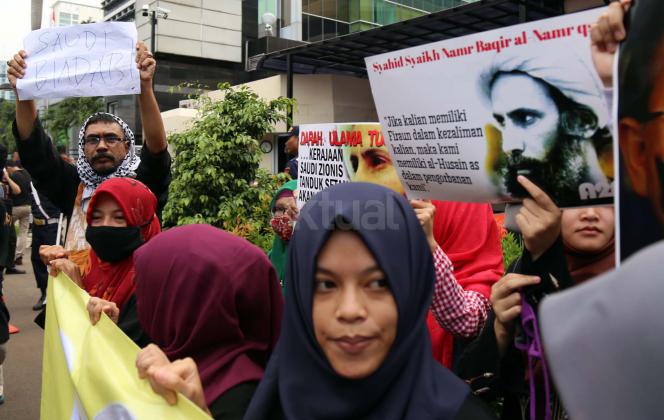 Massa dari Koalisi Anti Perang berunjuk rasa di depan Kedubes Arab Saudi di Jakarta, Senin (4/1). Mereka mengecam keras kerajaan Arab Saudi yang mengeksekusi mati sejumlah tahanan politik, termasuk ulama Syiah Syekh Nimr al-Nimr. AKTUAL/TINO OKTAVIANO
