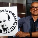 Mantan pimpinan KPK Busyro Muqoddas menunjukan poster dukungan kepada penyidik senior KPK Novel Bawesdan di gedung KPK, Kuningan, Jakarta Selatan, Selasa (11/4/2017). Mereka memberikan dukungan kepada KPK dan juga meminta Presiden Jokowi turun tangan langsung dengan cara membentuk tim khusus untuk mengusut kasus penyiraman air keras terhadap penyidik senior KPK Novel Baswedan. AKTUAL/Munzir