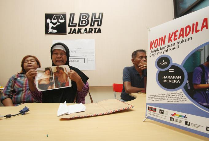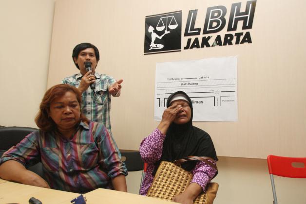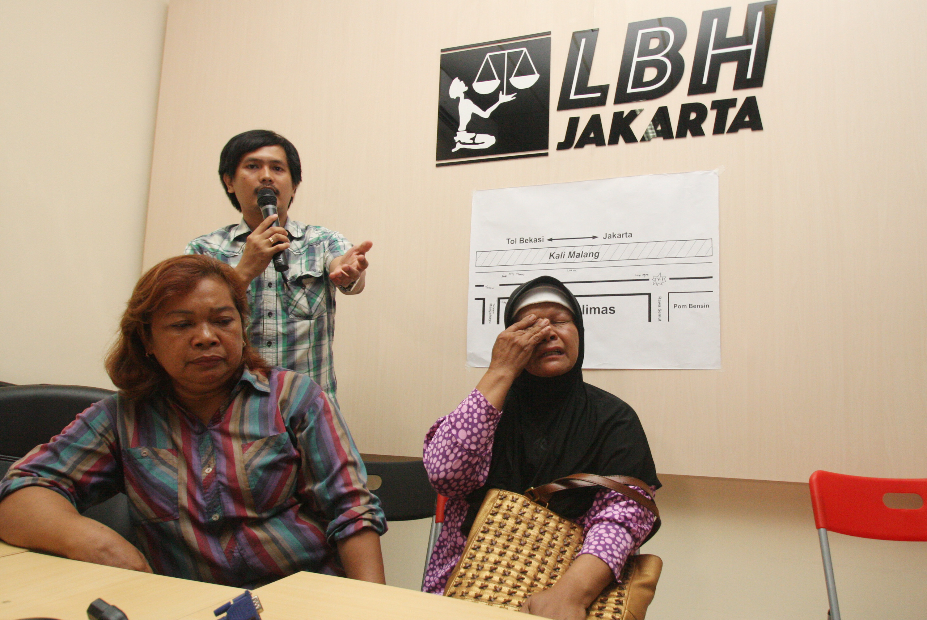 Pengacara dari LBH Jakarta Johanes Gea (berdiri), ibunda Yosafat korban pembunuhan akibat tawuran, Ratna Juwita (kiri) bersama ibunda korban salah tangkap, Nani menggelar konferensi pers di Gedung LBH, Jakarta, Minggu (3/1). Dalam pernyataannya, keluarga korban salah tangkap meminta kepada pihak Kepolisian untuk membebaskan terdakwa Didit yang diduga melakukan pembunuhan Yosafat. ANTARA FOTO/Reno Esnir/foc/16.