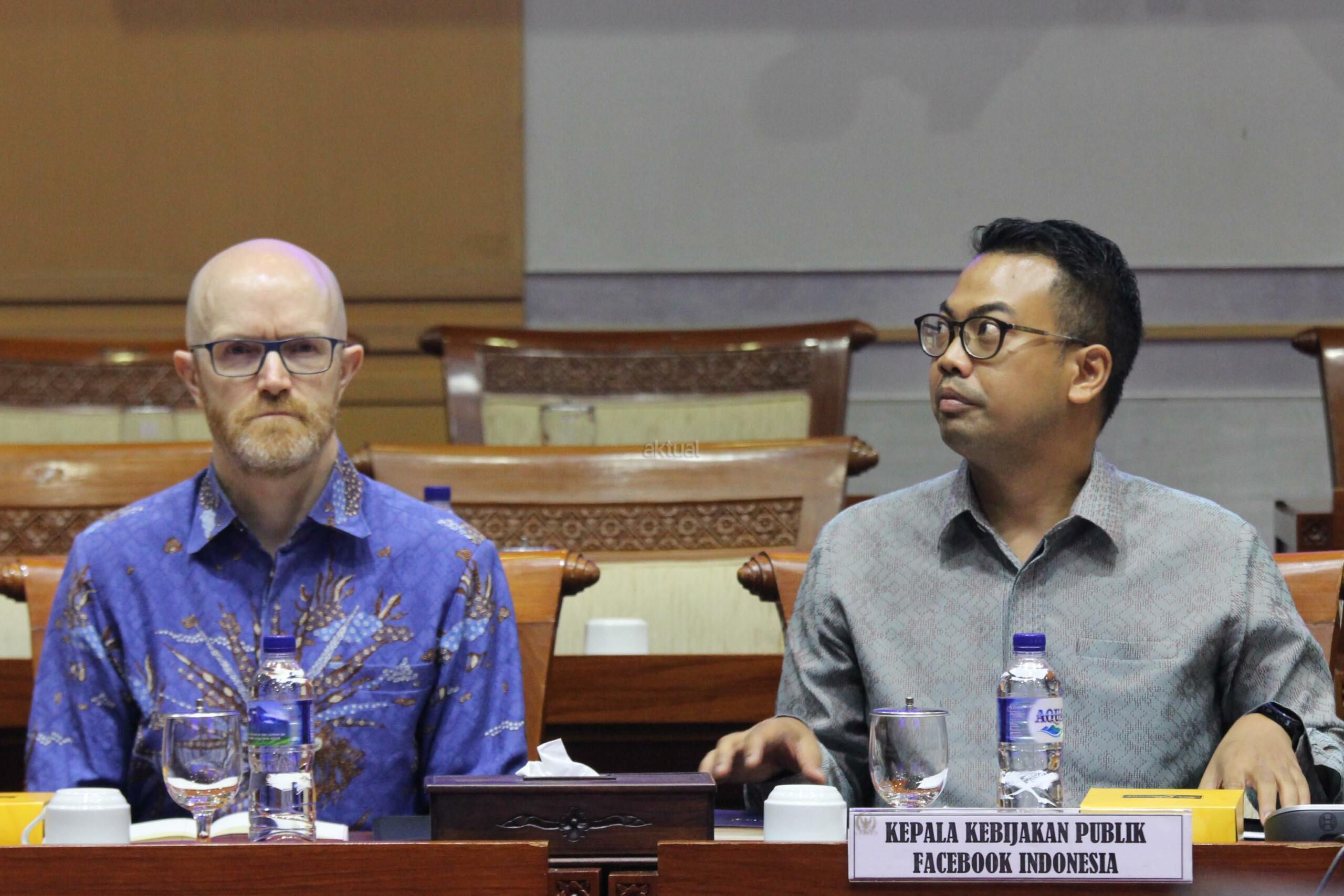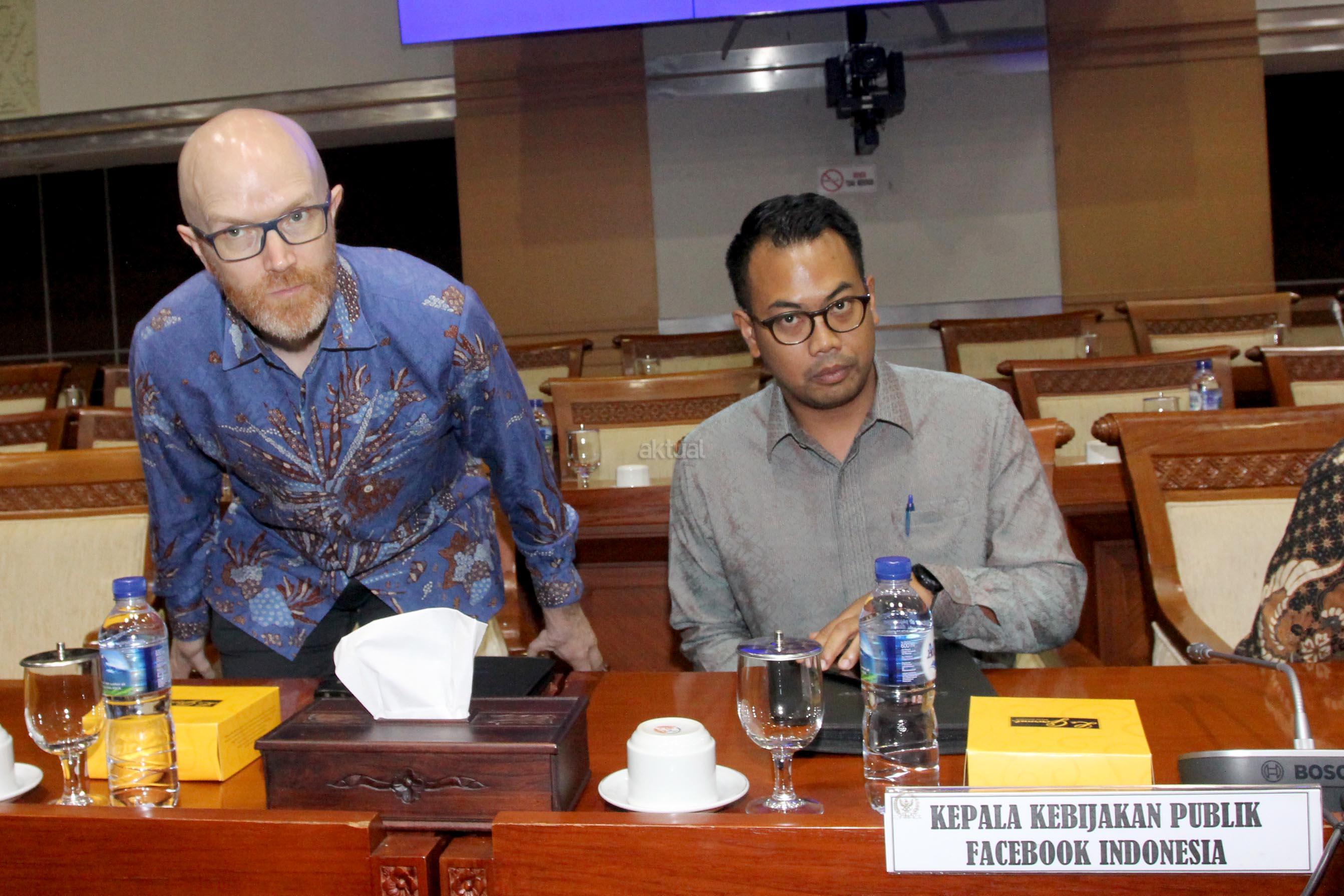 Kepala Kebijakan Publik Facebook Indonesia Ruben Hattari (kedua dari kiri) bersama Vice President of Public Policy Facebook Asia Pasific Simon Milner (kiri), menyampaikan penjelasan di hadapan anggota Komisi I DPR pada Rapat Dengar Pendapat Umum, di Gedung Nusantara II, Kompleks Parlemen, Senayan, Jakarta, Selasa (16/4). Komisi I meminta penjelasan terkait dengan bocornya 1 juta lebih data pengguna Facebook di Indonesia nomer tiga di dunia setelah Amerika Serikat 70,6 juta akun dan Filipina sebanyak 1,1 juta akun, menyusul pengakuan mantan kepala riset perusahaan Konsultan Politik asal Inggris, Cambridge Analytica, Analytica Christopher Wylie, pada Maret 2018 lalu, bahwa Cambridge Analytica, membeli data yang disedot oleh peneliti dari University of Cambridge Aleksandr Kogan, dengan menggunakan aplikasi survei kepribadian, dimana praktik yang dilakukan sepanjang 2014 itu berhasil mengumpulkan data pribadi 87 juta pengguna Facebook, yang salah satunya digunakan untuk mendesain iklan politik calon Presiden Amerika Serikat, Donald Trump, dalam pemilihan presiden 2016 lalu dengan merancang berita bohong. AKTUAL/Tino Oktaviano