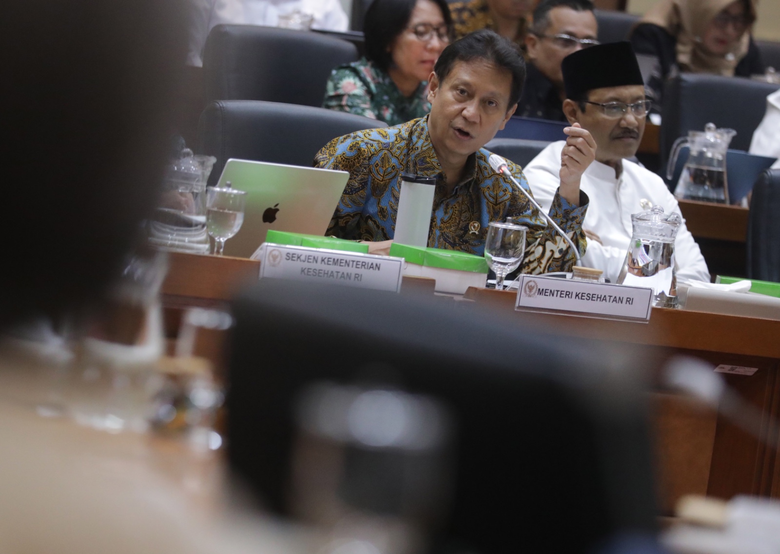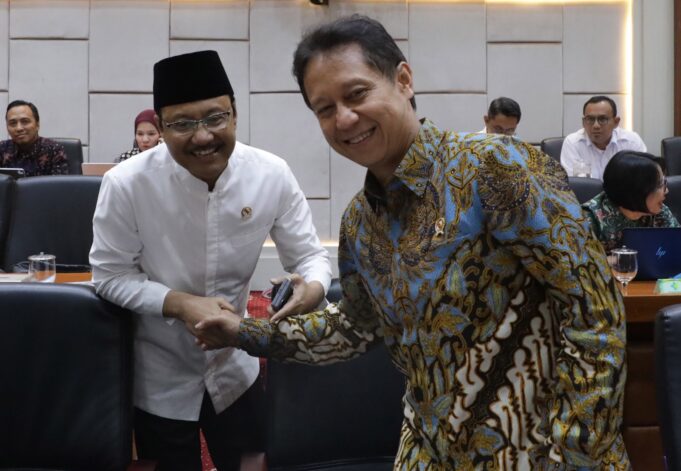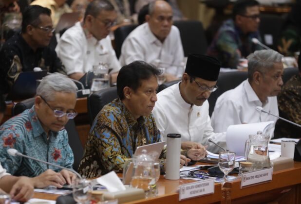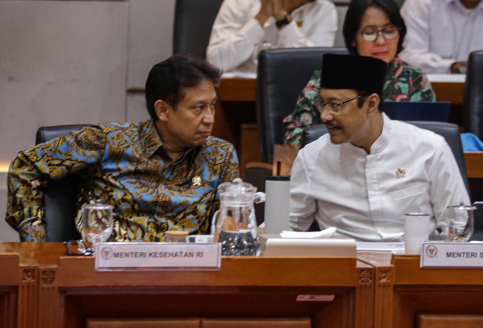Menteri Kesehatan Budi Gunadi Sadikin (kanan) bersama Menteri Sosial Saifullah Yusuf sebelum mengikuti rapat kerja dengan Komisi IX DPR di Kompleks Parlemen, Senayan, Jakarta, Rabu (15/4/2026). Hal ini menyusul baru sekitar 2 juta peserta PBI BPJS Kesehatan yang direaktivasi dari total 11 juta yang sebelumnya dinonaktifkan. DPR sebelumnya menyepakati seluruh 11 juta peserta tetap mendapatkan layanan selama masa transisi. Aktual/TINO OKTAVIANO