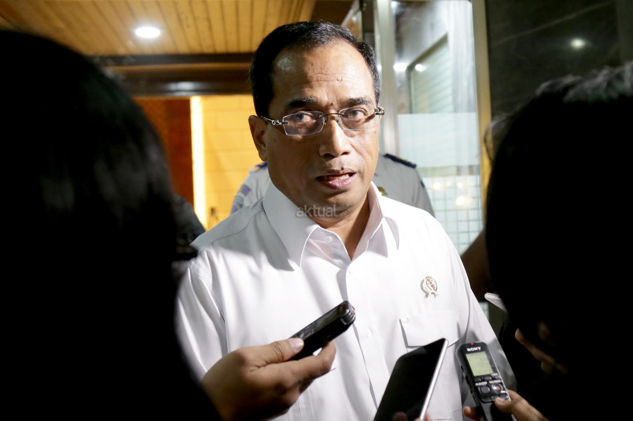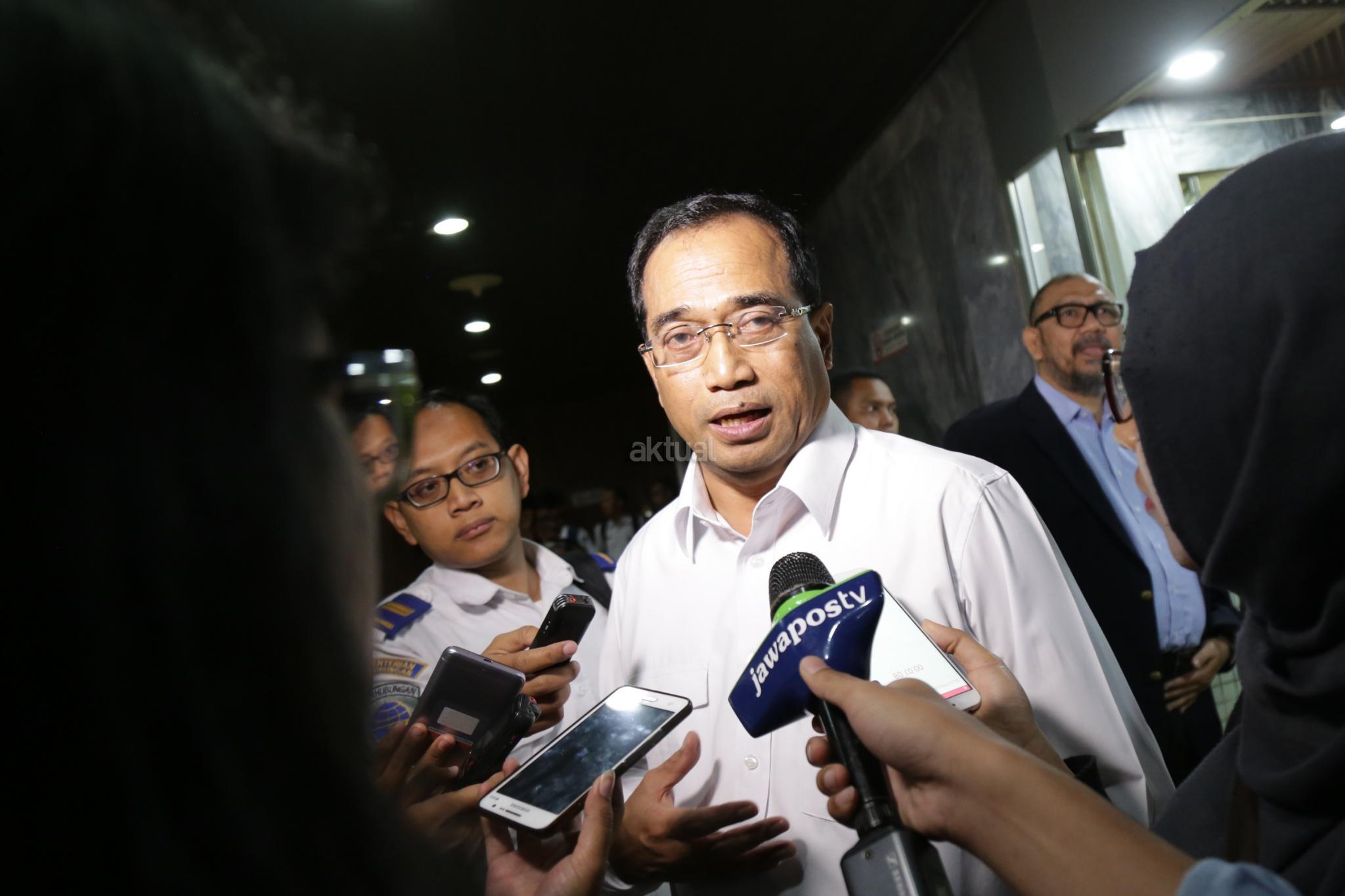 Menteri Perhubungan Budi Karya Sumadi menjawab pertanyaan wartawan usai rapat kerja dengan Komisi V DPR RI di gedung Parlemen, Senayan, Jakarta, Rabu (24/1/2018). Raker ini terkait tindak lanjut hasil pemeriksaan Badan Pemeriksa Keuangan (BPK) Semester I-2017 dan evaluasi pelaksanaan APBN Tahun 2017. AKTUAL/Tino Oktaviano