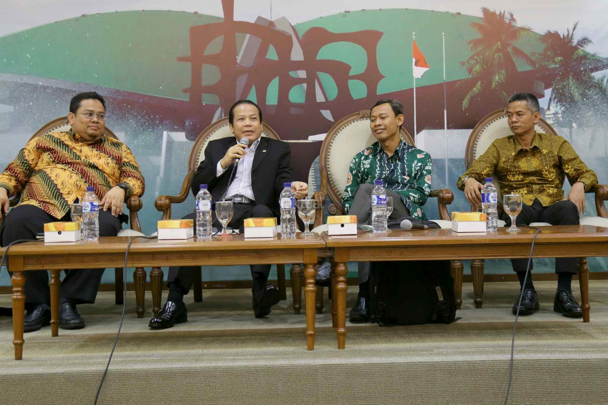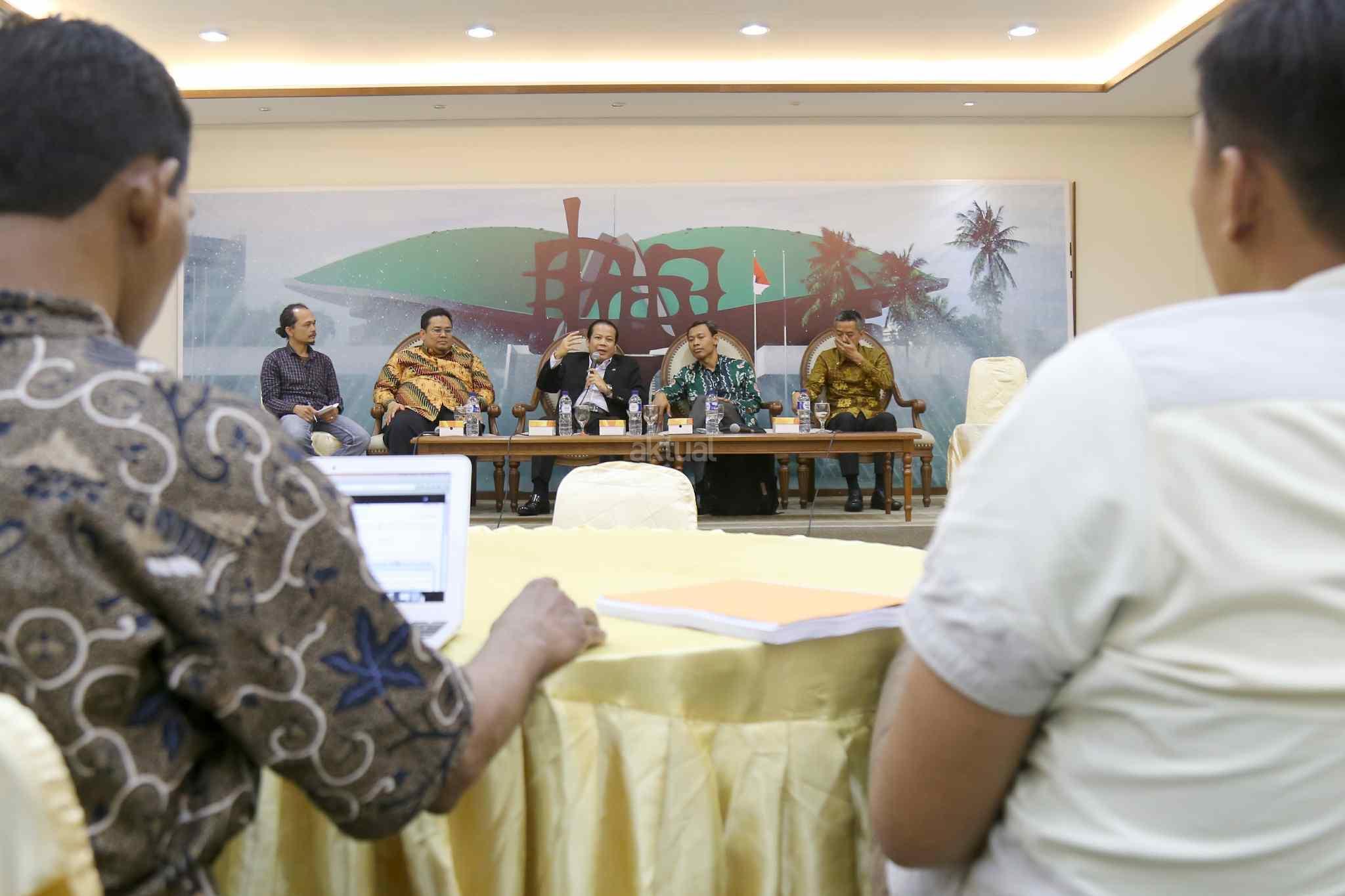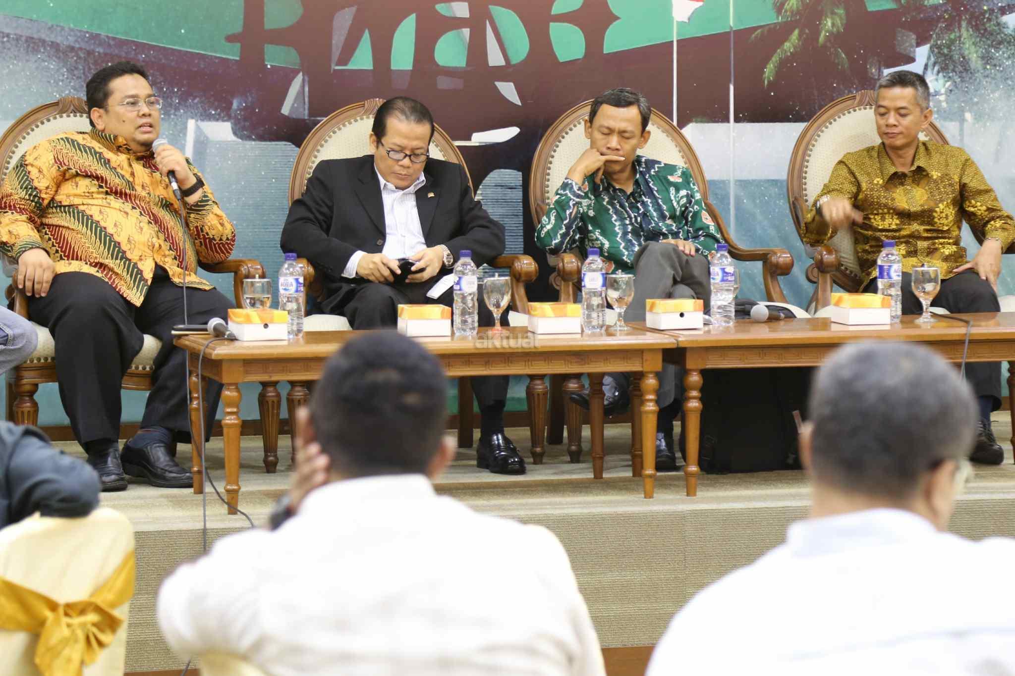 Dari kiri ke kanan, Komisioner Bawaslu Terpilih Rahmat Bagja, Wakil Ketua DPR Taufik Kurniawan, Komisioner KPU Terpilih Pramono U Tanthowi, Komisioner Terpilih KPU Wahyu Setiawan saat diskusi dialektika dengan tema “Komisioner Baru, Tantangan Baru” di press room DPR, Senayan, Jakarta, Kamis (6/4). Sejumlah tantangan menanti untuk diselesaikan para komisioner baru Komisi Pemilihan Umum dan Badan Pengawasan Pemilu. Seperti data kependudukan yang sebelumnya sempat menjadi persoalan dalam penyelenggaraan Pemilihan Kepala Daerah diselesaikan harus diselesaikan. AKTUAL/Tino Oktaviano