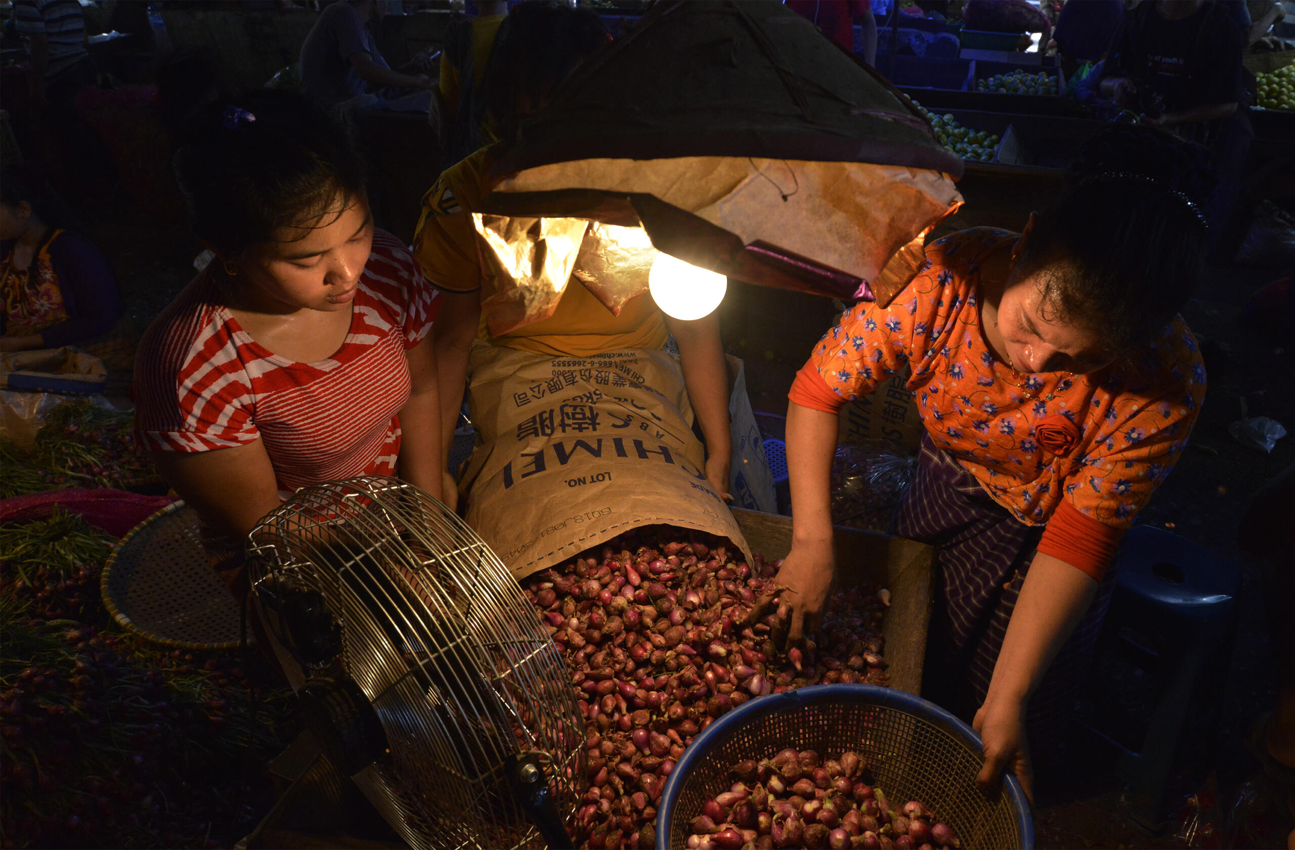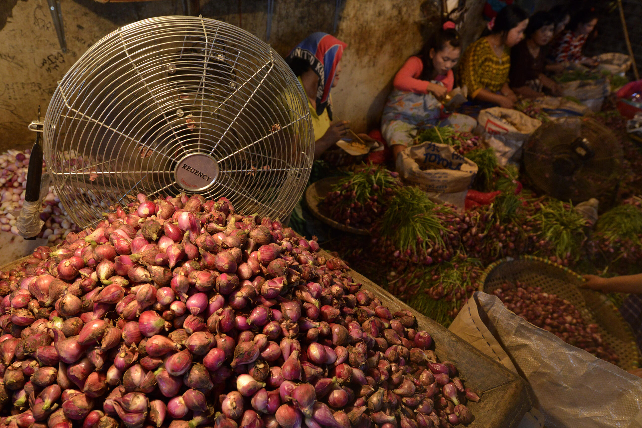 Pekerja membersihkan bawang merah di Pasar Induk Kramat Jati, Jakarta, Rabu (18/5). Pemerintah memastikan ketersediaan komoditas pangan seperti bawang merah, beras, dan cabai cukup untuk memenuhi kebutuhan sebelum dan setelah Ramadan, antara lain dengan cara memastikan keberadaan stok bawang merah di empat pasar induk senilai 300 ton per hari dan tambahan 8000 ton bawang merah dalam dua minggu ke depan. ANTARA FOTO/Rosa Panggabean/kye/16.