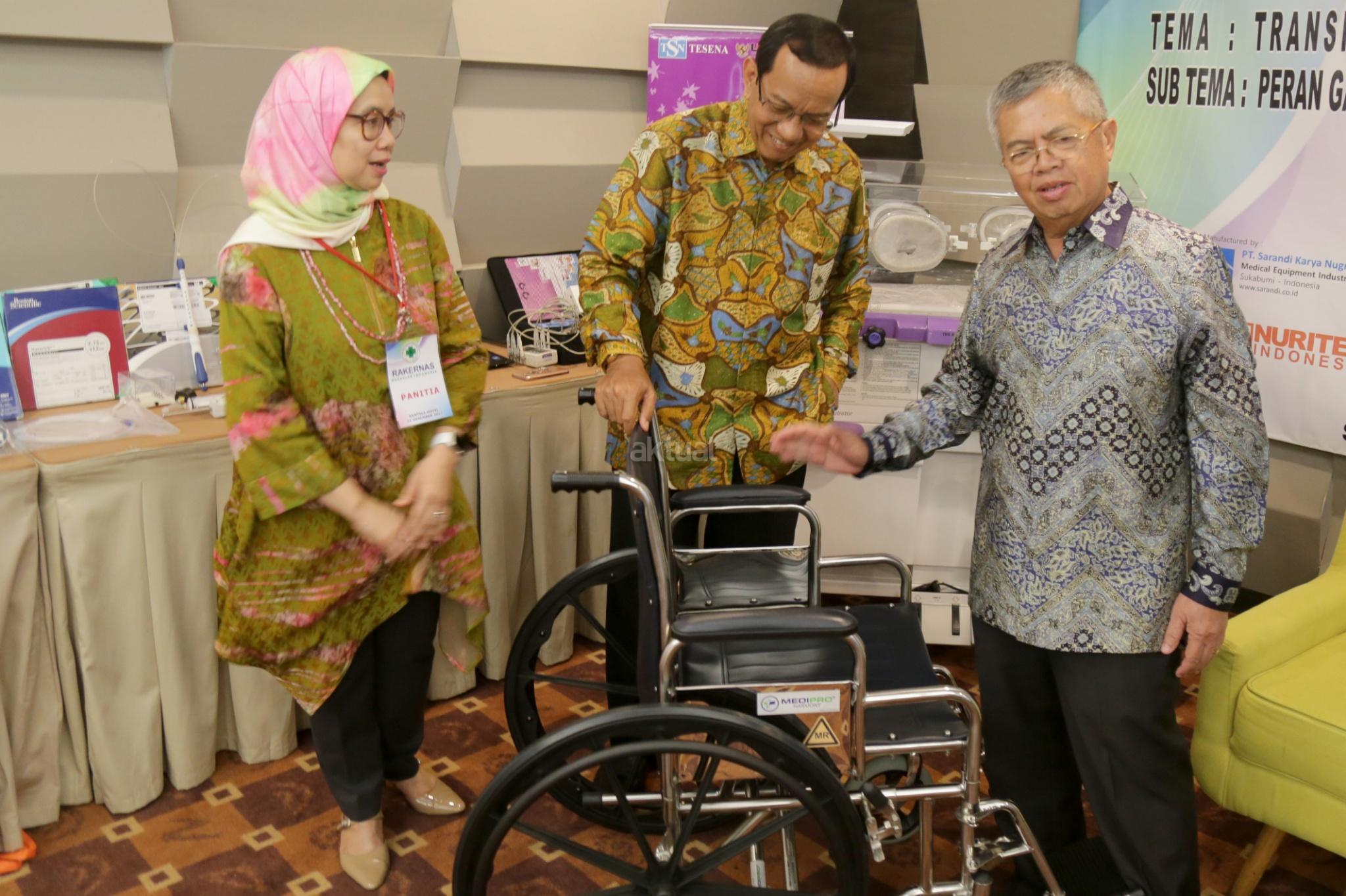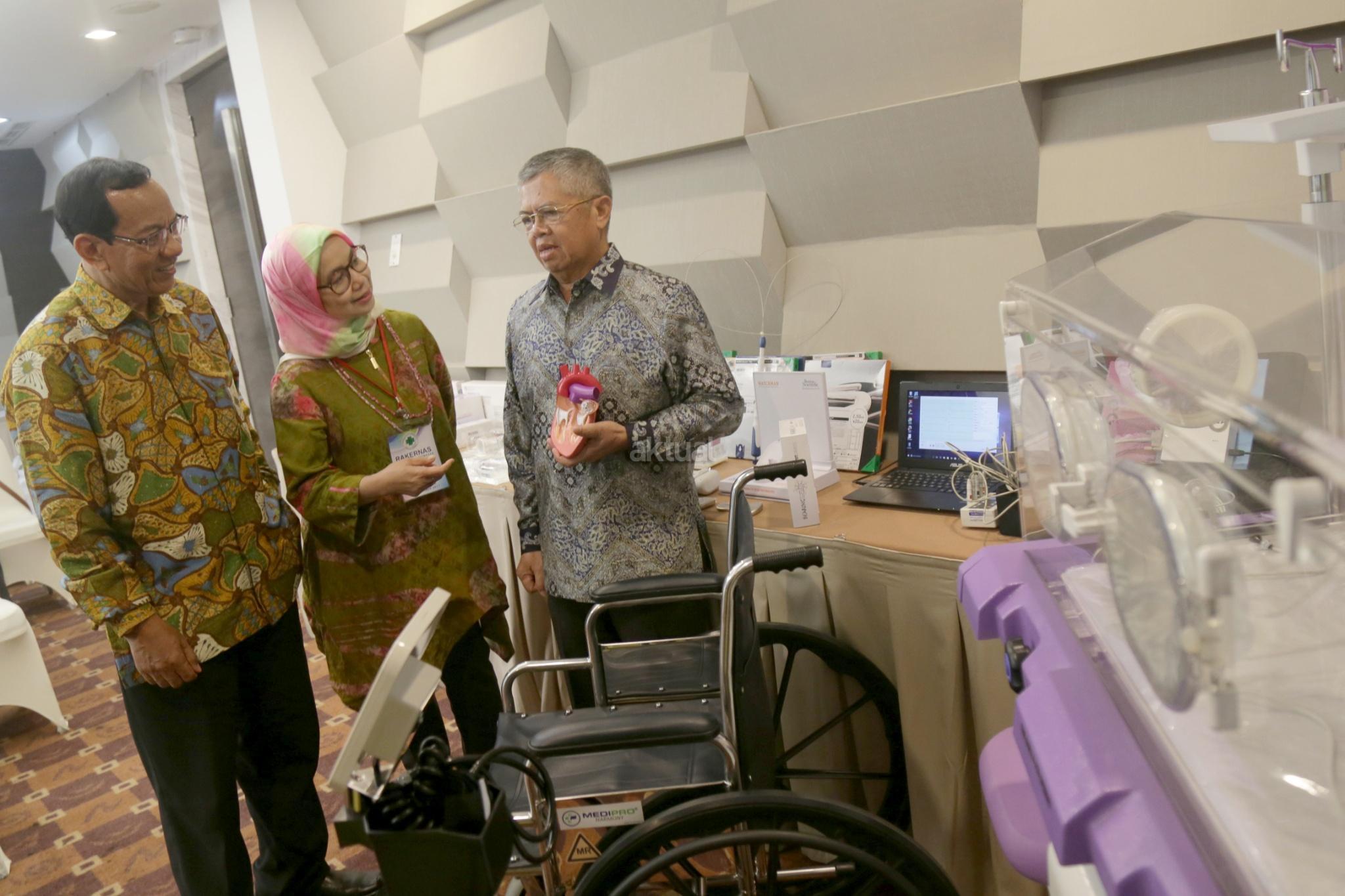 Ketua Perkumpulan Organisasi Perusahaan Alat-alat Kesehatan dan Laboratorium (Gakeslab) Indonesia Sugihadi (kiri) Ketua Umum Asosiasi Produsen Alat Kesehatan Indonesia (ASPAKI) Ade Tarya Hidayat (kanan) dan Ketua Panitia Rakernas Gakeslab 2017 Ati Saraswati (tengah) berbincang sambil melihat alat kesehatan produk Indonesia di Jakarta, Rabu (13/12/2017). Rakernas Gakeslab 2017 menegaskan kembali komitmen untuk nenyediakan alat kesehatan berkualitas yabg mengutamakan keselamatan pasien di Indonesia. AKTUAL/Tino Oktaviano