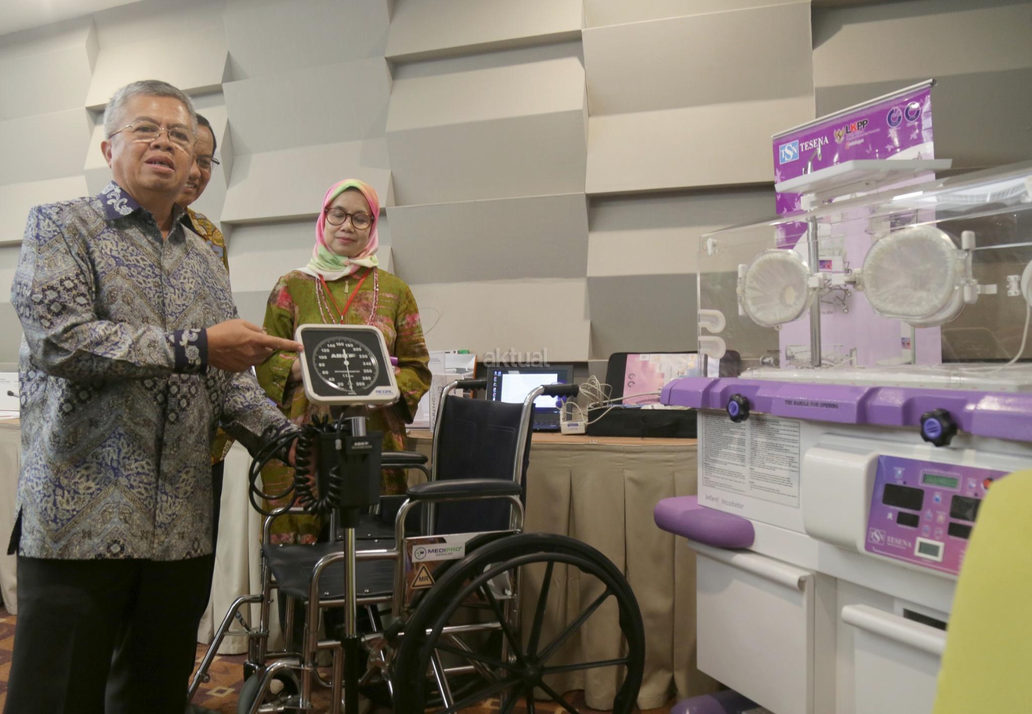 Ketua Perkumpulan Organisasi Perusahaan Alat-alat Kesehatan dan Laboratorium (Gakeslab) Indonesia Sugihadi (tengah) Ketua Umum Asosiasi Produsen Alat Kesehatan Indonesia (ASPAKI) Ade Tarya Hidayat (kiri) dan Ketua Panitia Rakernas Gakeslab 2017 Ati Saraswati (kanan) berbincang sambil melihat alat kesehatan produk Indonesia di Jakarta, Rabu (13/12/2017). Rakernas Gakeslab 2017 menegaskan kembali komitmen untuk nenyediakan alat kesehatan berkualitas yabg mengutamakan keselamatan pasien di Indonesia. AKTUAL/Tino Oktaviano