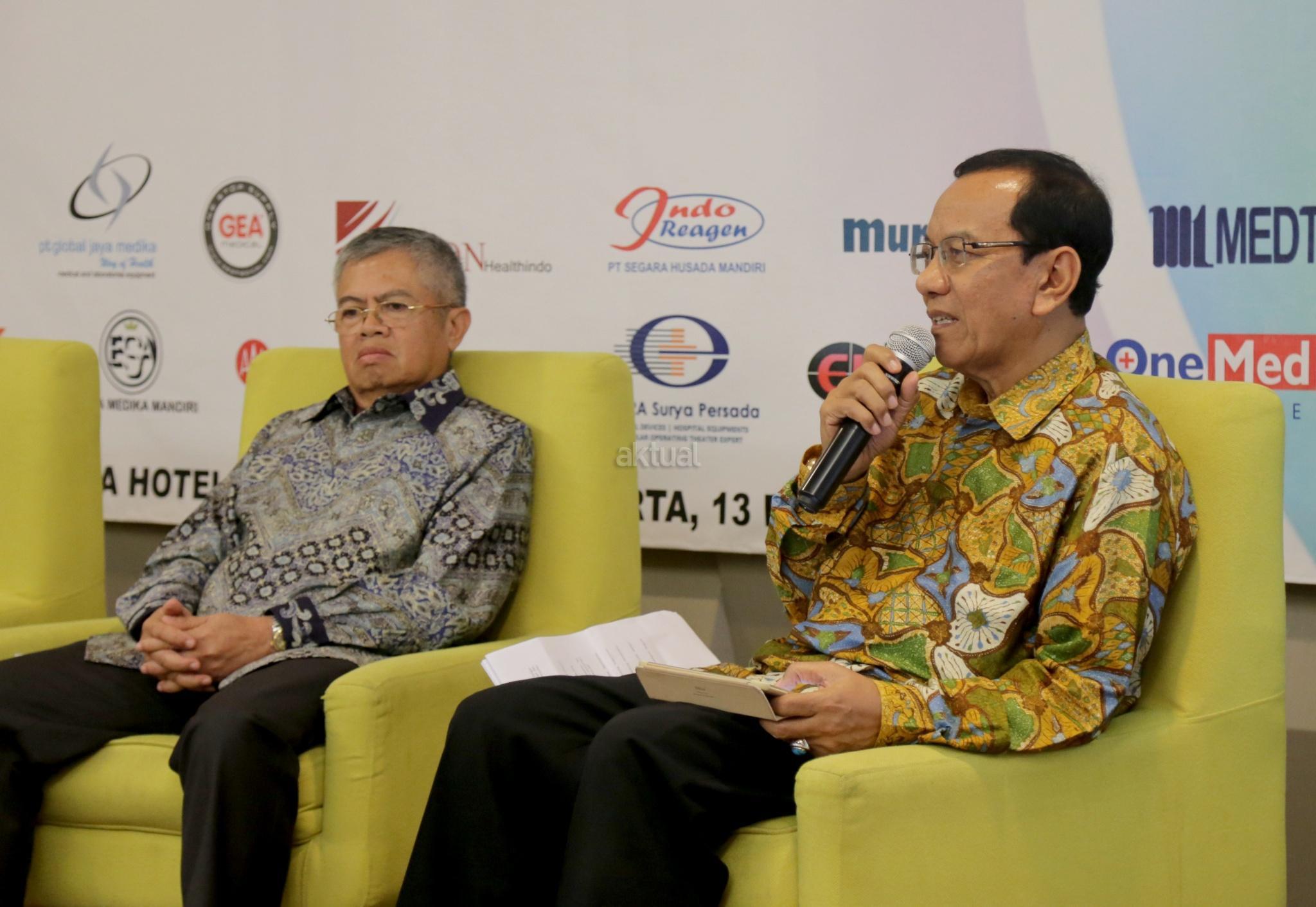 Ketua Perkumpulan Organisasi Perusahaan Alat-alat Kesehatan dan Laboratorium (Gakeslab) Indonesia Sugihadi (kanan) dan Ketua Umum Asosiasi Produsen Alat Kesehatan Indonesia (ASPAKI) Ade Tarya Hidayat (kiri) menjawab pertanyaan wartawan disela Rakernas Gakeslab 2017 di Jakarta, Rabu (13/12/2017). Rakernas Gakeslab 2017 menegaskan kembali komitmen untuk nenyediakan alat kesehatan berkualitas yabg mengutamakan keselamatan pasien di Indonesia. AKTUAL/Tino Oktaviano