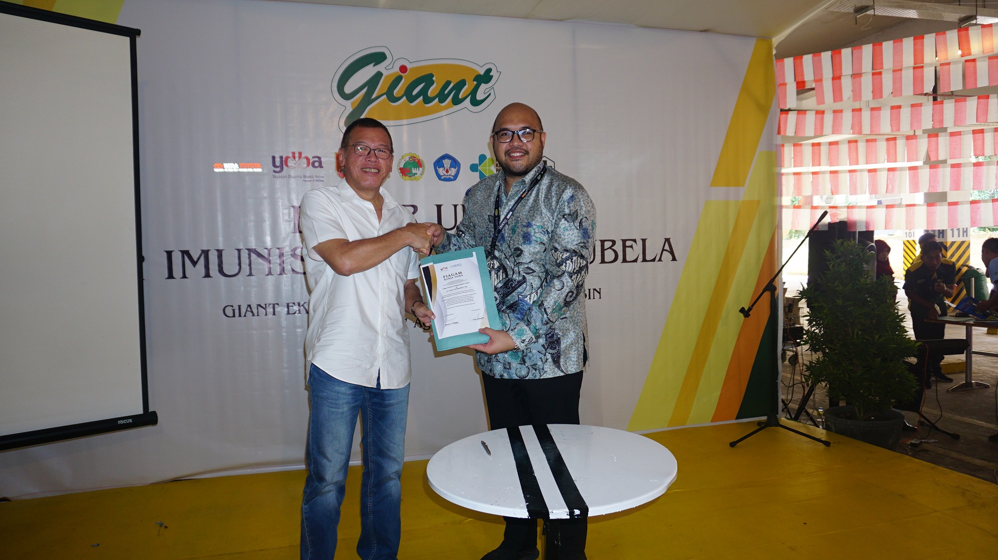 Ketua Pengurus Yayasan Dharma Bhakti Astra (YDBA) Henry C. Widjaja (kiri) bersama General Manager Corporate Affairs Giant Tony Mampuk memperlihatkan piagam kerjasama antara YDBA dan Giant di Giant Ekstra Kertak Hanyar, Banjarmasin, Kalimantan Selatan, Selasa (7/8). Penandatangan piagam kerjasama ini sebagai komitmen YDBA bersama Giant untuk melakukan pembinaan kepada UMKM Mitra YDBA di Kalimantan Selatan dengan tujuan untuk meningkatkan potensi dan mengembangkan pasar UMKM. AKTUAL/Pool