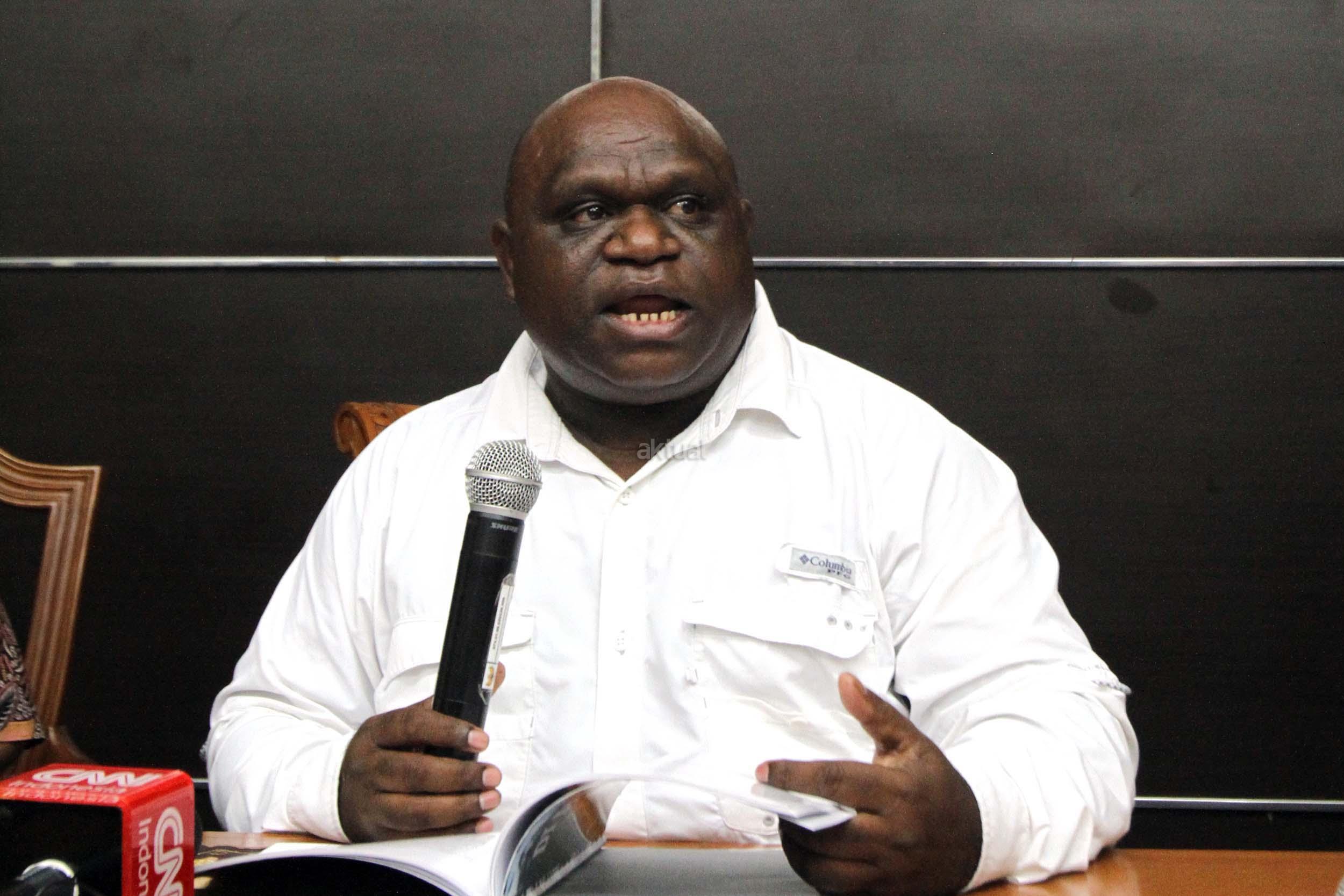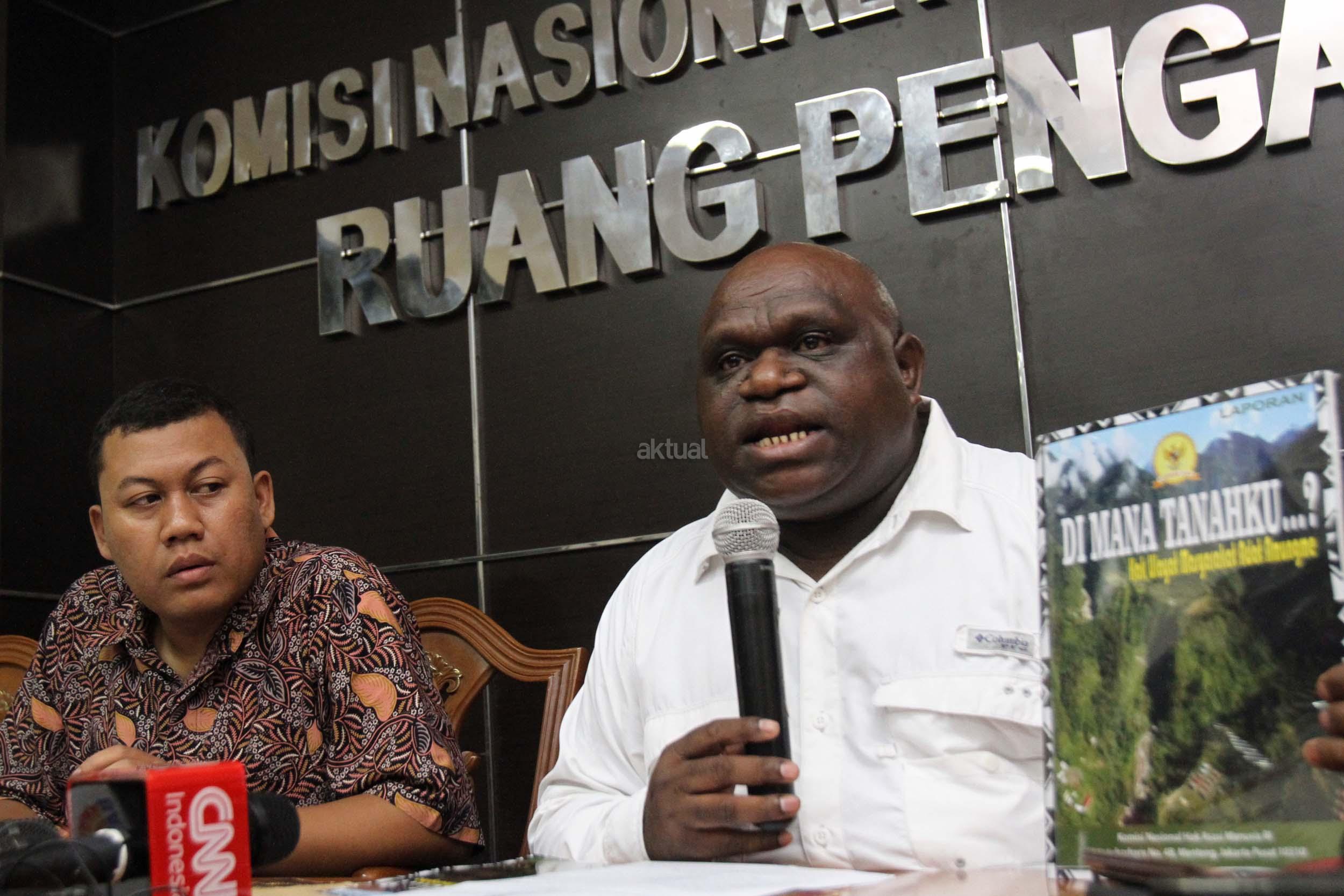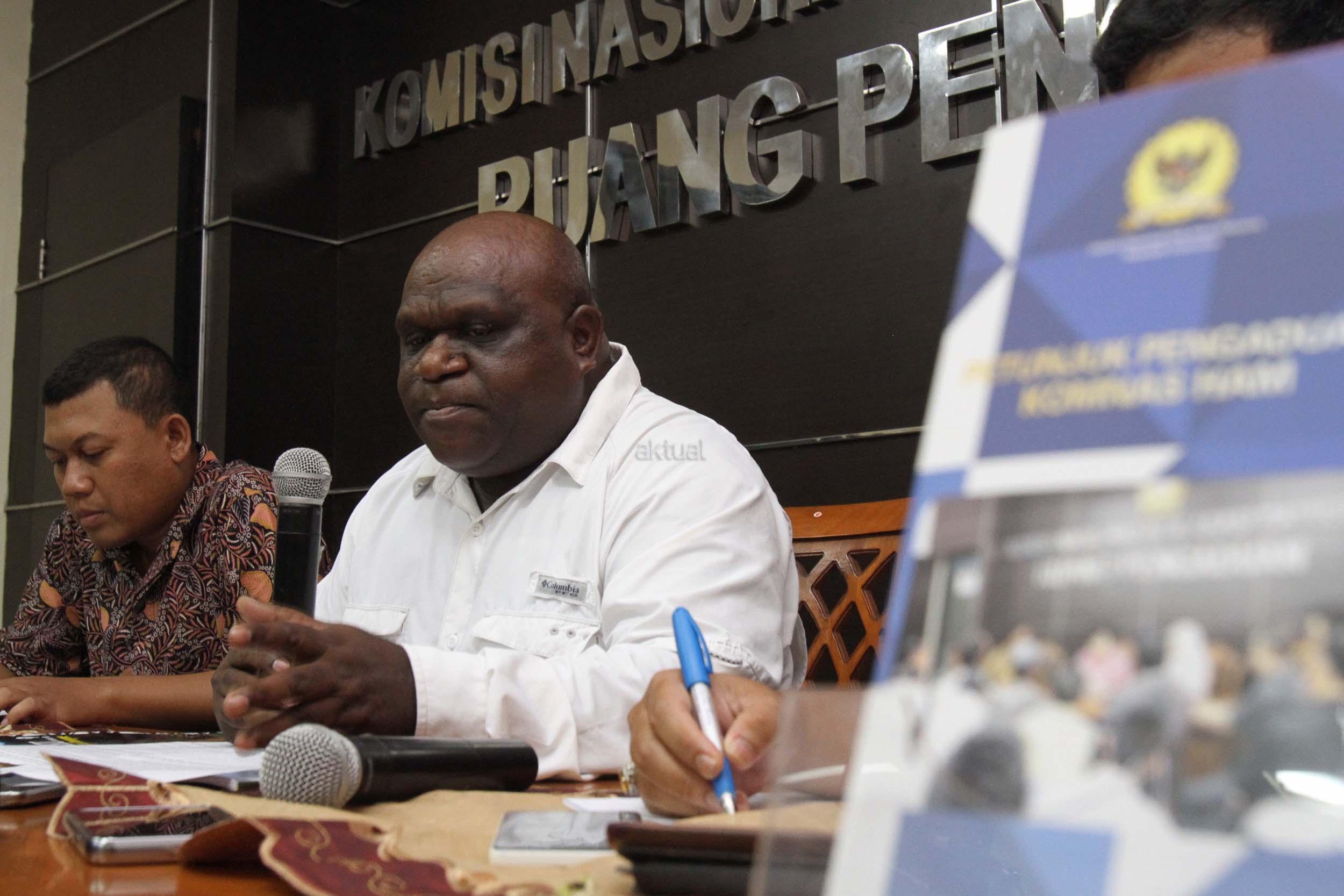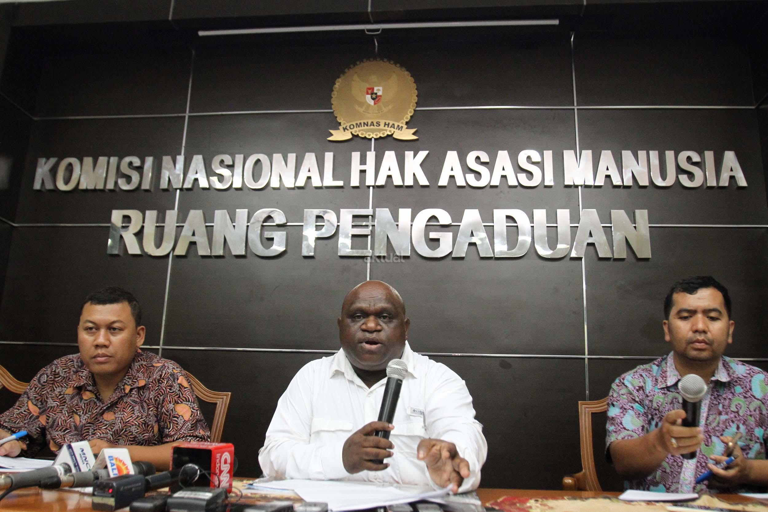 Komisioner Subkomisi Pemantauan dan Penyelidikan Komisi Nasional Hak Asasi Manusia (Komnas HAM) Natalius Pigai (tengah) memberi keterangan pers di Kantor Komnas HAM, Jakarta (24/2/2017). Komnas HAM merekomendasikan pemerintah Indonesia? untuk memastikan PT FI menyelesaikan ganti rugi tanah masyarakat suku Amungme dan mendorong adanya kepastian jaminan agar masyarakat adat suku Amungme mendapatkan saham PT Freeport Indonesia. AKTUAL/Munzir
