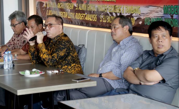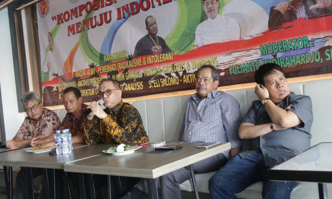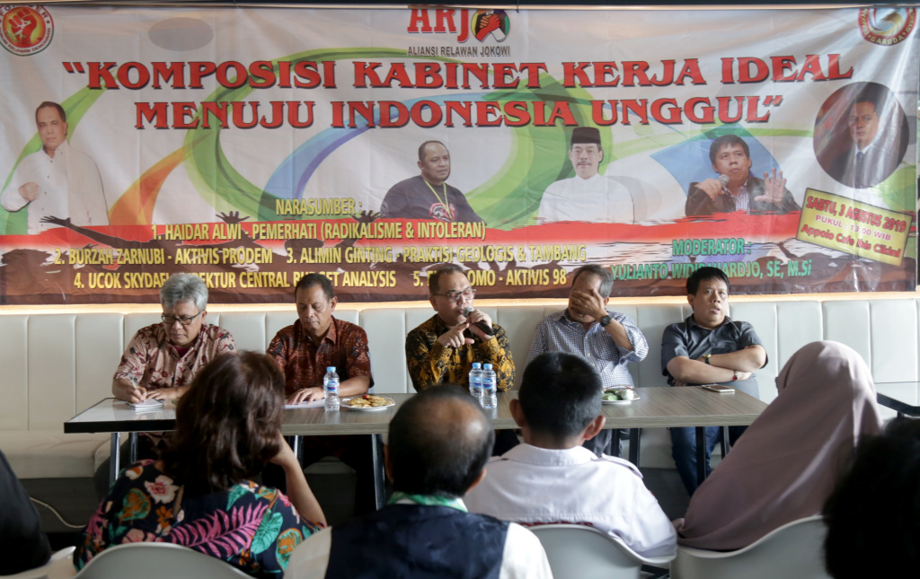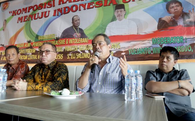 Tokoh Gerakan Anti Radikalisme & Intoleransi Haidar Alwi (kedua kanan) bersama Praktisi Geologis dan Tambang Alimin Ginting (kiri), Aktivis Prodem Bursa Zanubi (kedua kanan) dan Direktur Central Budget Analysis Ucok Skydafi (kanan) saat diskusi publik dengan tema, "Komposisi Kabinet Kerja Ideal Menuju Indonesia Unggul" di Jakarta, Sabtu (3/8/2019). AKTUAL/Tino Oktaviano
