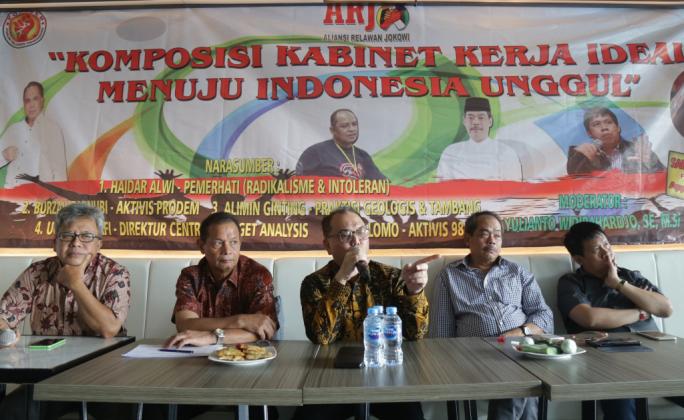 Tokoh Gerakan Anti Radikalisme & Intoleransi Haidar Alwi (tengah) bersama Praktisi Geologis dan Tambang Alimin Ginting (kedua kiri), Aktivis Prodem Bursa Zanubi (kedua kanan) dan Direktur Central Budget Analysis Ucok Skydafi (kanan) saat diskusi publik dengan tema, "Komposisi Kabinet Kerja Ideal Menuju Indonesia Unggul" di Jakarta, Sabtu (3/8/2019). AKTUAL/Tino Oktaviano