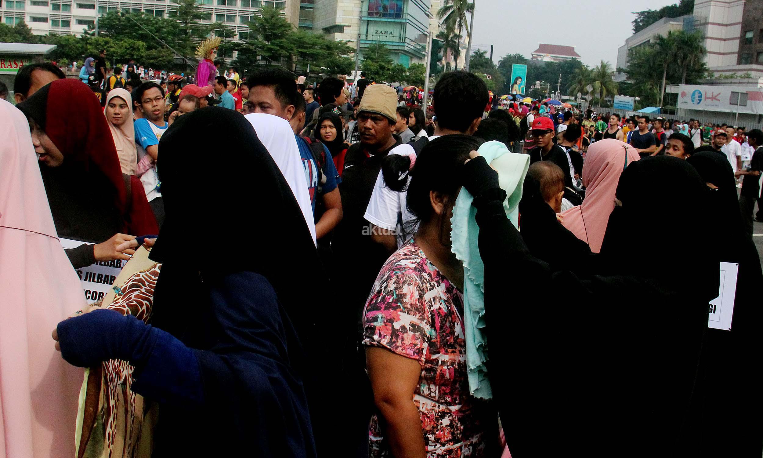 Anggota komunitas Da'wah on the Street memakai kan jilbab kepada masyarakat dalam acara Car Free Day, di kawasan Bunderan HI, Jakarta, Minggu (22/5/2016). Komunitas Da'wah on the Street membagi-bagikan jilbab gratis dan tak hanya membagikan jilbab. Mereka juga mengajarkan cara menggunakan jilbab yang syar'i.