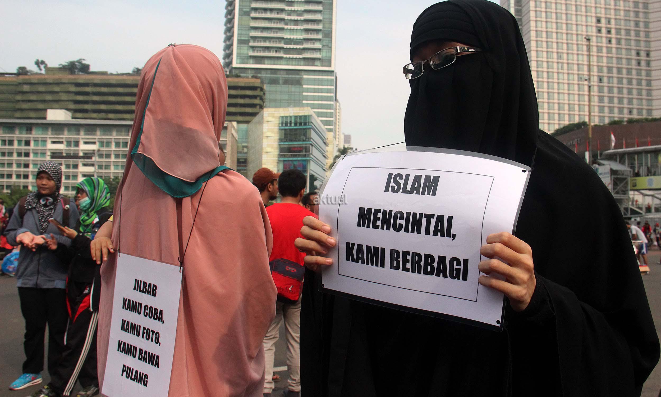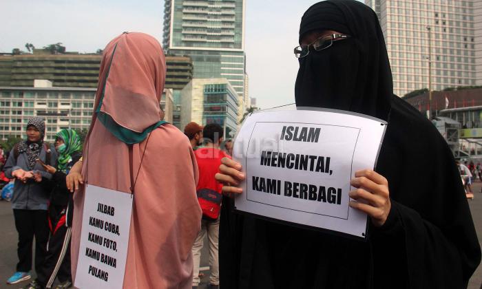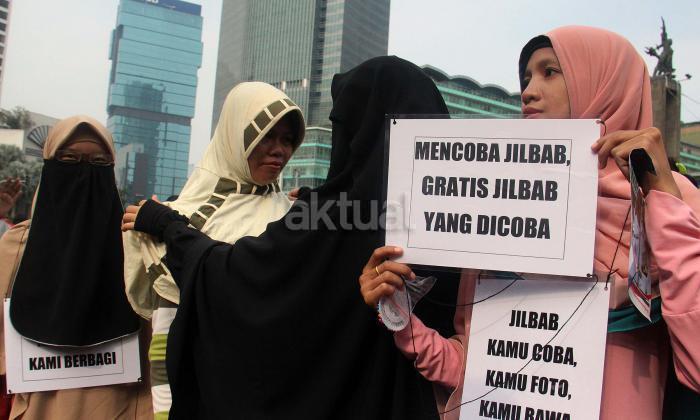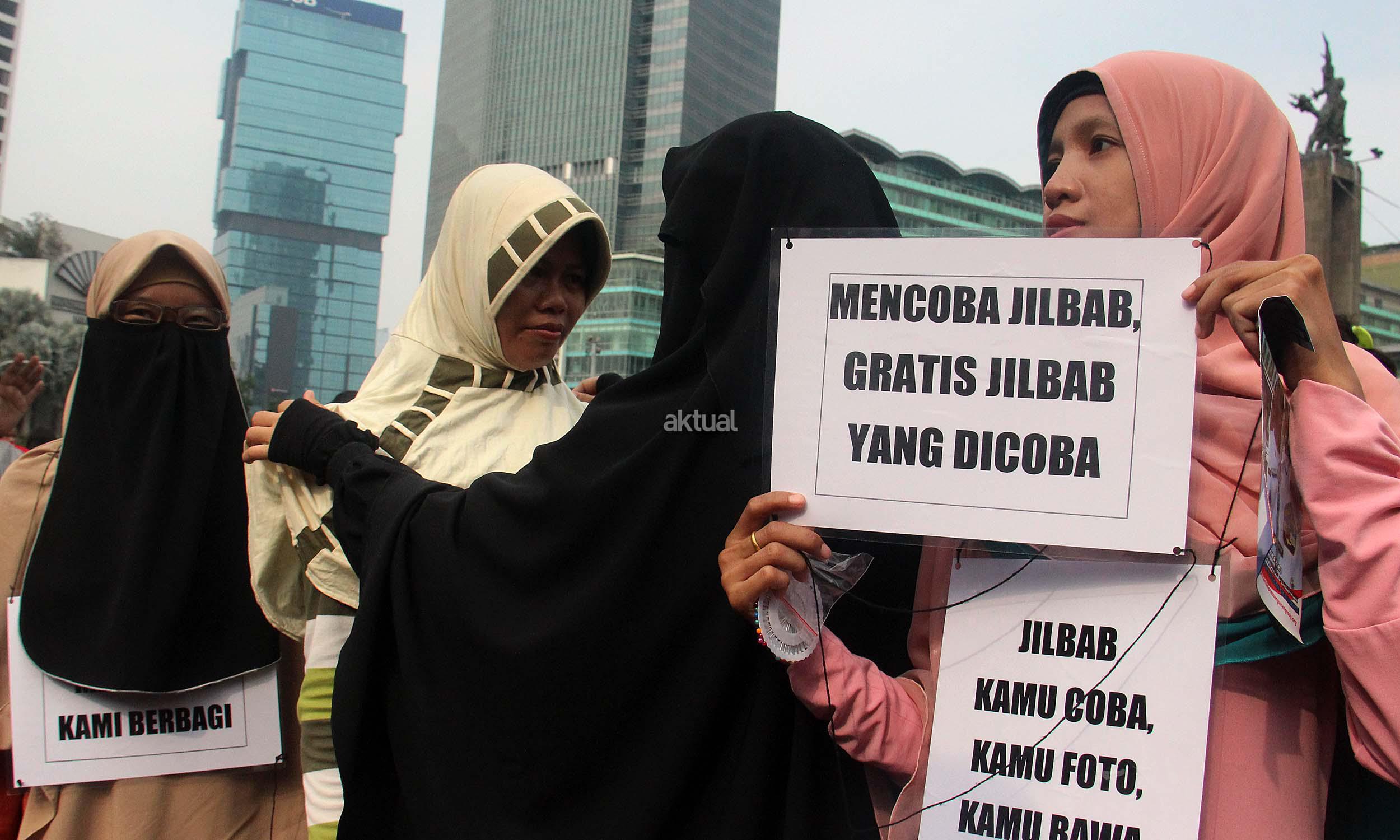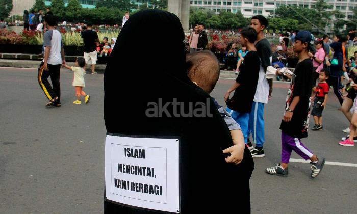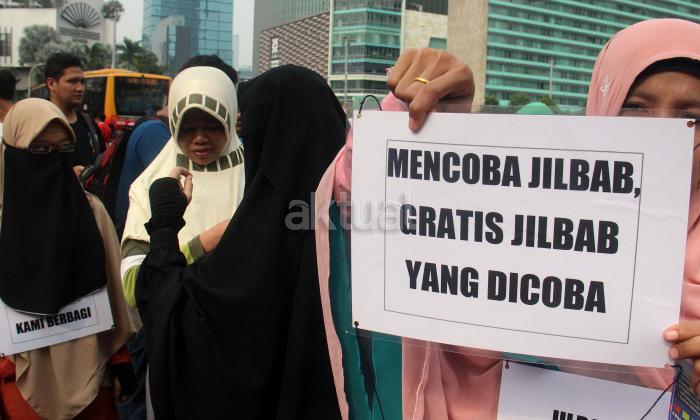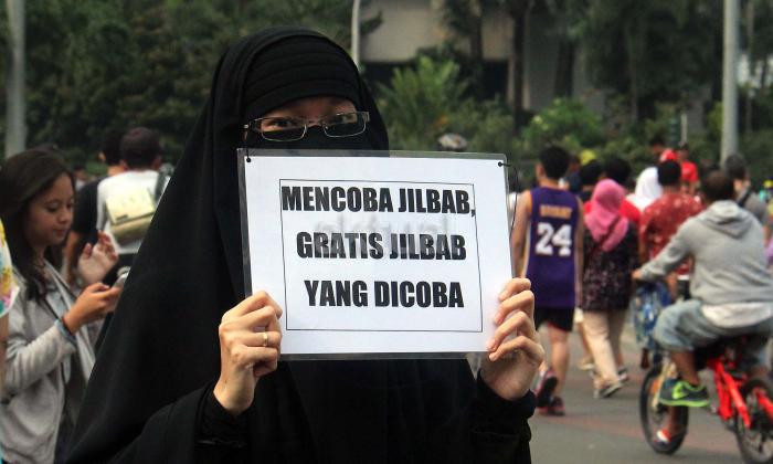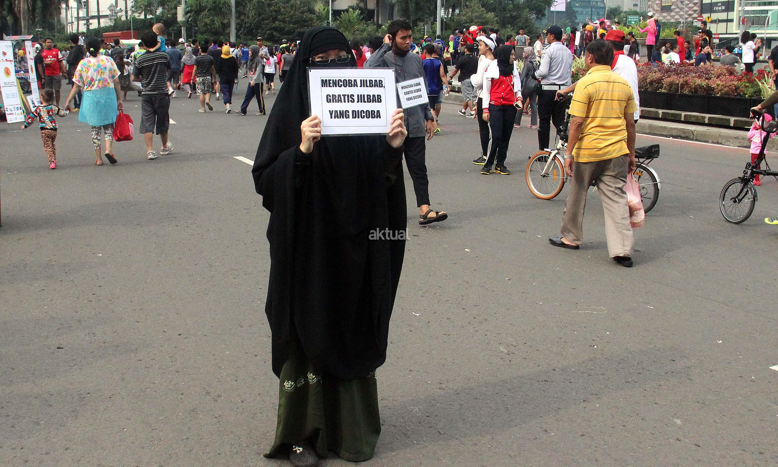 Terlihat anggota komunitas Da'wah on the Street memakai kan jilbab kepada masyarakat dalam acara Car Free Day, di kawasan Bunderan HI, Jakarta, Minggu (22/5/2016). Komunitas Da'wah on the Street membagi-bagikan jilbab gratis dan tak hanya membagikan jilbab. Mereka juga mengajarkan cara menggunakan jilbab yang syar'i.