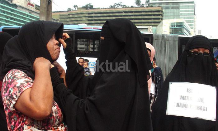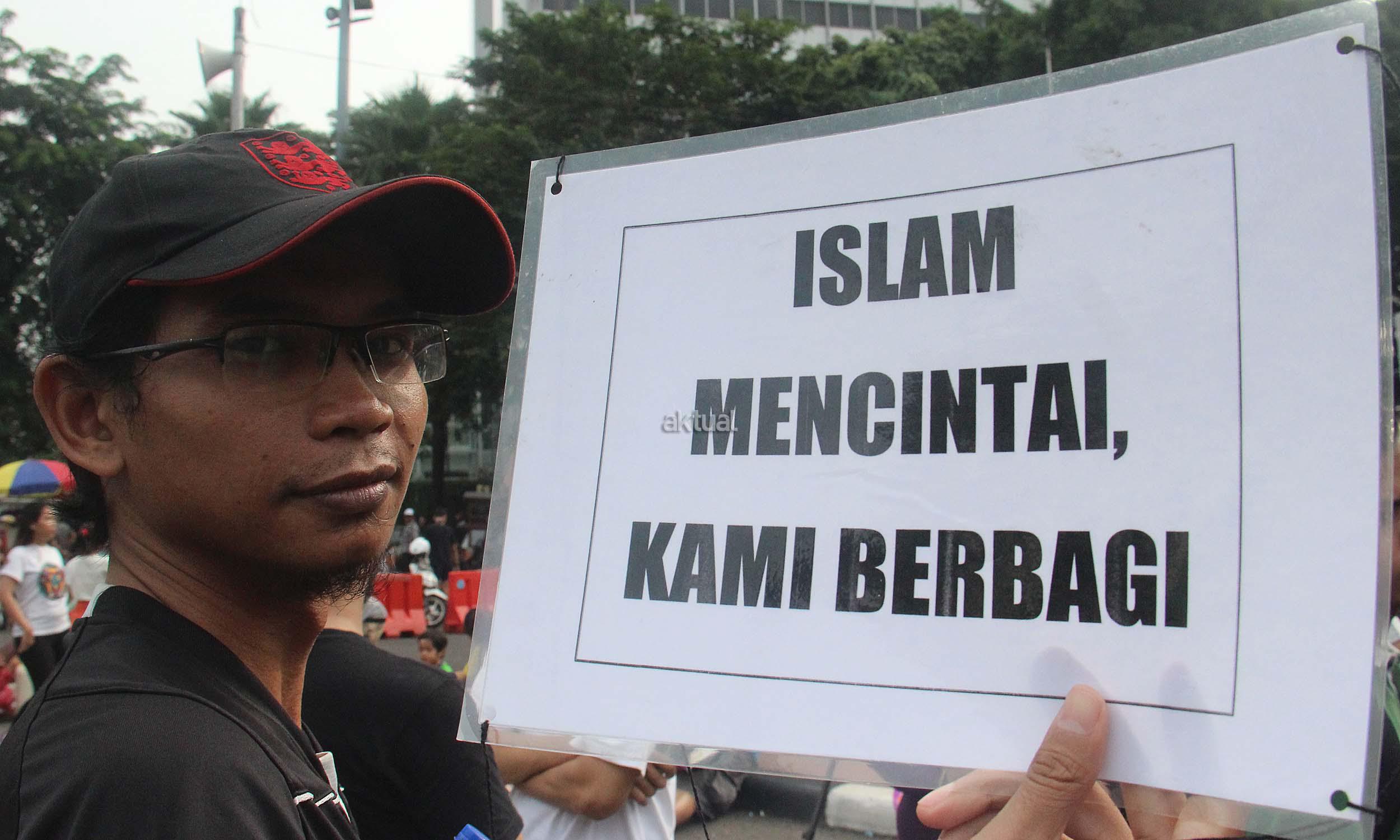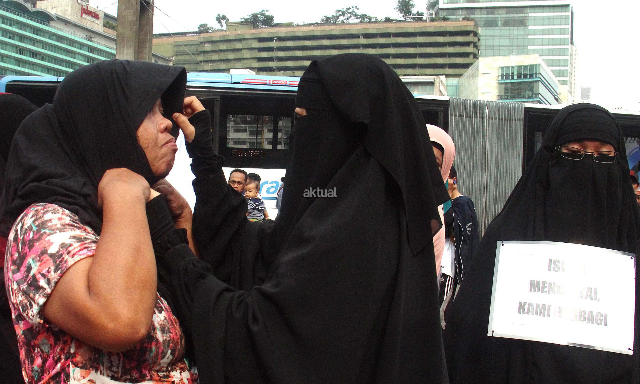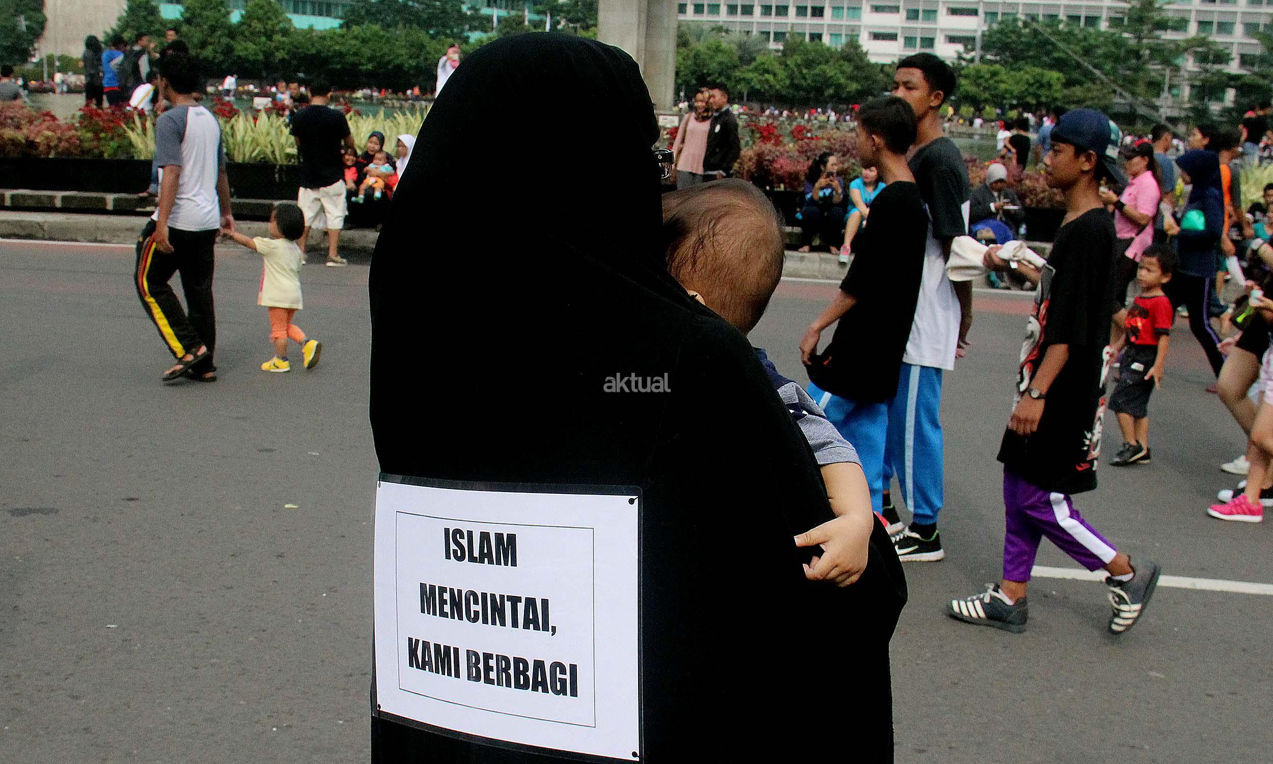 Terlihat anggota komunitas Da'wah on the Street memakai kan jilbab kepada masyarakat dalam acara Car Free Day, di kawasan Bunderan HI, Jakarta, Minggu (22/5/2016). Komunitas Da'wah on the Street membagi-bagikan jilbab gratis dan tak hanya membagikan jilbab. Mereka juga mengajarkan cara menggunakan jilbab yang syar'i.