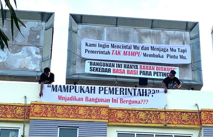 Pelalawan, Aktual.com – Gerakan pemuda yang tergabung dalam Komunitas Seniman Bergerak (KSB) menuntut Pemerintah Kabupaten (PemKab) Pelalawan segera mengaktifkan Pasar Modern Sorek (PMS) secepatnya. Tuntutan di sampaikan melalui pemasangan spanduk di atas atap gedung PMS.