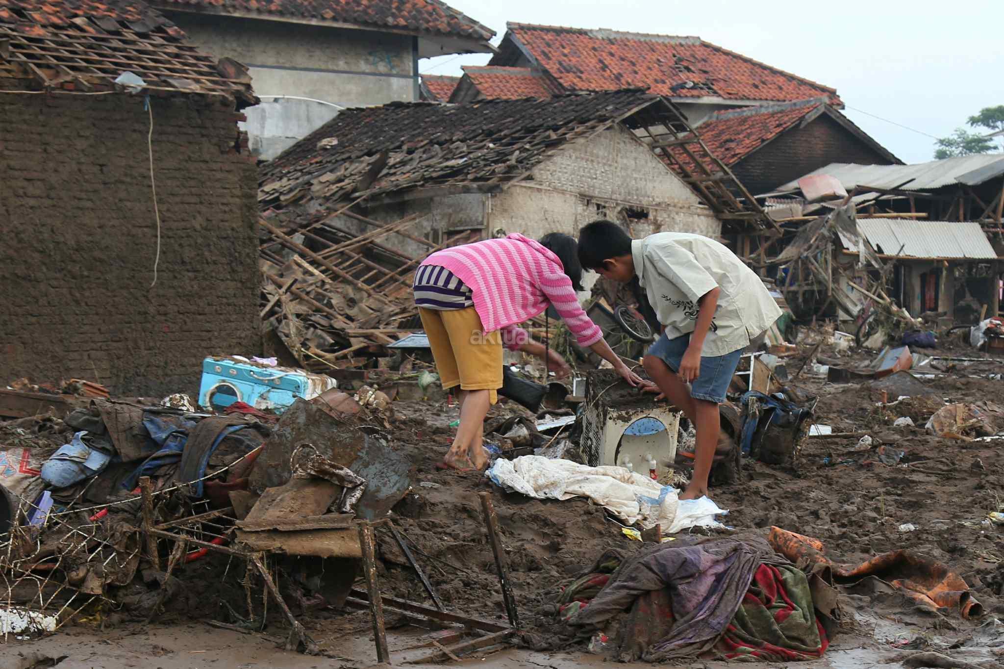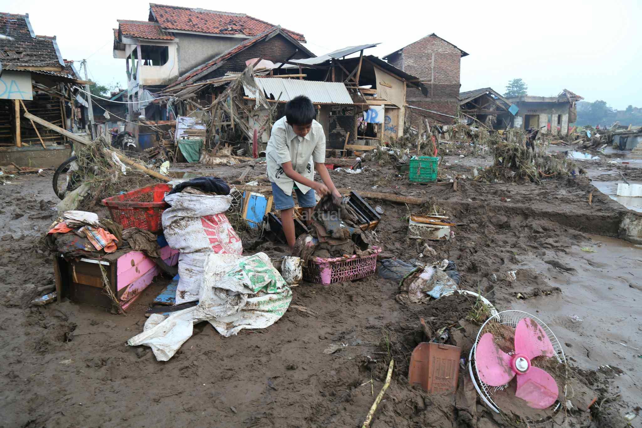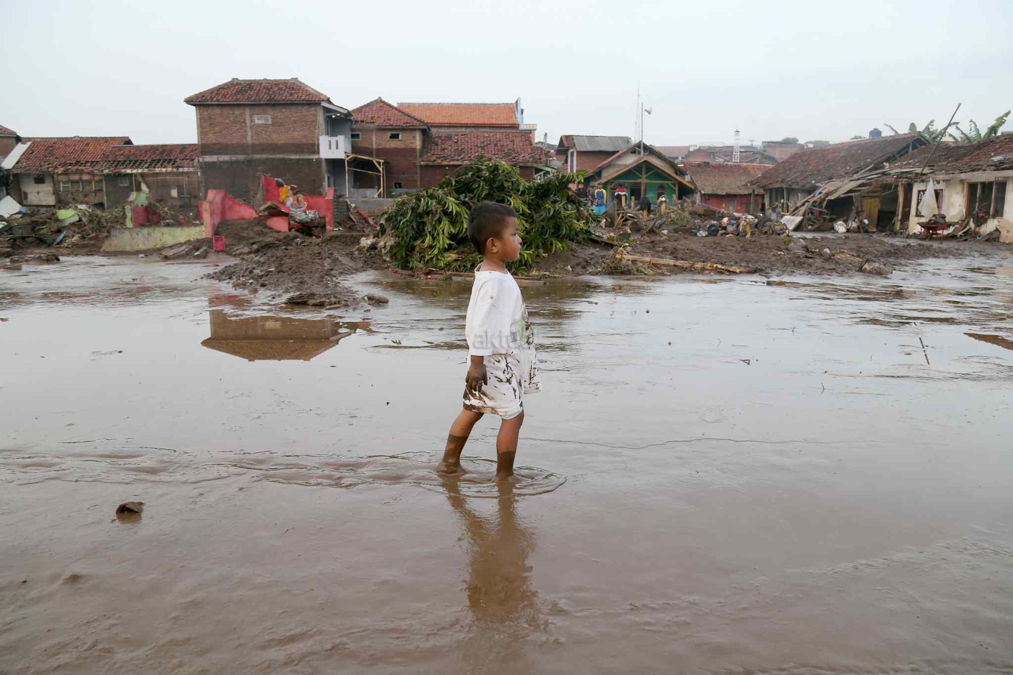Seorang anak melintas jalanan lumpur diantara puing rumah yang terkena banjir bandang sungai Cimanuk, di Kecamatan Tarogong Kidul, Cimacan, Kabupaten Garut, Jawa Barat.