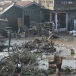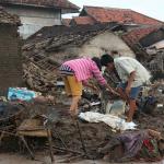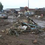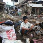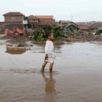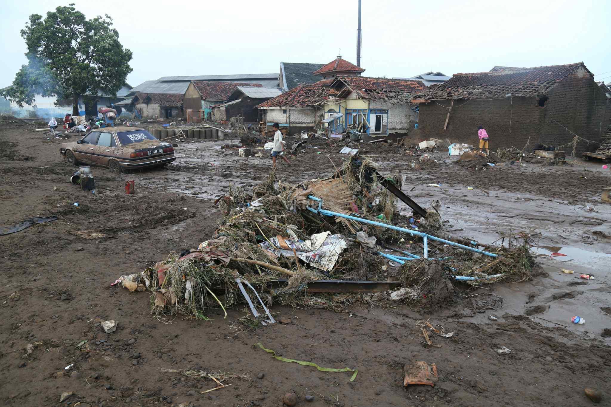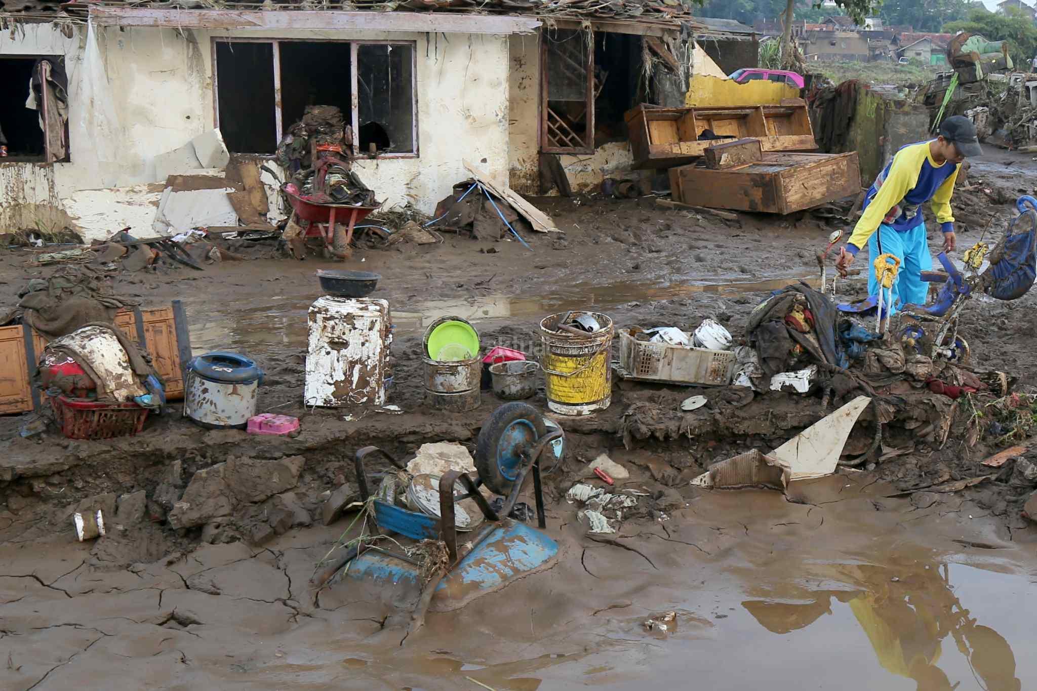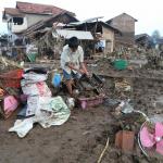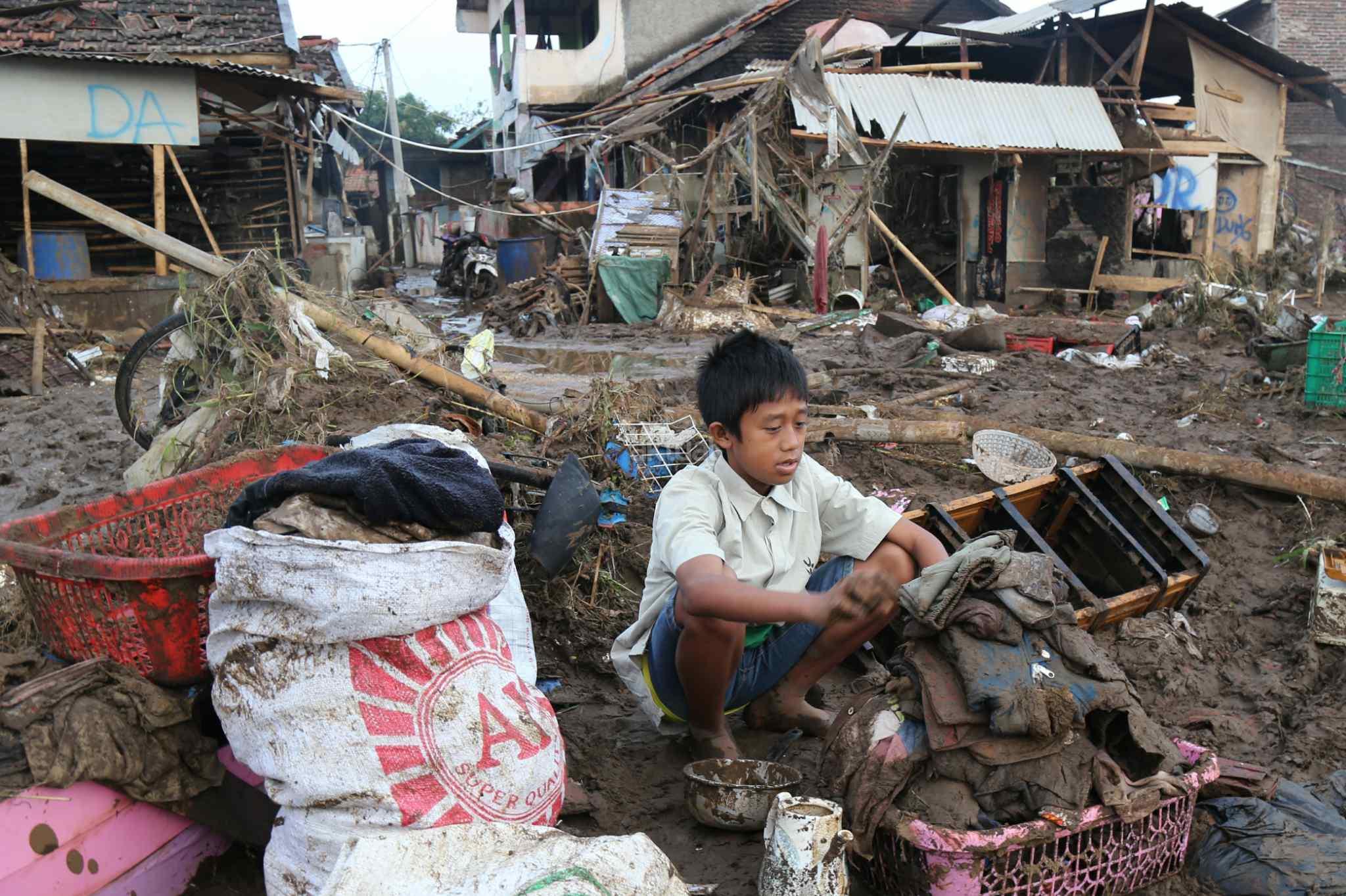 Seorang anak melintas jalanan lumpur diantara puing rumah yang terkena banjir bandang sungai Cimanuk, di Kecamatan Tarogong Kidul, Cimacan, Kabupaten Garut, Jawa Barat.