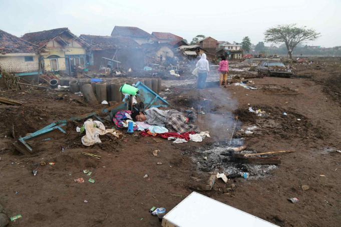 Warga tidur di halaman rumah yang roboh terkena banjir bandang sungai Cimanuk, di Kecamatan Tarogong Kidul, Cimacan, Kabupaten Garut, Jawa Barat.