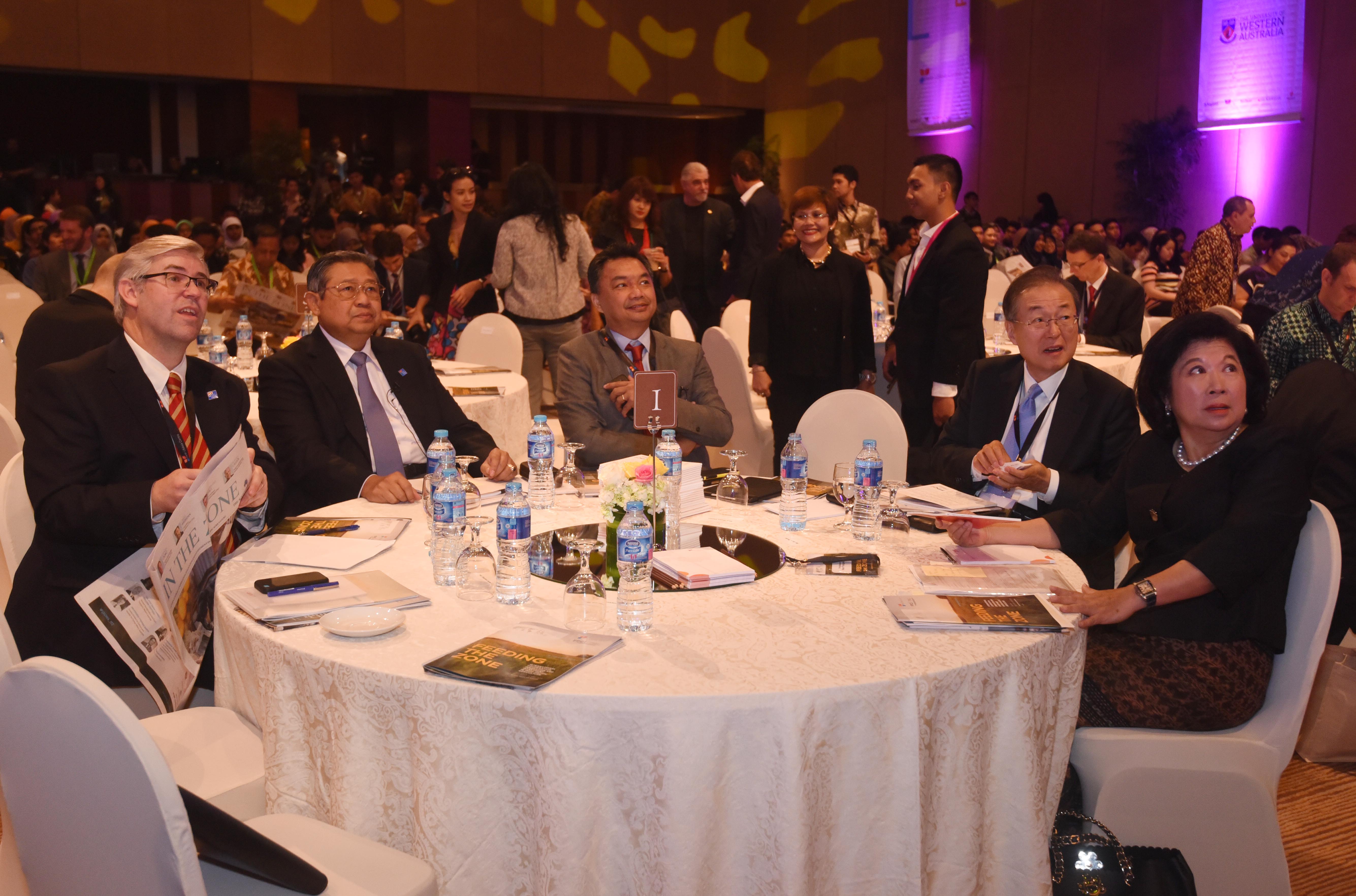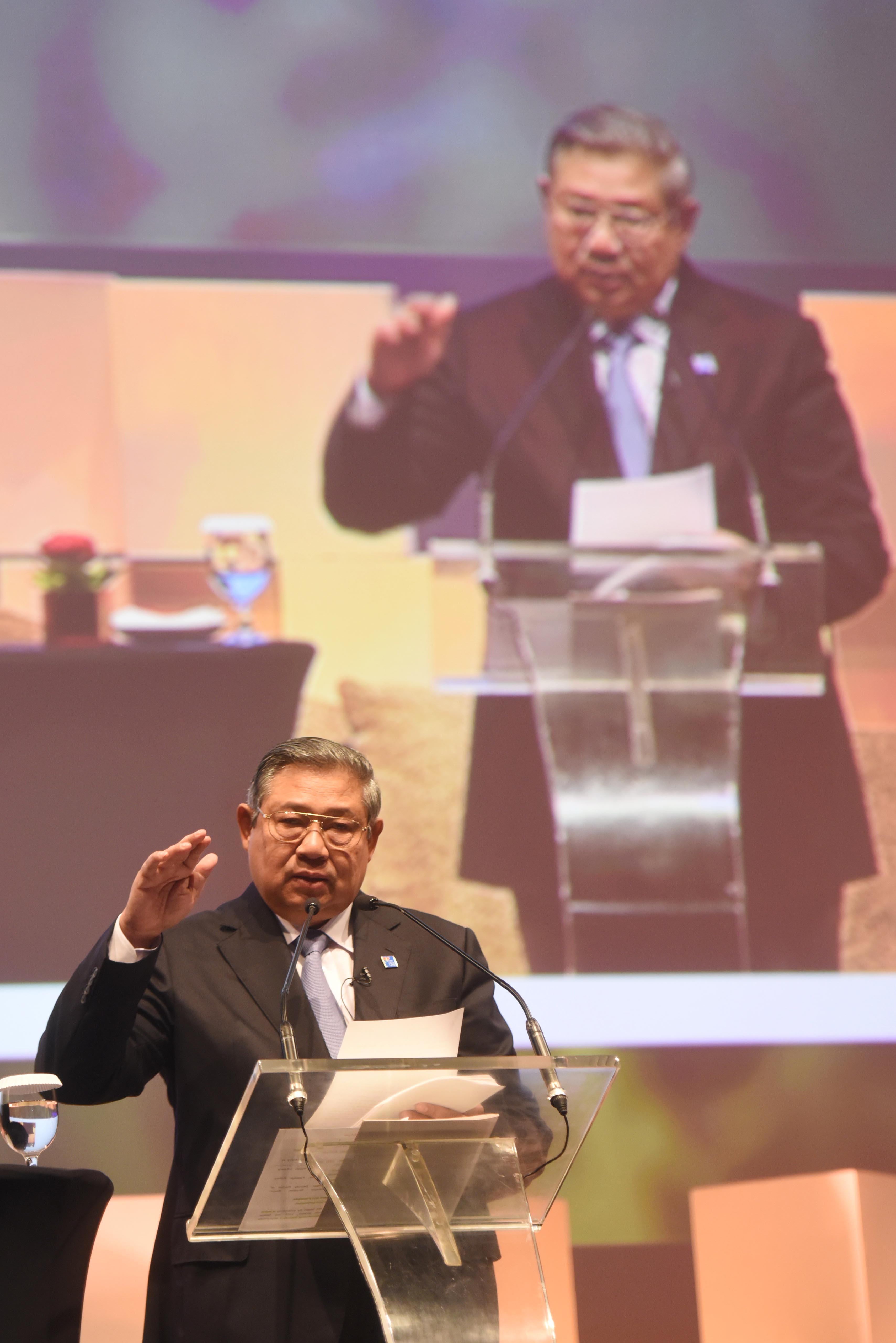 Presiden Keenam RI Susilo Bambang Yudhoyono memberikan pidato kunci dalam konferensi internasional 'In The Zone' di Jakarta, Sabtu (14/5). Konferensi yang mengangkat tema 'Feeding The Zone' itu membahas permasalahan dan tantangan sektor agrikultur di kawasan Indo-Pasifik khususnya dalam memenuhi kebutuhan konsumen ditengah melonjaknya populasi manusia ANTARA FOTO/Akbar Nugroho Gumay/ama/16