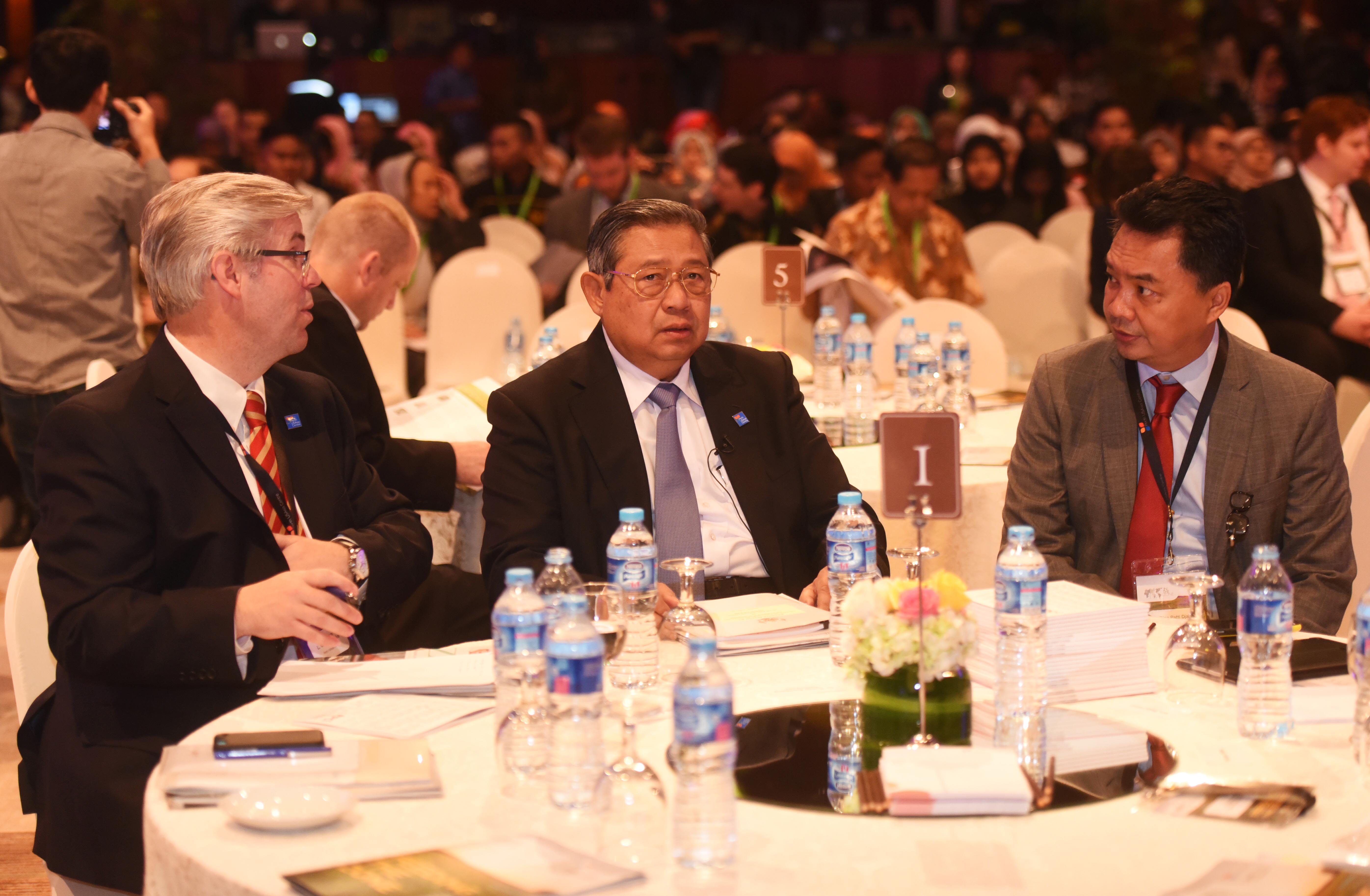 Presiden Keenam RI Susilo Bambang Yudhoyono (tengah) berbincang dengan CEO PerthUSAsia Gordon Flake (kiri) dan Pendiri FPCI Dino Patti Djalal disela konferensi internasional 'In The Zone' di Jakarta, Sabtu (14/5). Konferensi yang mengangkat tema 'Feeding The Zone' itu membahas permasalahan dan tantangan sektor agrikultur di kawasan Indo-Pasifik khususnya dalam memenuhi kebutuhan konsumen ditengah melonjaknya populasi manusia ANTARA FOTO/Akbar Nugroho Gumay/ama/16