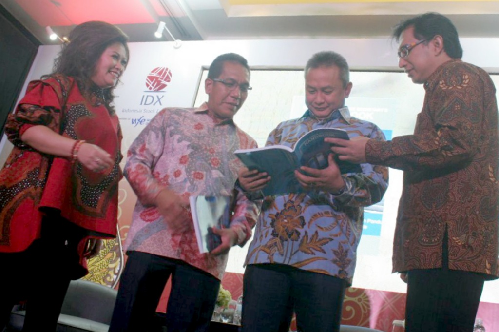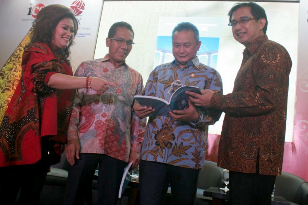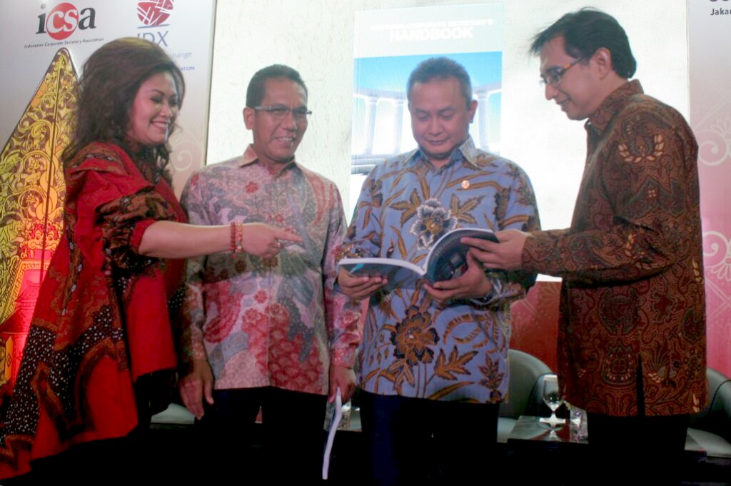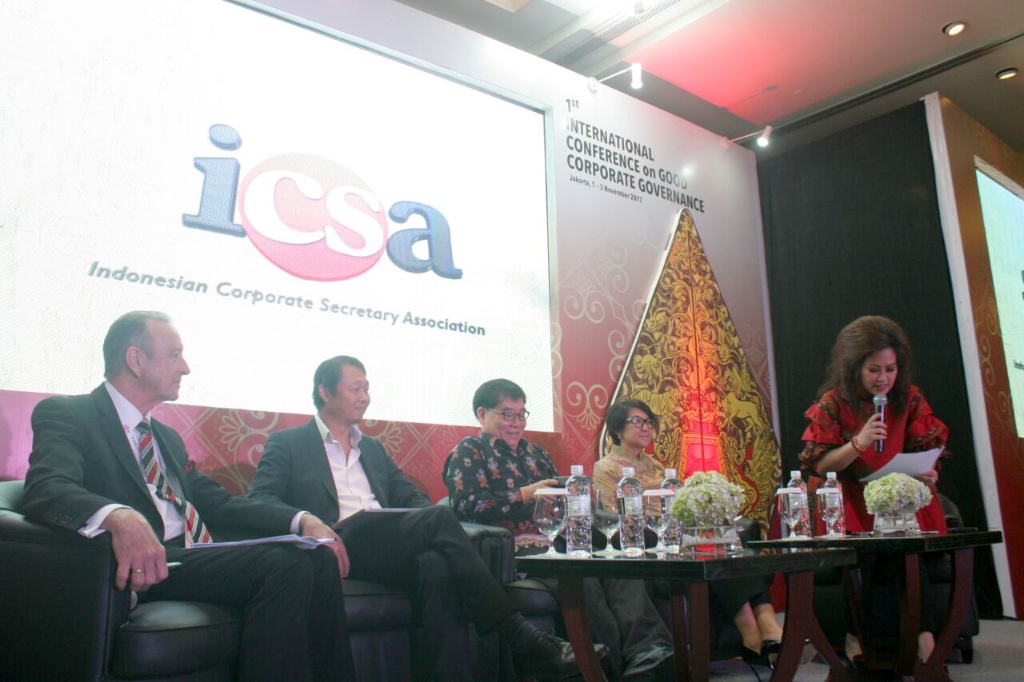 Dari kiri ke kanan, Ketua Good Corporate Governance Confrence (GCG) Katharine Grace, Direktur Bursa Efek Indonesia Samsul Hidayat, Komisioner Otoritas Jasa Keuangan (OJK) Hosean, Ketua Umum Asosiasi SKonfrensi GCG bertujuan meningkatkan profesionalisme dari Corporate Secretary di Indonesia dan untuk mendukung pengembangan good corporate governance melalui pengembangan pengetahuan dan keahlian, pertukaran informasi dan forum komunikasi di antara Corporate Secretary, pemerintah dan pemangku kepentingan lainnya. AKTUAL/Eko S Hilman