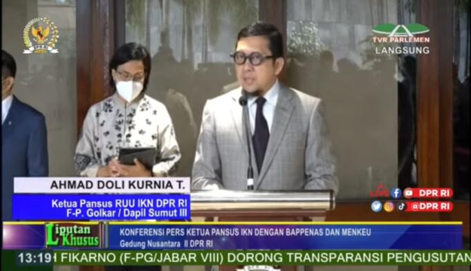 Screenshot Ketua Pansus Rancangan Undang-Undang Ibu Kota Negara (RUU IKN) Ahmad Doli Kurnia memberikan keterangan persnya pasca disahkannya UU Ibu Kota Negara baru di Gedung Parlemen Selasa 18 Januari 2022.