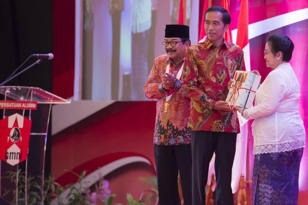 Presiden Joko Widodo (tengah) didampingi Ketua Umum PP Persatuan Alumni Gerakan Mahasiswa Nasional Indonesia (GMNI) Soekarwo (kiri) menerima buku berjudul Di Bawah Bendera Revolusi dari Ketua Umum PDI Perjuangan Megawati Sukarnoputri (kanan) pada Pembukaan Kongres III Persatuan Alumni GMNI di Arena Pekan Raya Jakarta, Kemayoran, Jakarta, Jumat (7/8). Kongres tersebut mengambil tema Jalan Trisakti Menuju Tatanan Masyarakat Pancasila. ANTARA FOTO/Widodo S. Jusuf/ama/15.