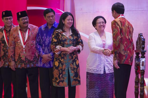 Presiden Joko Widodo (kanan) berjabat tangan dengan (kanan-kiri) Ketua Umum PDI Perjuangan Megawati Sukarnoputri, Menko Pembangunan Manusia dan Kebudayaan Puan Maharani, Menko Polhukam Tedjo Edhy Purdijatno, Ketua Umum PP Persatuan Alumni Gerakan Mahasiswa Nasional Indonesia (GMNI) Soekarwo dan Sekjen Ahmad Basarah usai membuka Kongres III Persatuan Alumni GMNI di Arena Pekan Raya Jakarta, Kemayoran, Jakarta, Jumat (7/8). Kongres tersebut mengambil tema Jalan Trisakti Menuju Tatanan Masyarakat Pancasila. ANTARA FOTO/Widodo S. Jusuf/ama/15.