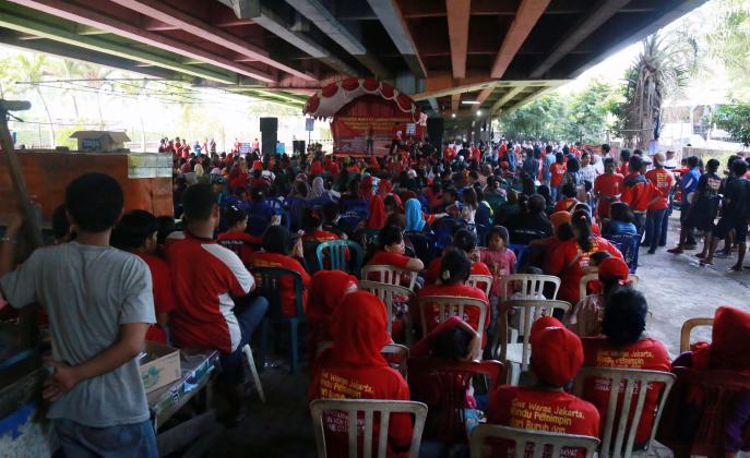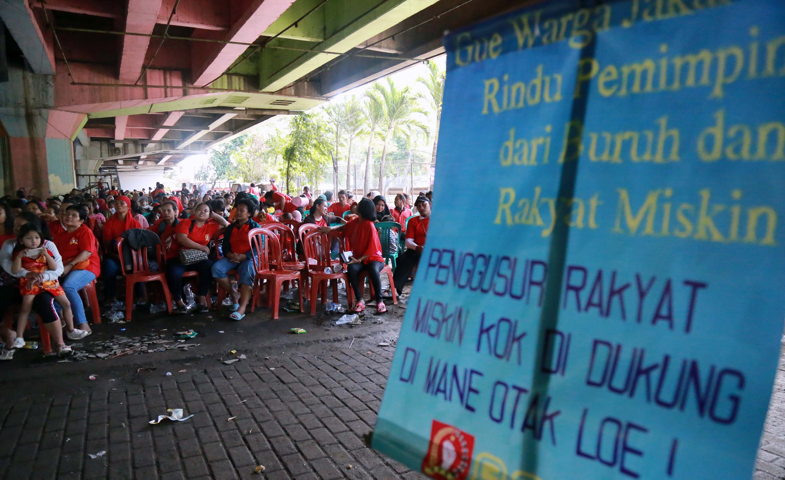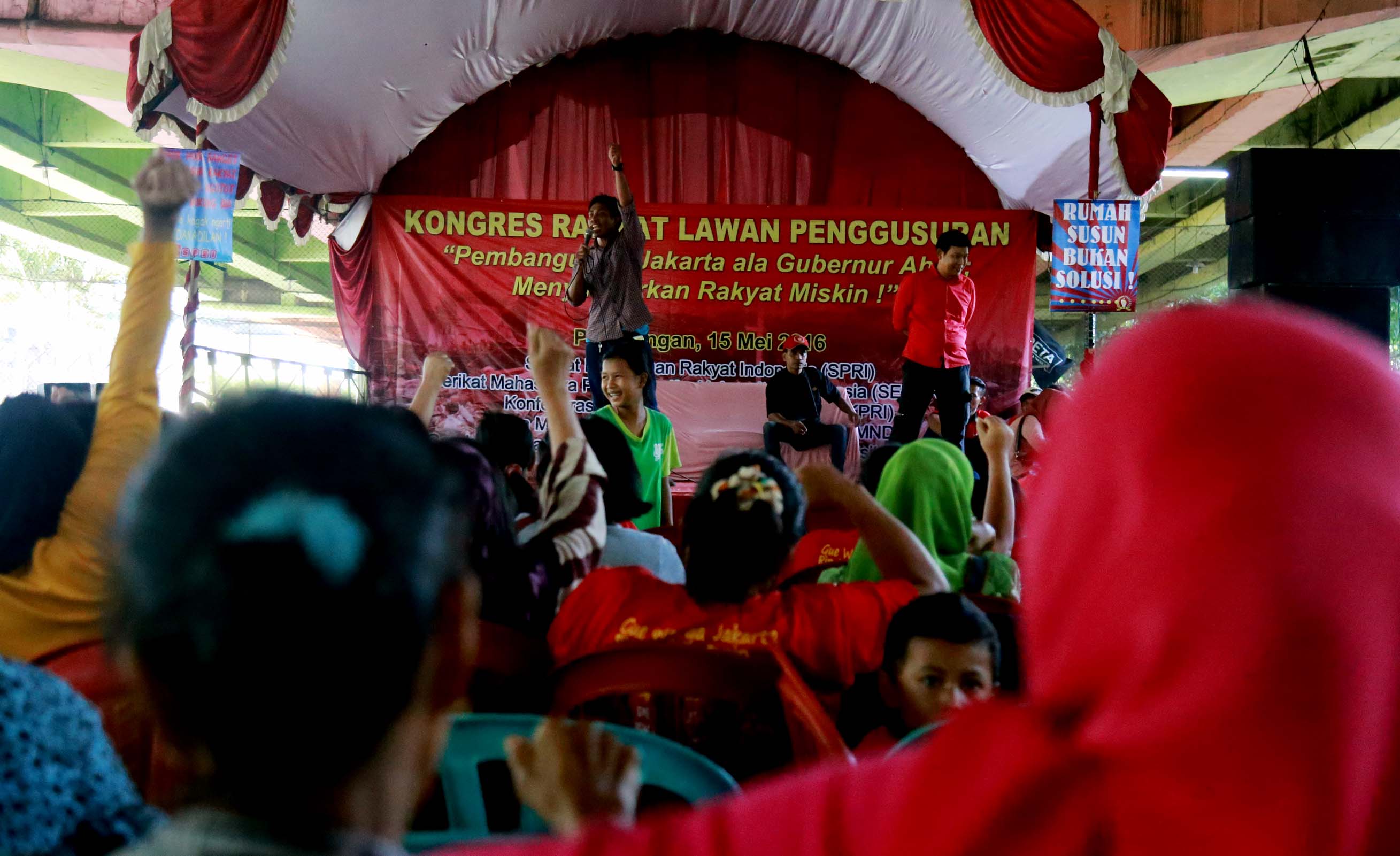 Ribuan warga korban pengggusuran perwakilan dari 33 Kelurahan se DKI Jakarta menghadiri acara Kongres Rakyat Lawan Penggusuran di bawah kolong tol Ir. Wiyoto Wiyono, Penjaraingan, Jakarta Utara, Minggu (15/5/2016). Dalam Kongres Rakyat Lawan Penggusuran suatu bentuk perlawanan masyarakat terhadap kebijakan Gubenur DKI Jakarta Basuki Tjahja Purnama (Ahok) yang terus menerus menindas kehidupan rakyat miskin.