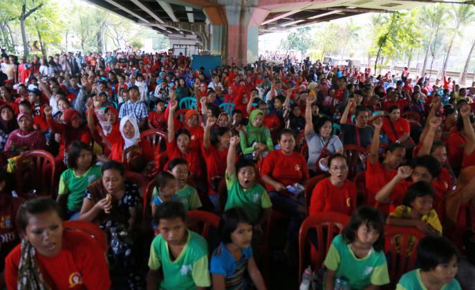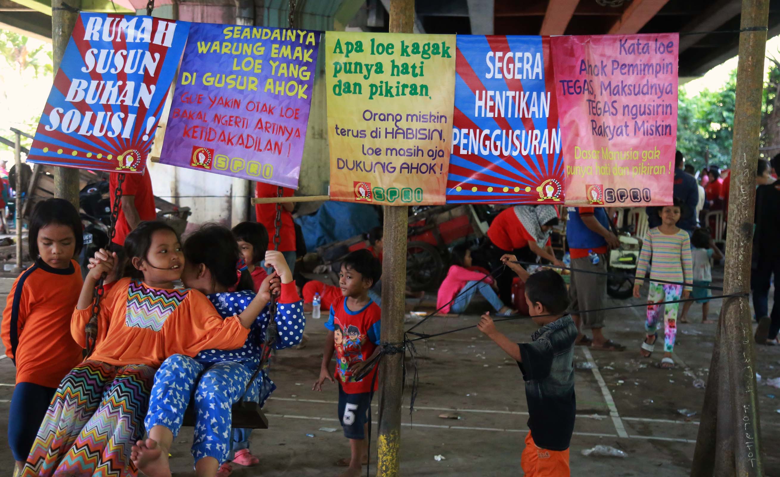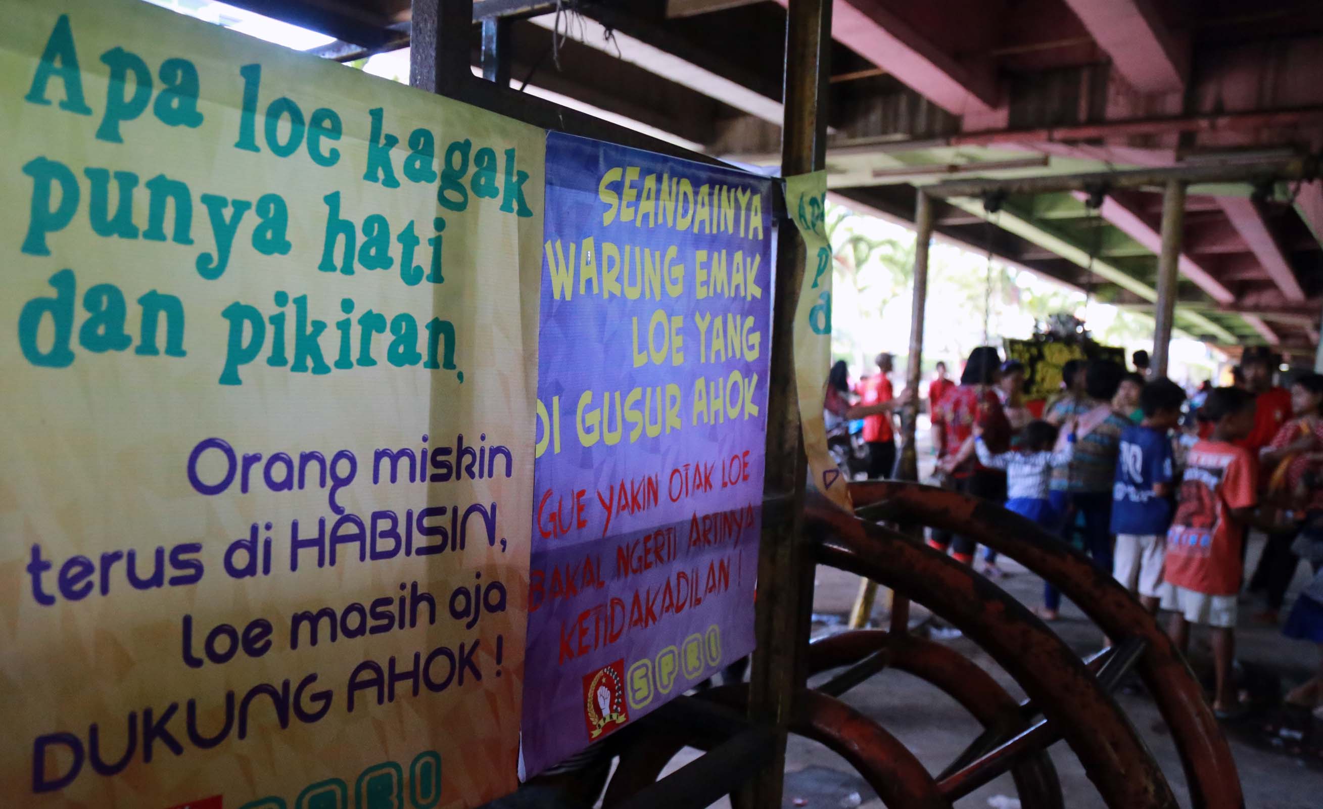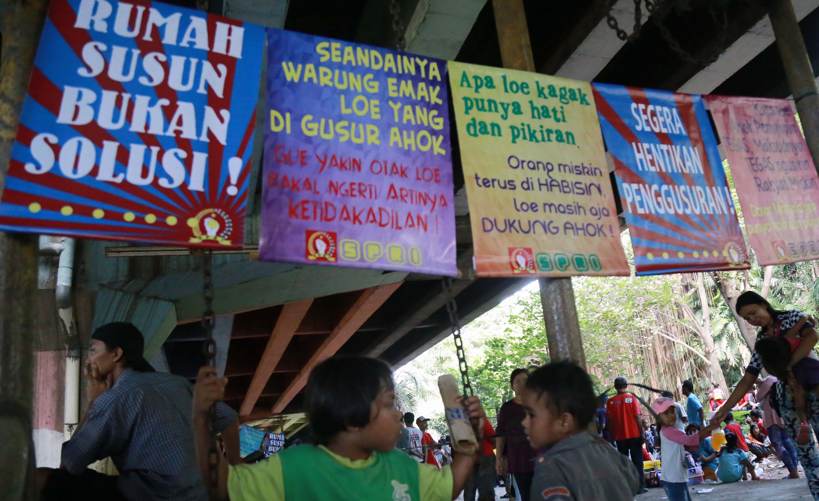 Ribuan warga korban pengggusuran perwakilan dari 33 Kelurahan se DKI Jakarta menghadiri acara Kongres Rakyat Lawan Penggusuran di bawah kolong tol Ir. Wiyoto Wiyono, Penjaraingan, Jakarta Utara, Minggu (15/5/2016). Dalam Kongres Rakyat Lawan Penggusuran suatu bentuk perlawanan masyarakat terhadap kebijakan Gubenur DKI Jakarta Basuki Tjahja Purnama (Ahok) yang terus menerus menindas kehidupan rakyat miskin.
