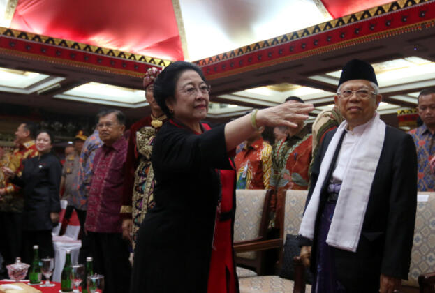 Presiden Joko Widodo (ketiga kanan) bersama Wakil Presiden Yusuf Kalla (ketiga kiri), Ketua Umum DPP PDIP Megawati Soekarnoputri (kedua kanan) dan Wakil Presiden terpilih Ma'ruf Amin (kanan) hadir pada pembukaan Kongres V PDIP di Sanur, Bali, Kamis (8/8/2019). Dalam Kongres V PDIP, Megawati Soekarnoputri mengingatkan pesan Bung Karno akan pentingnya menjaga keutuhan bangsa saat Pemilu. Sesuai pesan Bung Karno dalam amanatnya pada tanggal 17 Agustus 1954, menjelang Pemilu Pertama 1955. AKTUAL/HO-Maman Error